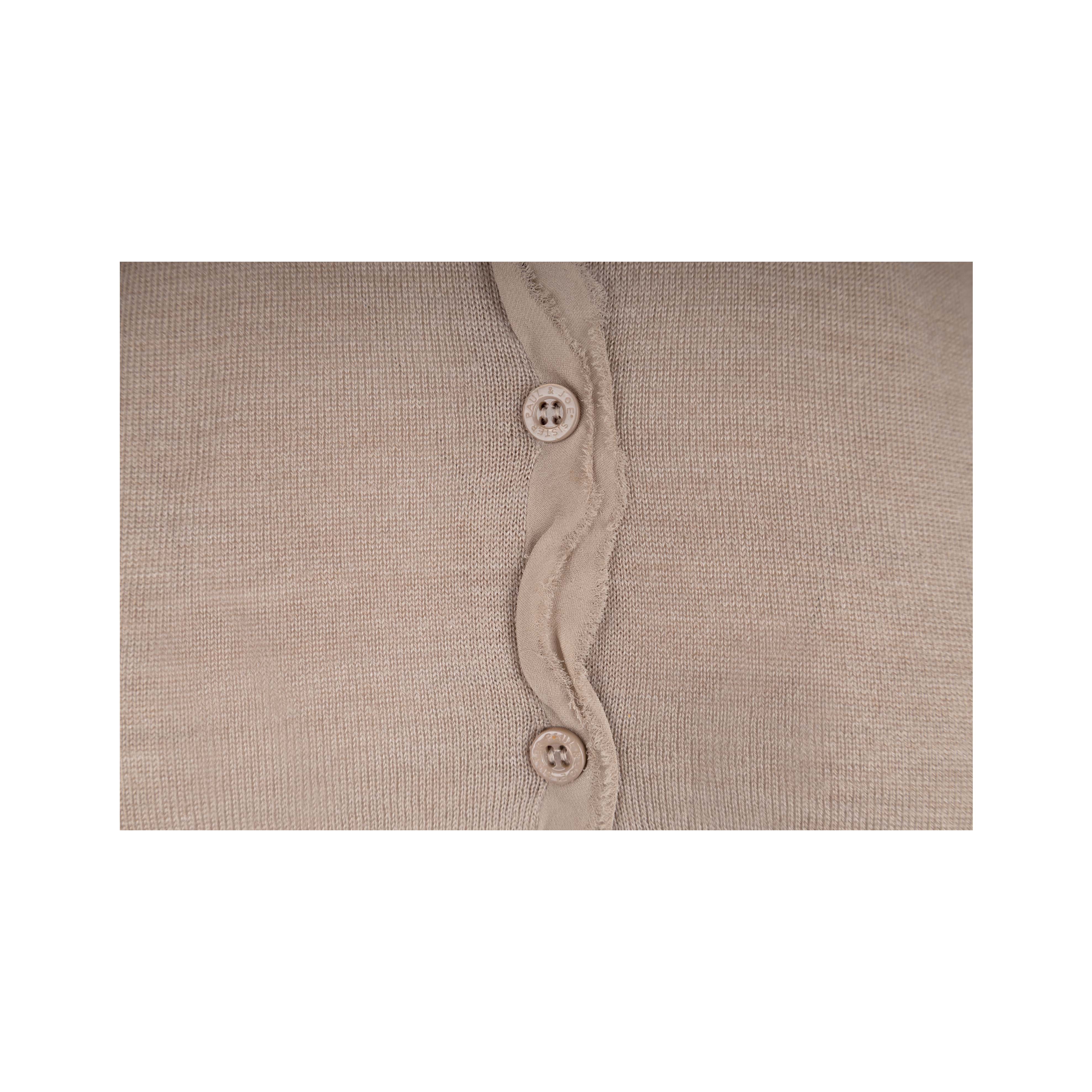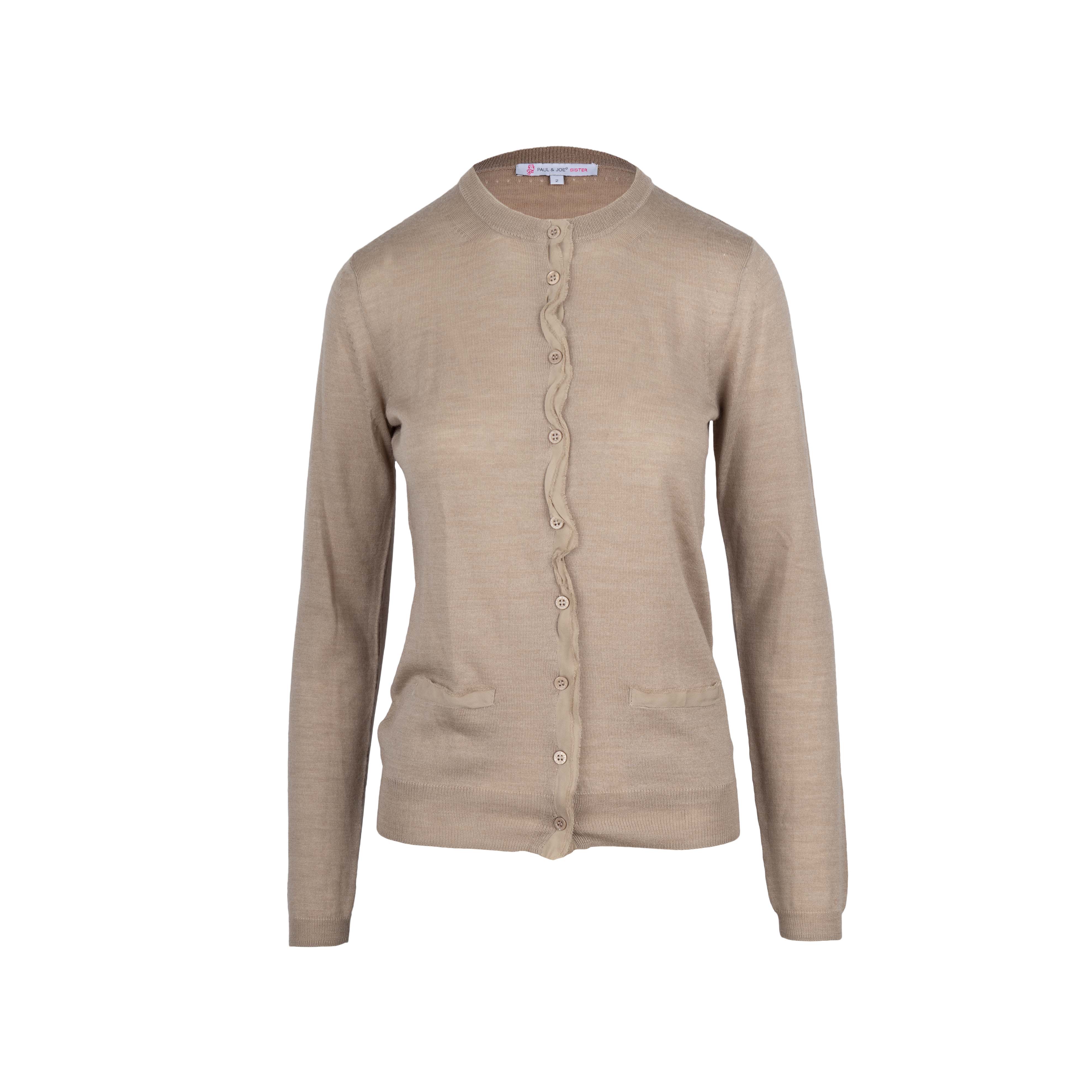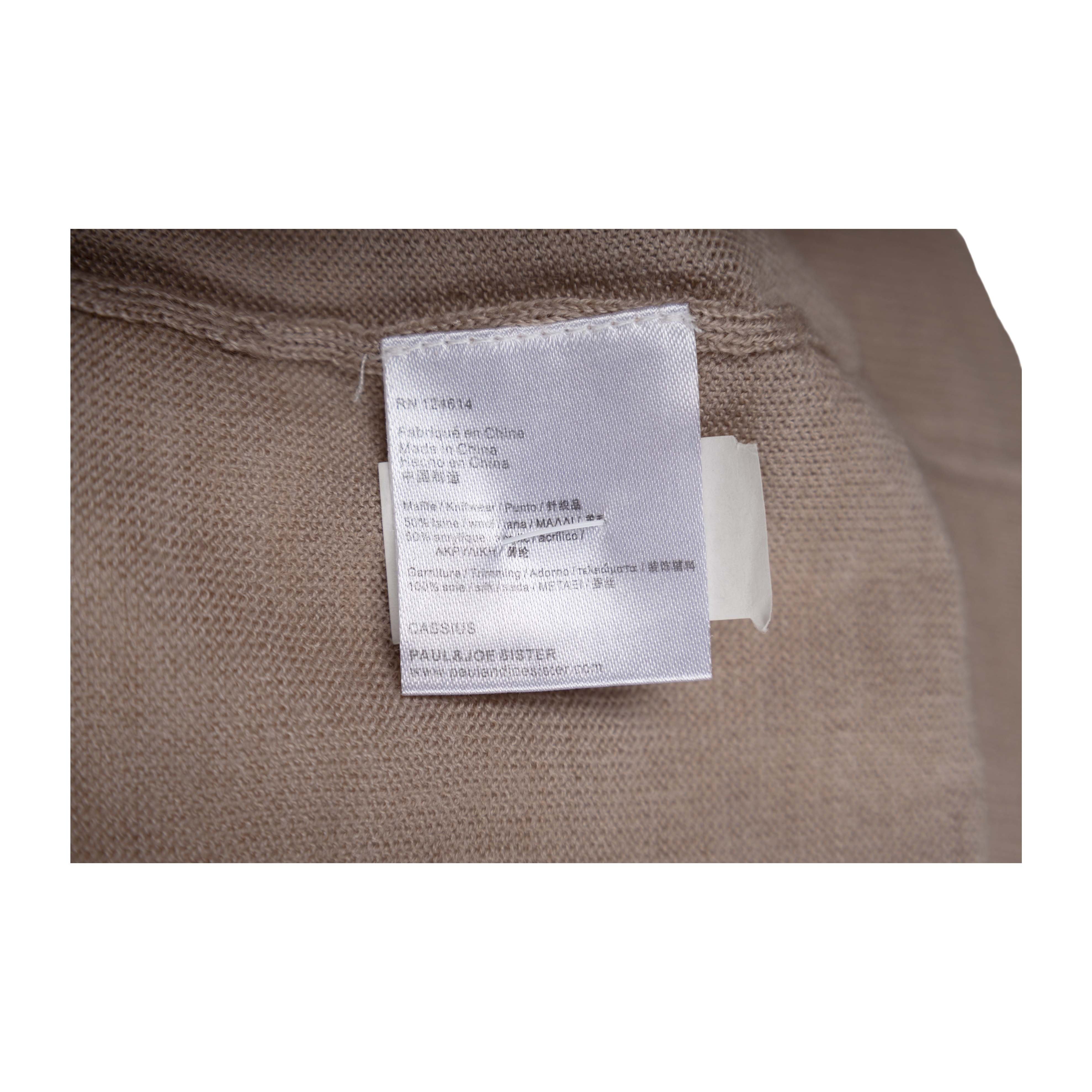 The Paul & Joe Siste Cardigan with Silk trimmings is a beige top that features a ribbed crew neck, hem, and cuffs. It is the perfect option for a relaxed and casual day because of its cozy fit.