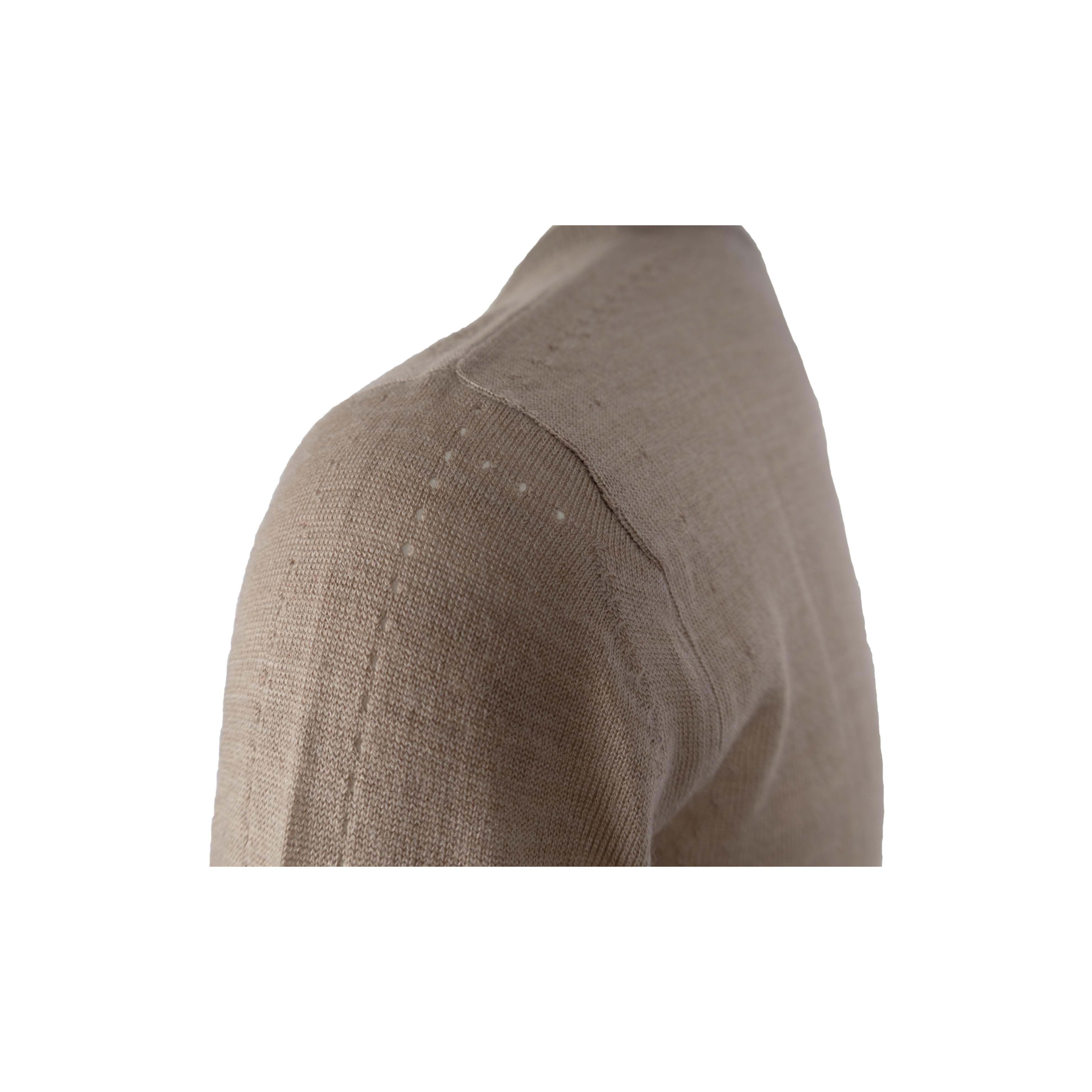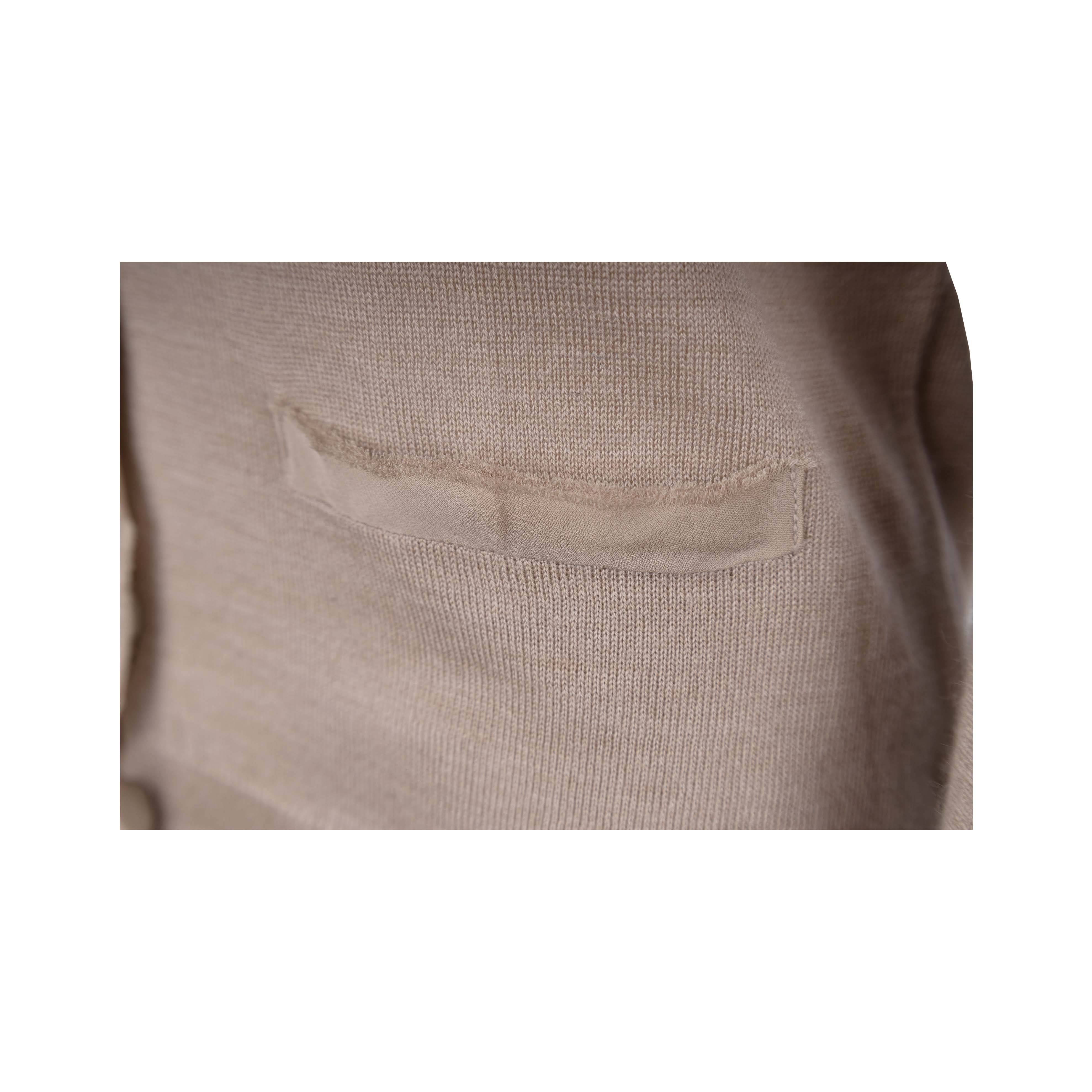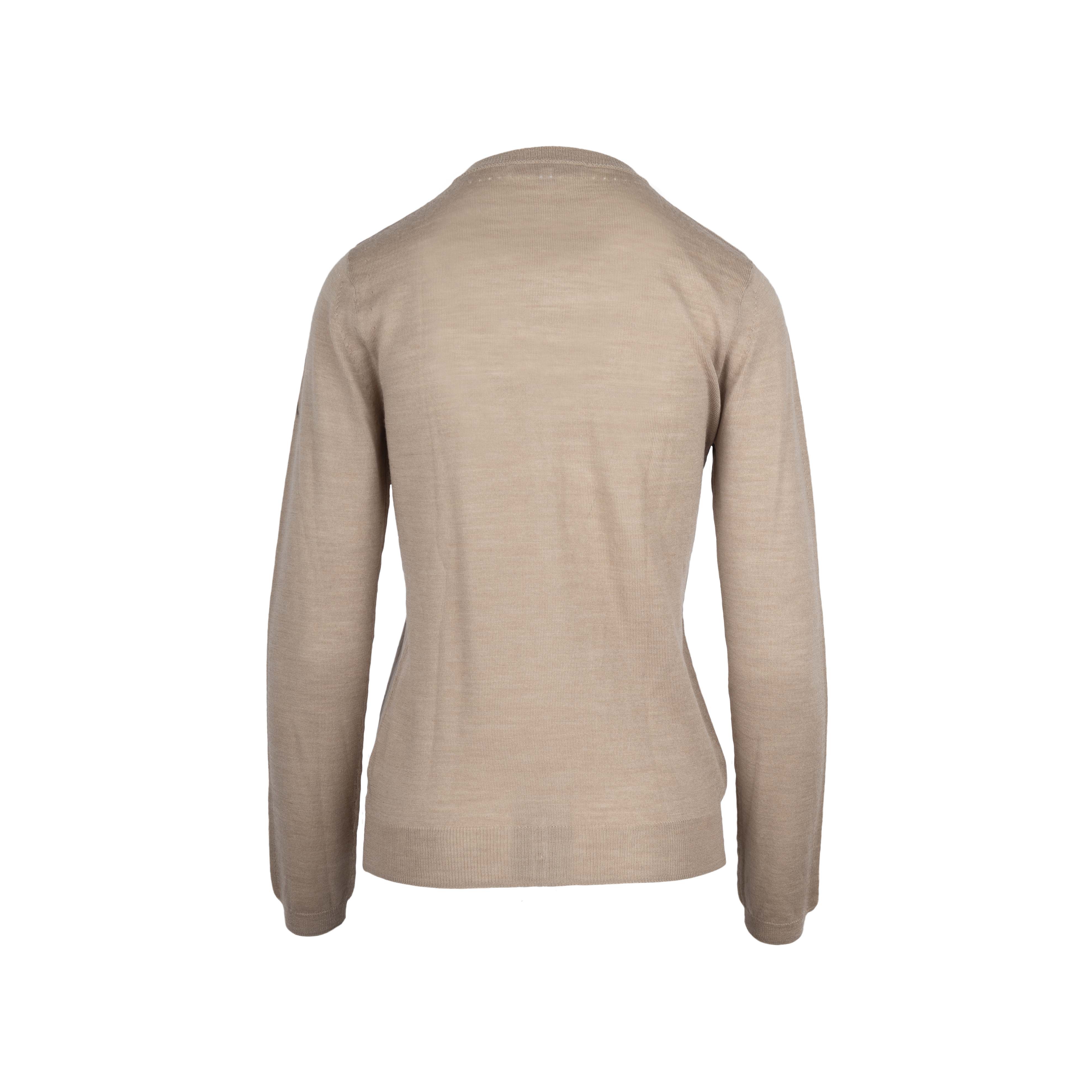 The Paul & Joe Siste Cardigan with Silk trimmings is a beige top that features a ribbed crew neck, hem, and cuffs. It is the perfect option for a relaxed and casual day because of its cozy fit.
