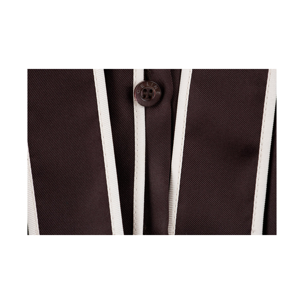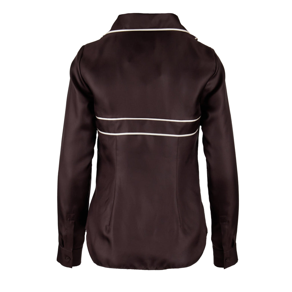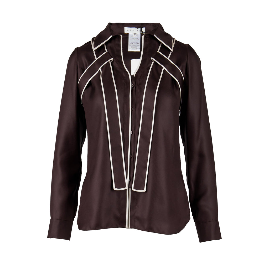 This Celine Contrast Top with Collar is the perfect professional piece for any wardrobe. Crafted with luxurious silk in dark chocolate brown, it features long sleeves, shirt-styled collar, and sleeve cuffs. A contrast piping and panels from the shoulder add to its sleek design. The perfect blend of sophistication and modern design.