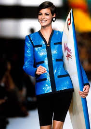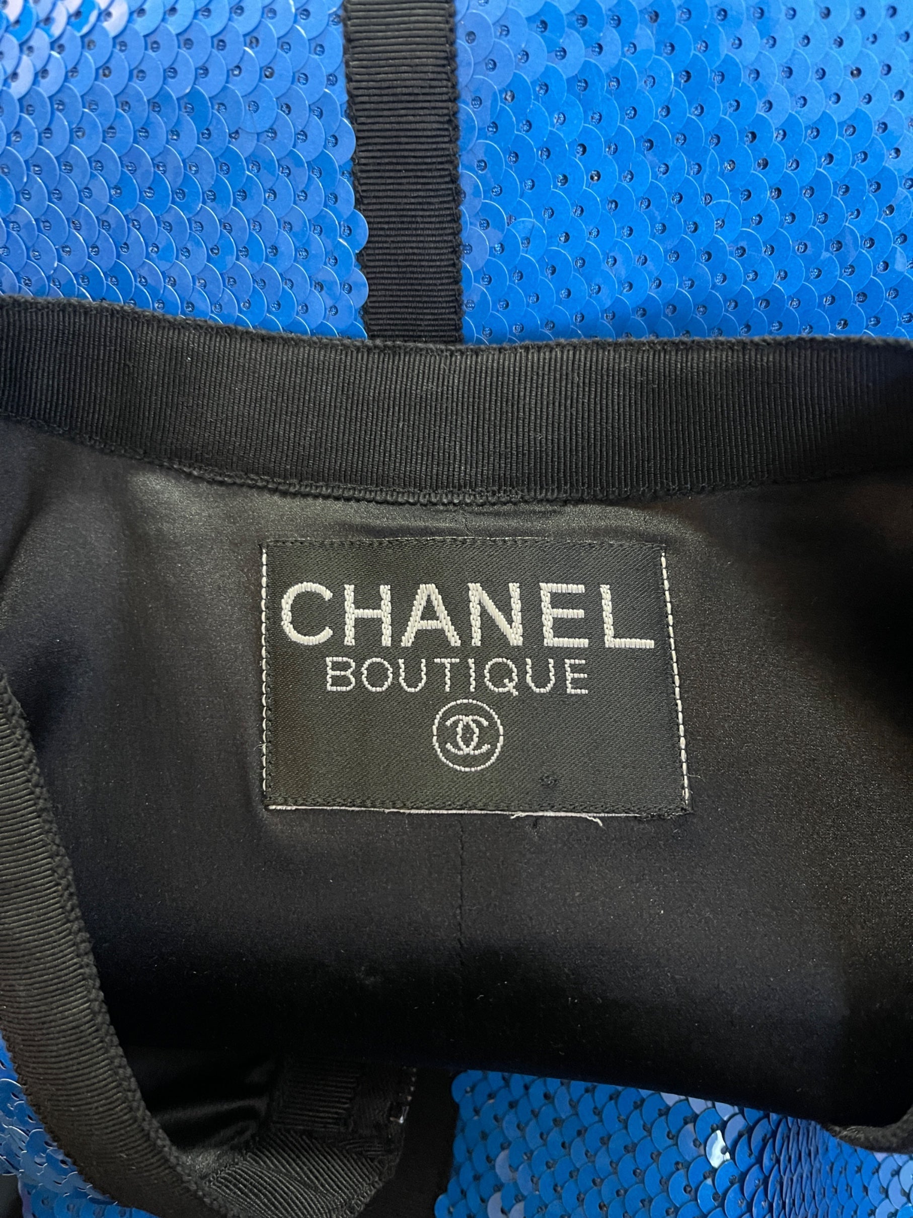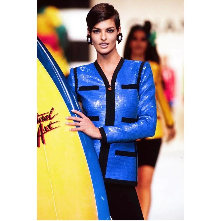 This iconic jacket was designed by Karl Lagerfeld for Chanel as part of the Spring 1991 collection. It was worn by supermodel Linda Evangelista as she carried a surfboard down the runway and featured in the campaign for that season on Christy Turlington and Linda Evangelista. It was also featured on the January 1991 cover of American Vogue. This jacket is one of the most recognisable pieces in Chanel’s history - a true piece of trophy vintage. Tailored from black silk satin, it is adorned all-over in electric blue sequins that create a shimmering scale-like skin. Taking silhouette inspiration from the zip-up front of wetsuits, it has a black tonal zip which closes the front with a circular gold-tone zip-pull finished with the brand’s double-C logo. The jacket is detailed with black grosgrain ribbon down the front, around the collar, atop four-faux pockets and trimming each of the split cuffs. The jacket is lined with black silk-satin.