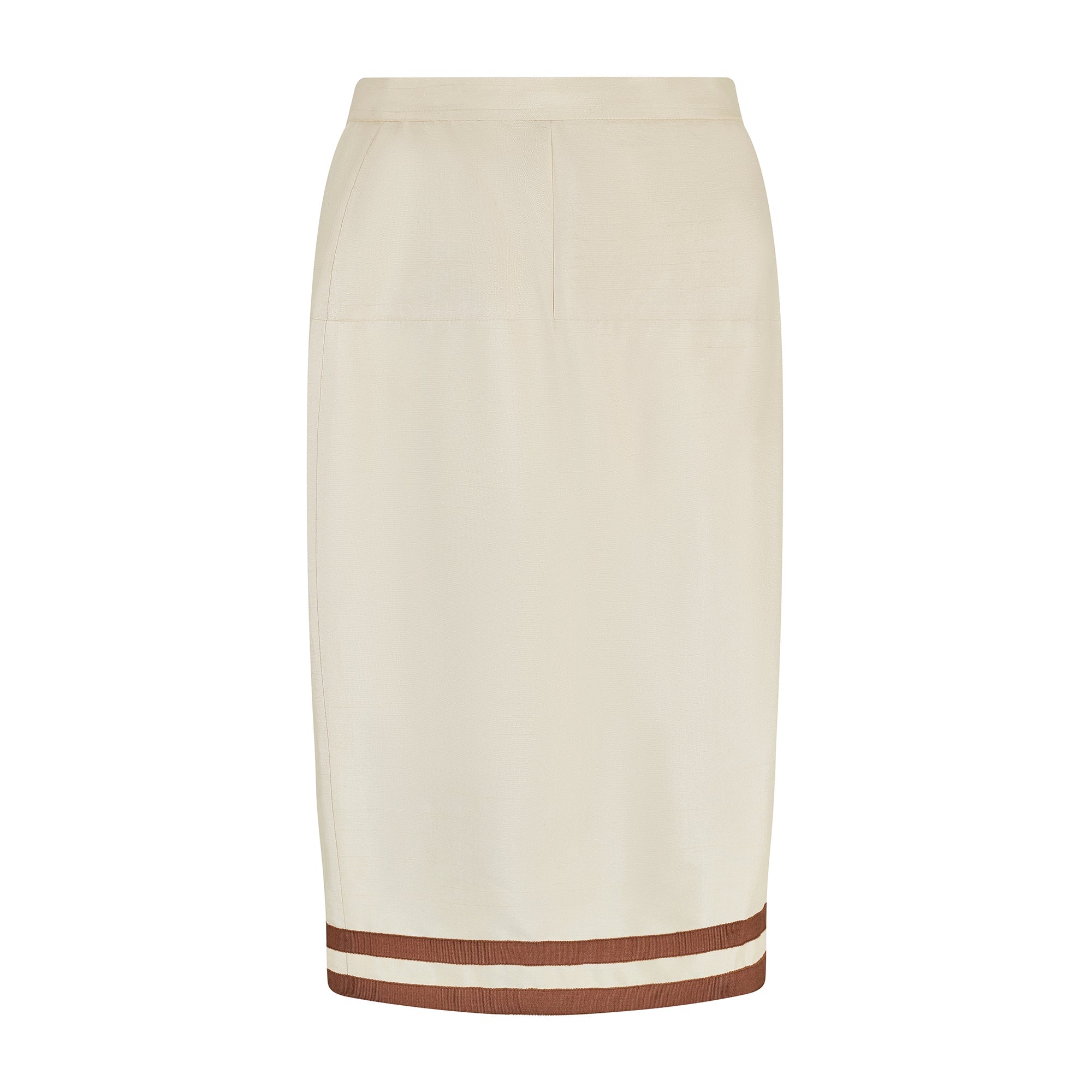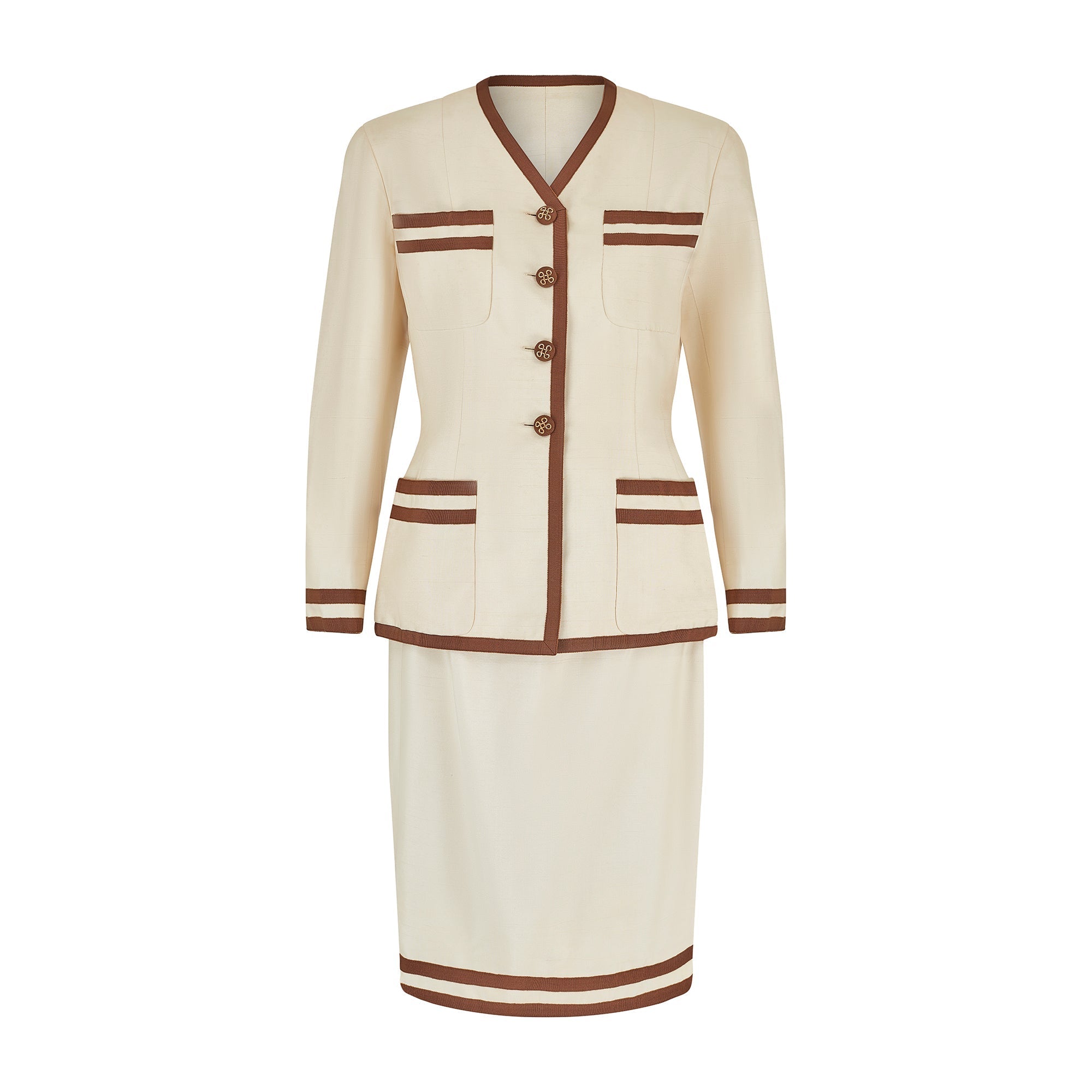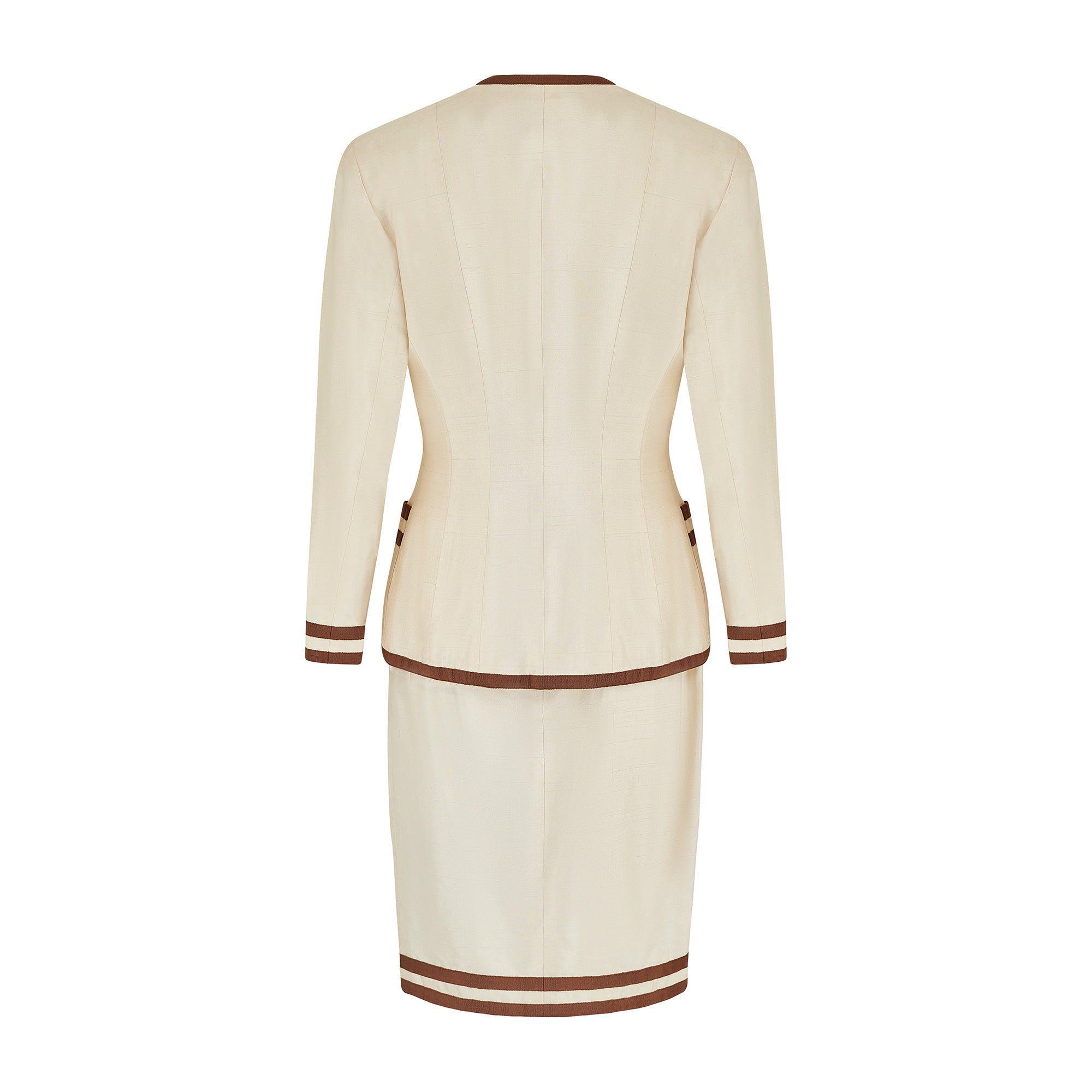 This documented vintage Chanel cream silk suit was designed by Karl Lagerfeld and the design, in black and white, walked the runway for the spring summer 1991 collection. Tailored from cream shot silk and detailed with brown grosgrain trim, it perfectly exemplifies the casual chic synonymous with this classic and celebrated brand. The 100% raw silk outer of the jacket is a warm soft cream tone, and showcases the natural texture of the fabric beautifully. The rich chocolate brown grosgrain that features on the V neck collar, hem and buttons complements in both texture and colour, with double trim on the cuffs and four front pockets to serve as a simple yet artful embellishment. The antique style buttons at the front are covered in the same grosgrain fabric, and are adorned with a striking gold metal knot design. Both pieces are elegantly fitted and fully lined in silk embossed with the iconic CC motif. The skirt is neatly tailored around the waist and hips, and is a classic straight cut with a double trim to echo the jacket, which rests playfully on the knee.