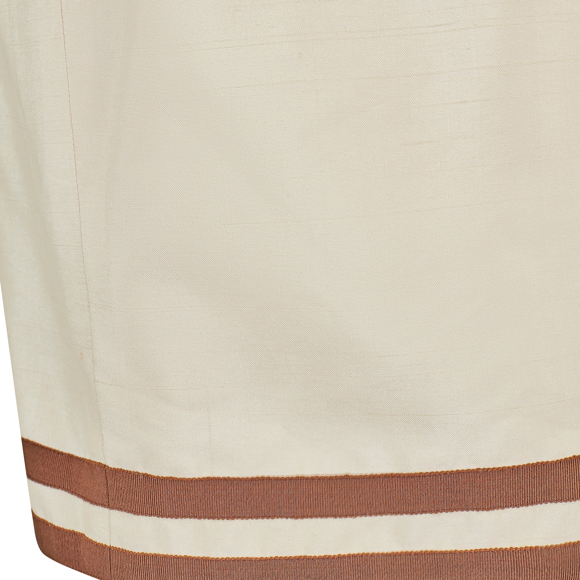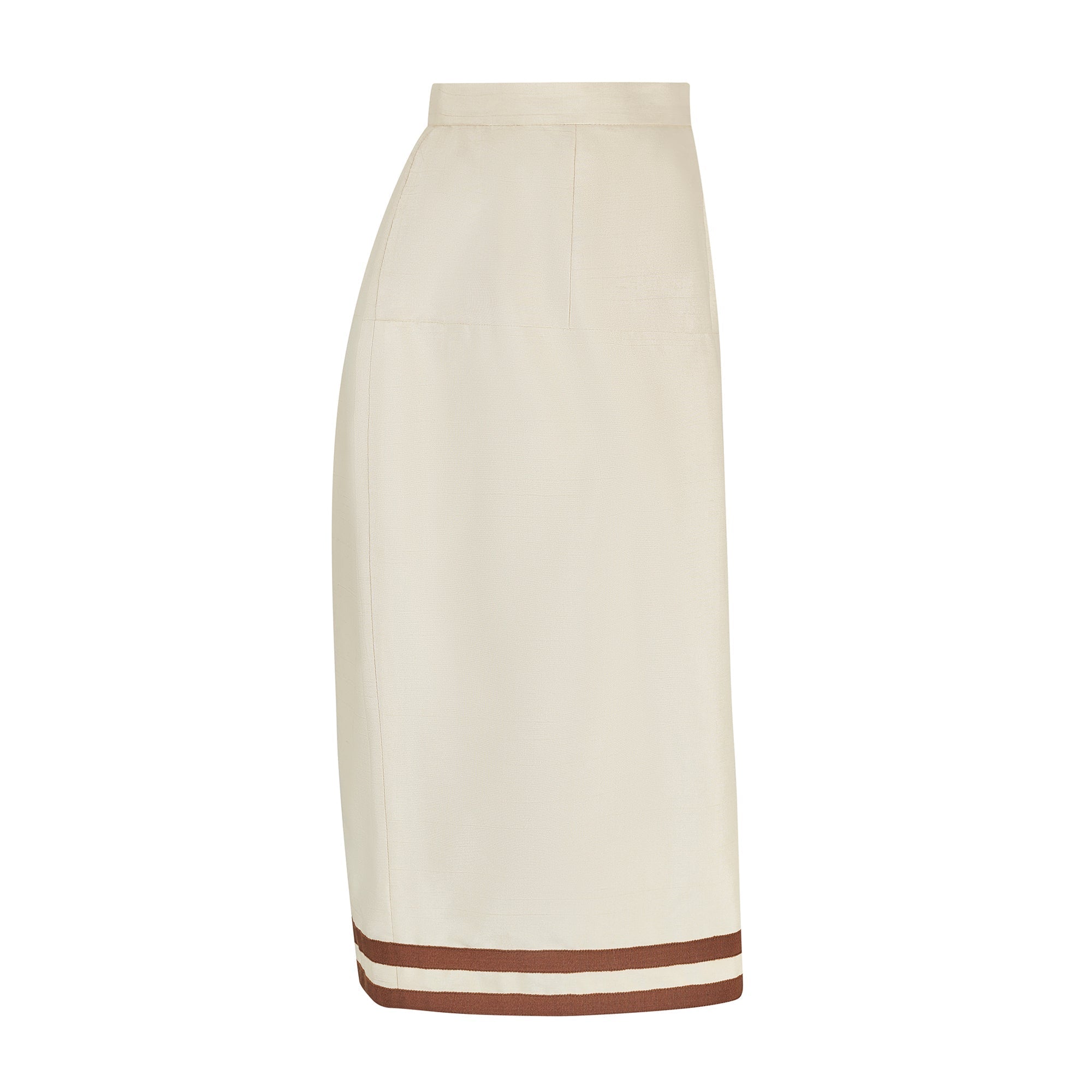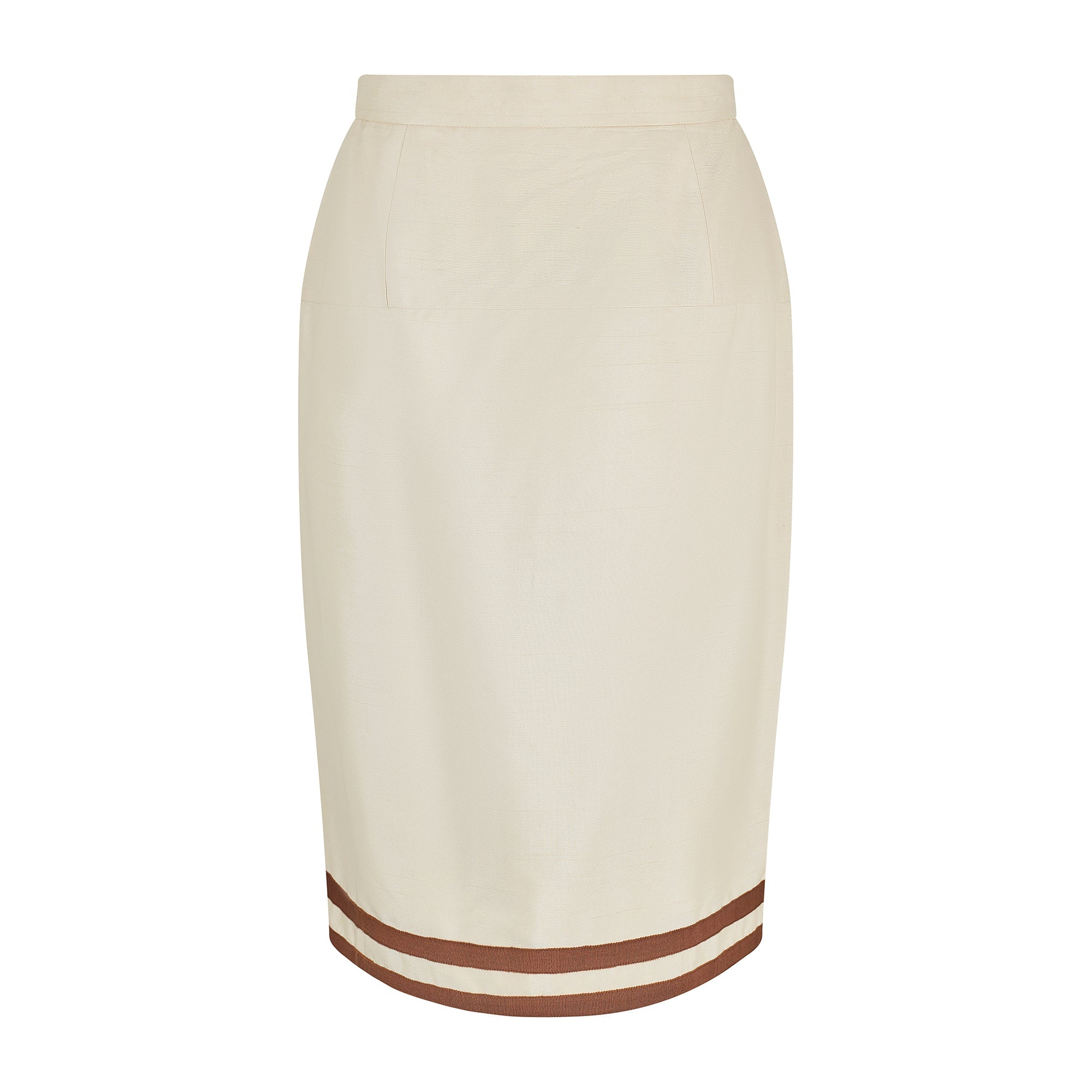 This documented vintage Chanel cream silk suit was designed by Karl Lagerfeld and the design, in black and white, walked the runway for the spring summer 1991 collection. Tailored from cream shot silk and detailed with brown grosgrain trim, it perfectly exemplifies the casual chic synonymous with this classic and celebrated brand. The 100% raw silk outer of the jacket is a warm soft cream tone, and showcases the natural texture of the fabric beautifully. The rich chocolate brown grosgrain that features on the V neck collar, hem and buttons complements in both texture and colour, with double trim on the cuffs and four front pockets to serve as a simple yet artful embellishment. The antique style buttons at the front are covered in the same grosgrain fabric, and are adorned with a striking gold metal knot design. Both pieces are elegantly fitted and fully lined in silk embossed with the iconic CC motif. The skirt is neatly tailored around the waist and hips, and is a classic straight cut with a double trim to echo the jacket, which rests playfully on the knee.