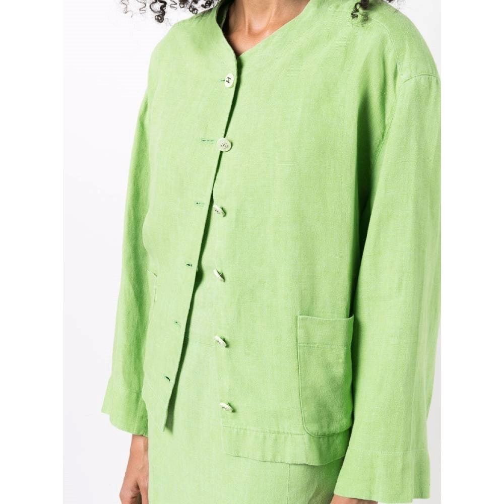 Chanel 90s apple green linen jacket and dress suit. Crewneck jacket, long sleeves, lightly padded shoulders, front buttons fastening and two patch pockets. Knee-length sleeveless dress, straight-cut, slighlty V-neck, rear zip fastening and two buttoned patch pockets on the chest.