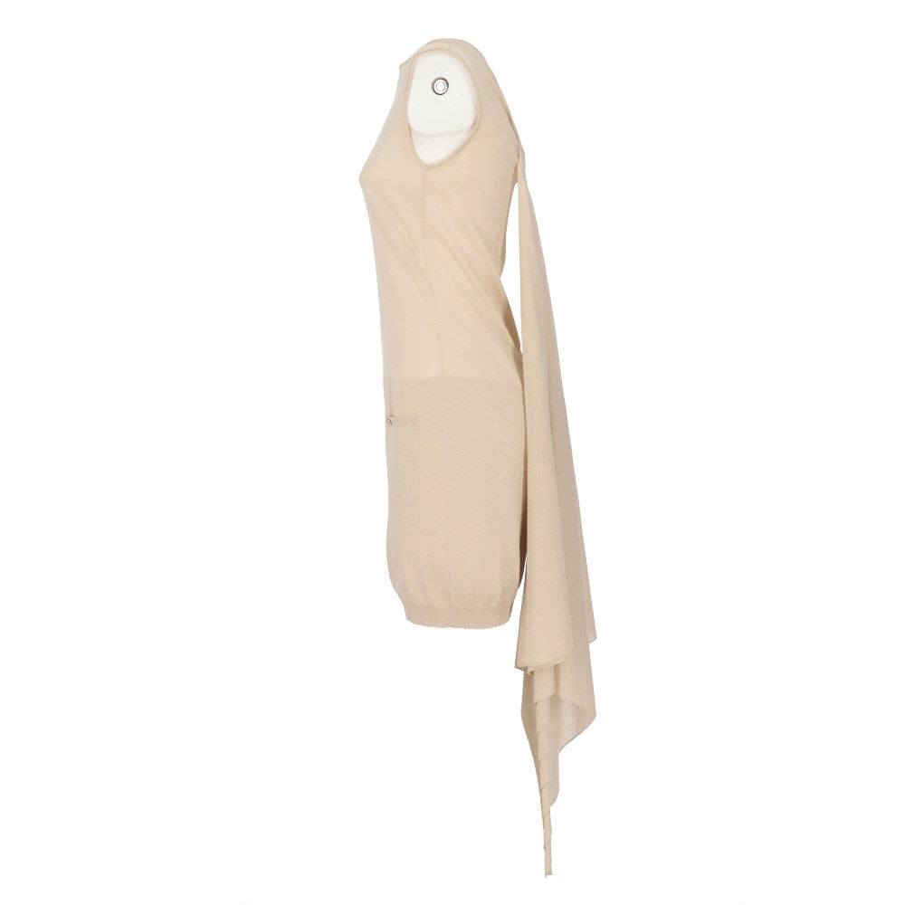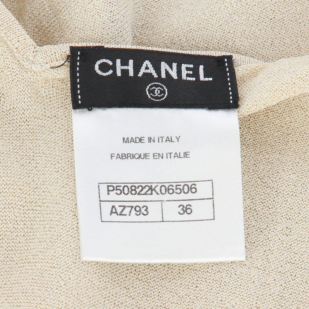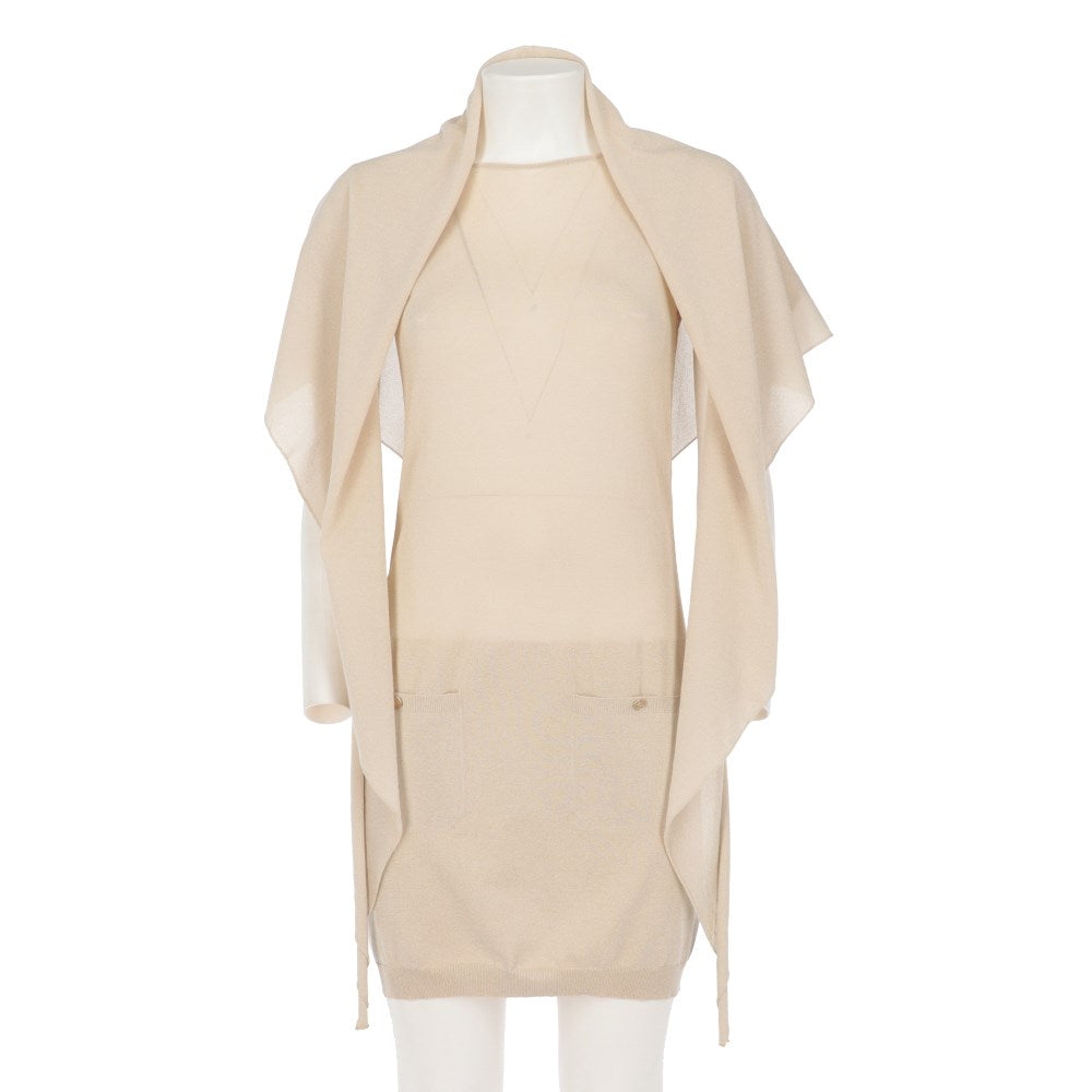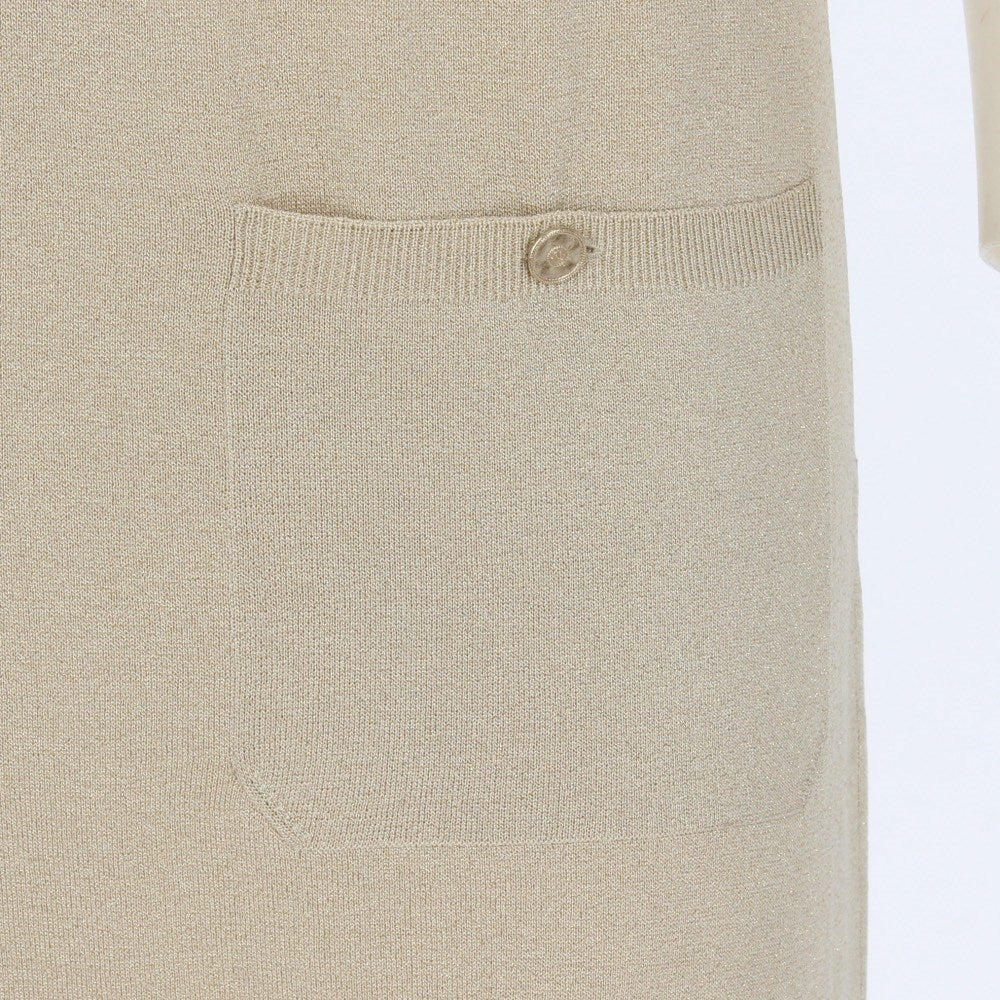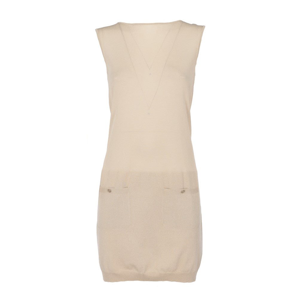 Chanel ivory viscose lurex sleeveless midi 2000s dress with two patch pockets with logoed buttons and shawl applied on the back. Year: 2010 - The item shows a pulled thread, as shown in the pictures.