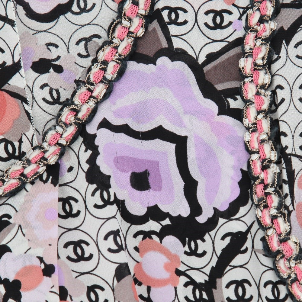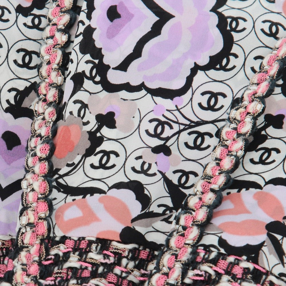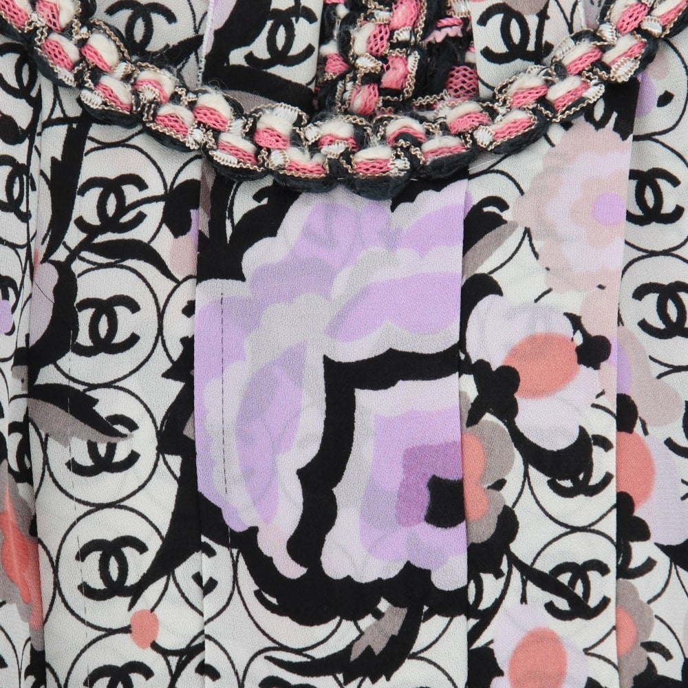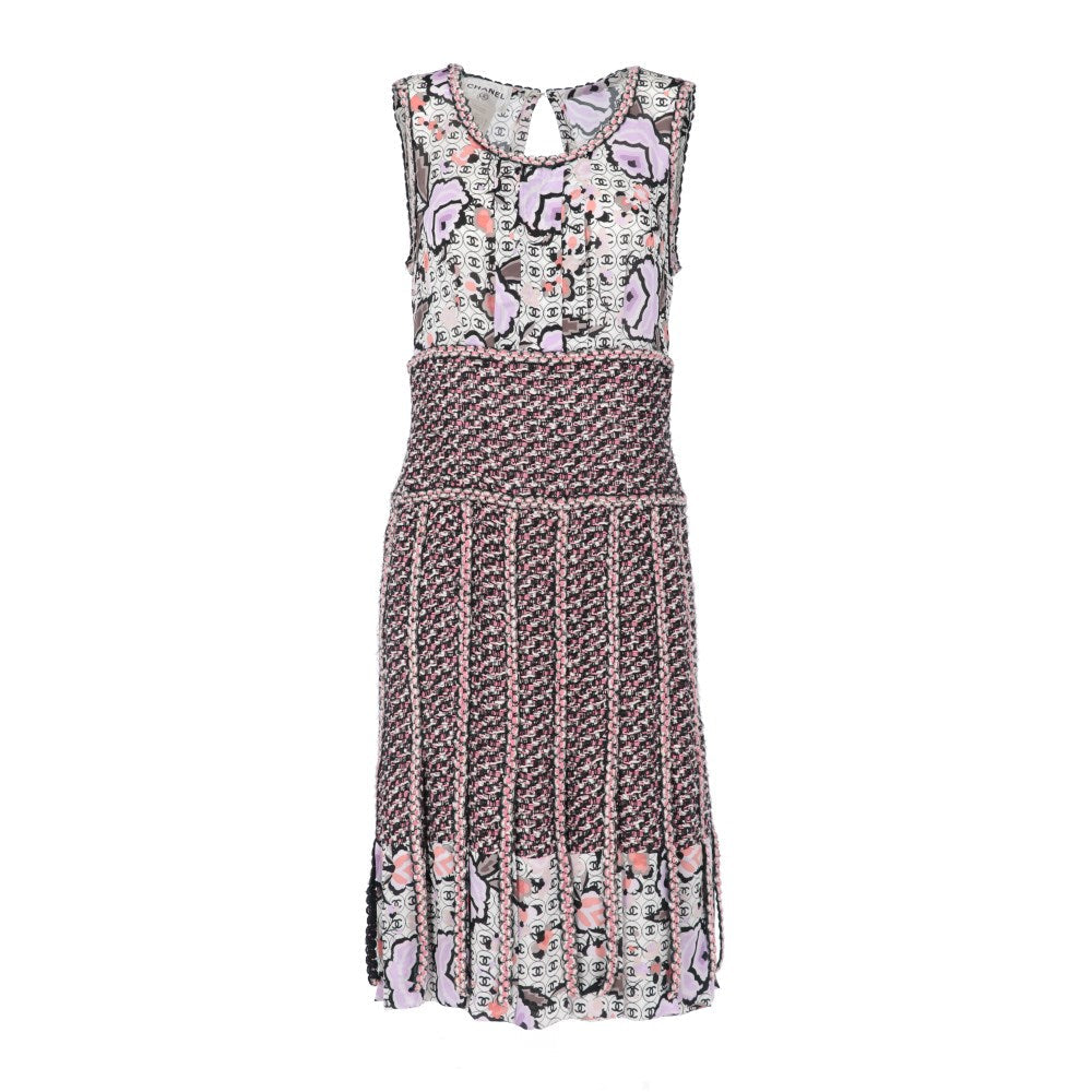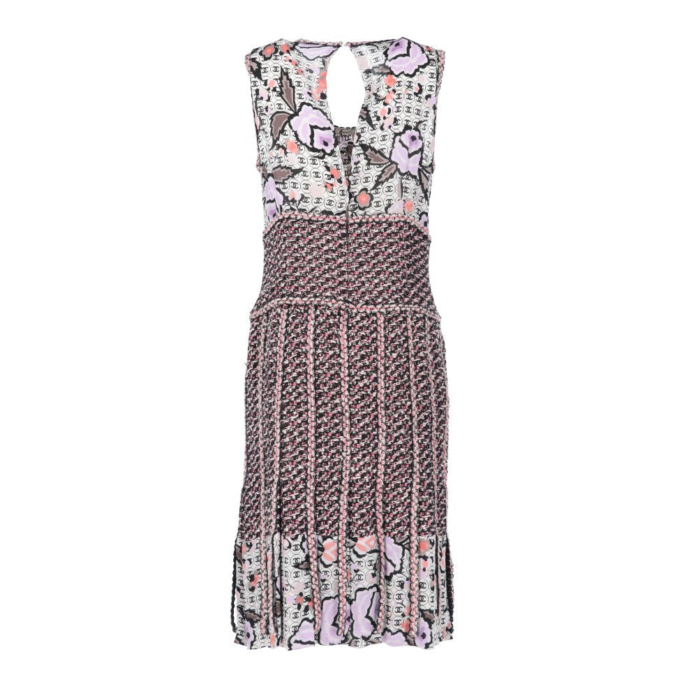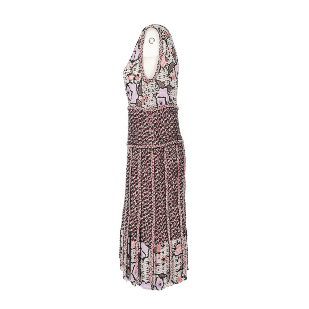 Chanel multicolor cotton blend 2004 sleeveless dress with logos print. Round neckline, silk top and mixed knitted skirt with pleats, fringes and silk bottom. Rear neck hook, open back and rear zip fastening along the skirt. The item shows some scratches, as shown in the pictures.