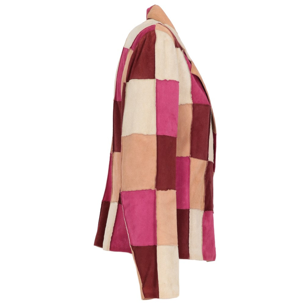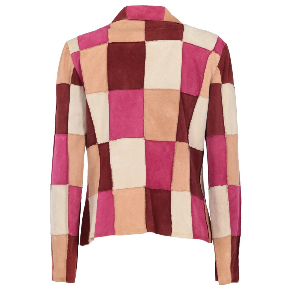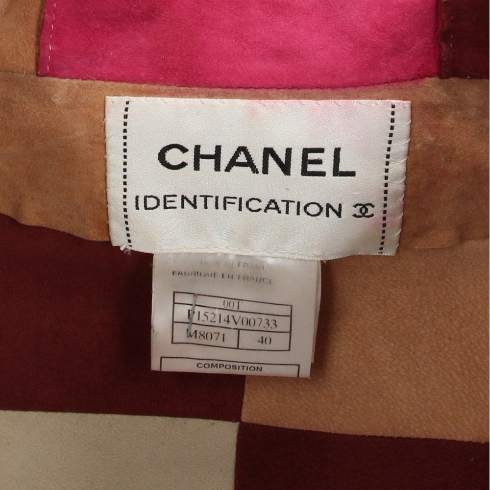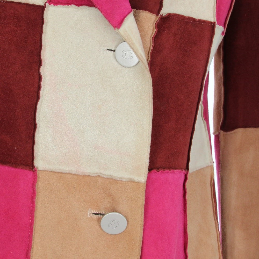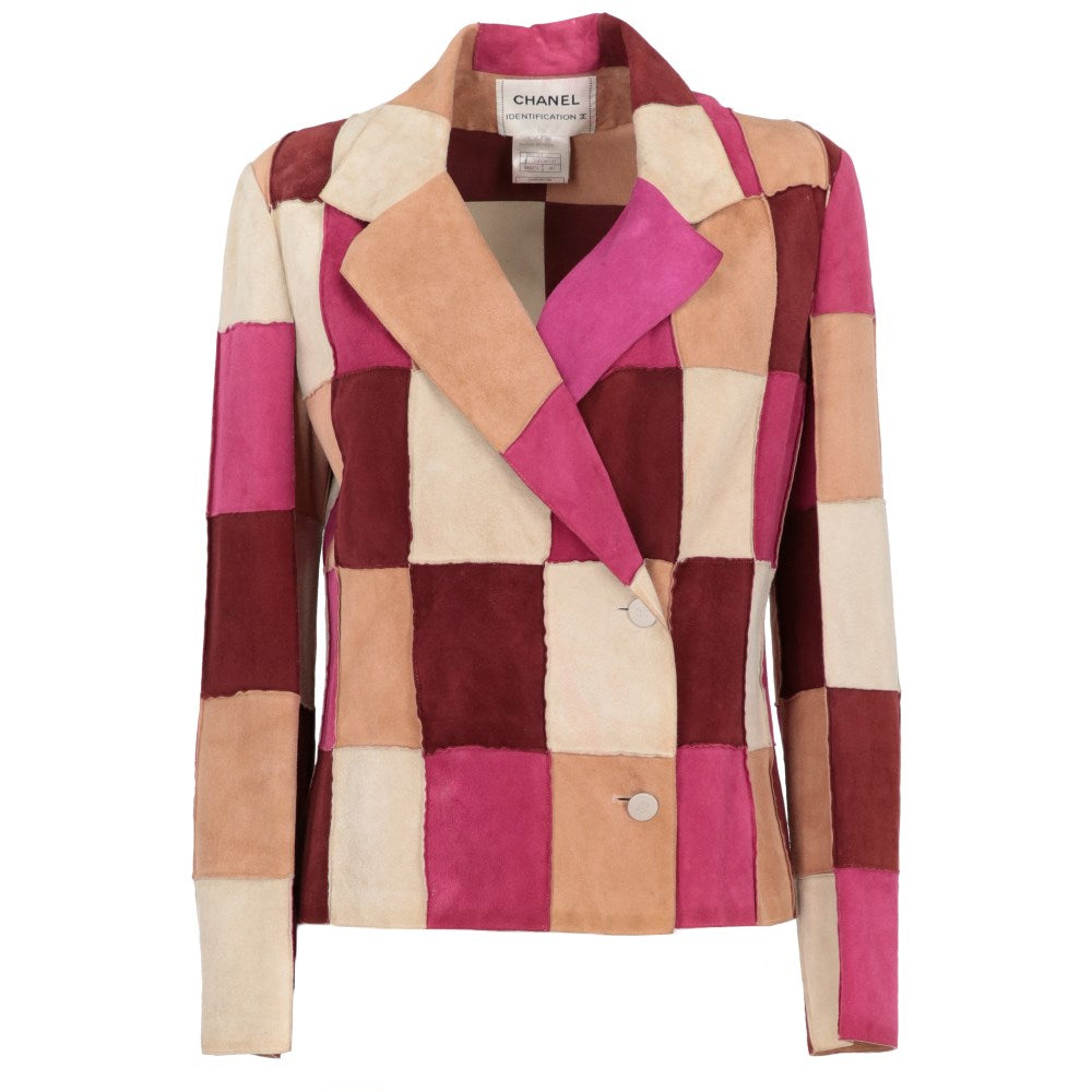 Chanel 2000s suede goat skin jacket with multicolor square pattern. Lapel collar, double-breasted closure with logoed buttons. The item shows small stains, as shown in the pictures.
