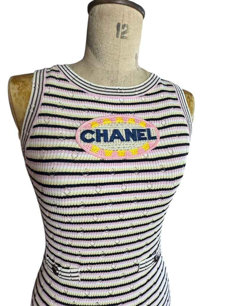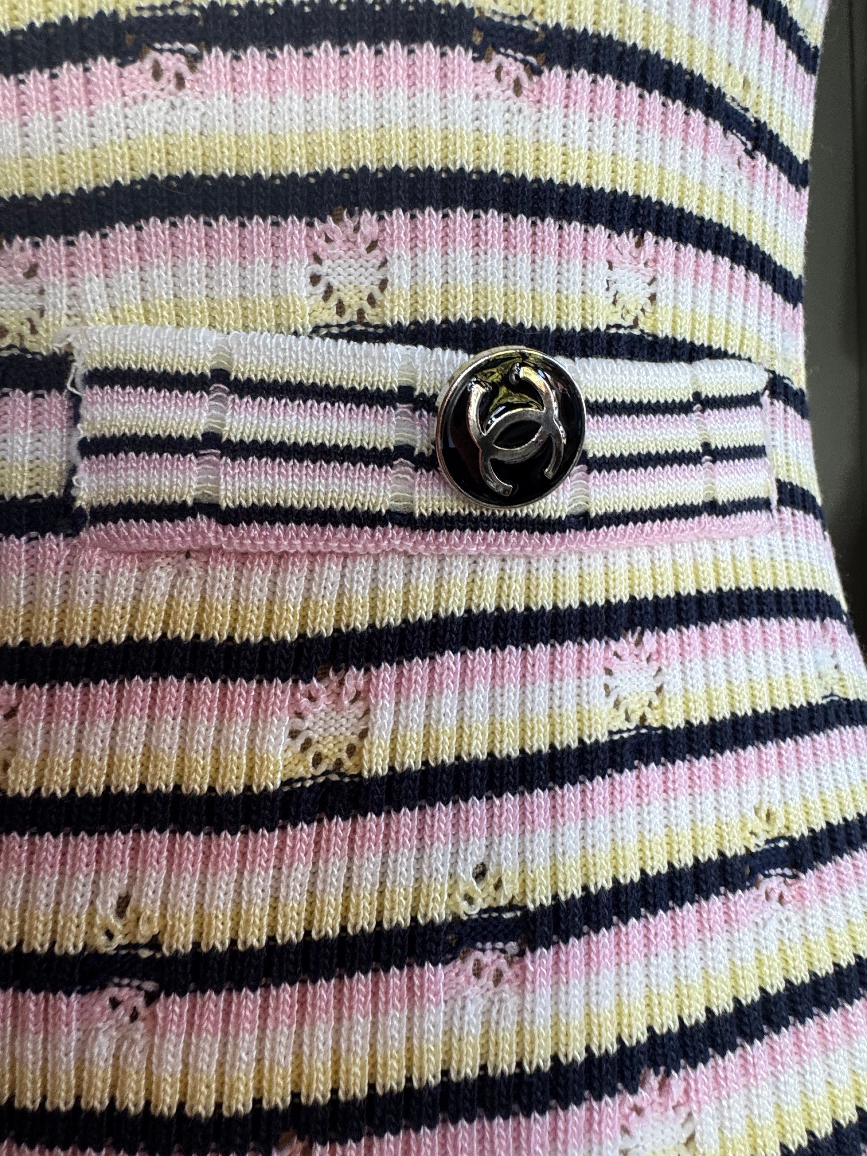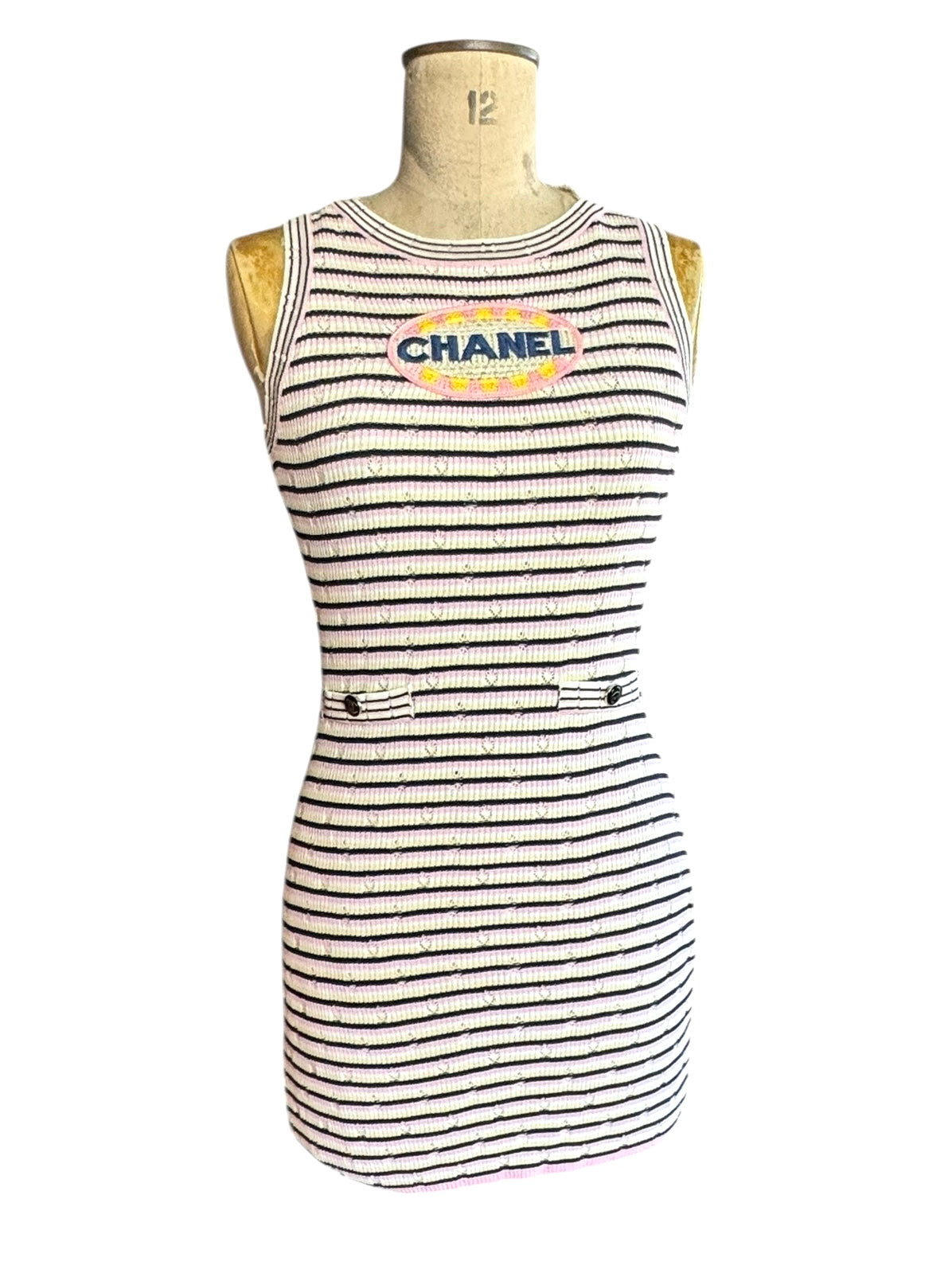 This Chanel Y2K mini knit dress is a must-have for any collector or Chanel enthusiast. It features a figure-hugging stretch Cotton fabric, sleeveless design, and chic round neckline. The faux Side pockets and monogrammed buttons add a touch of luxury to this versatile summer dress.