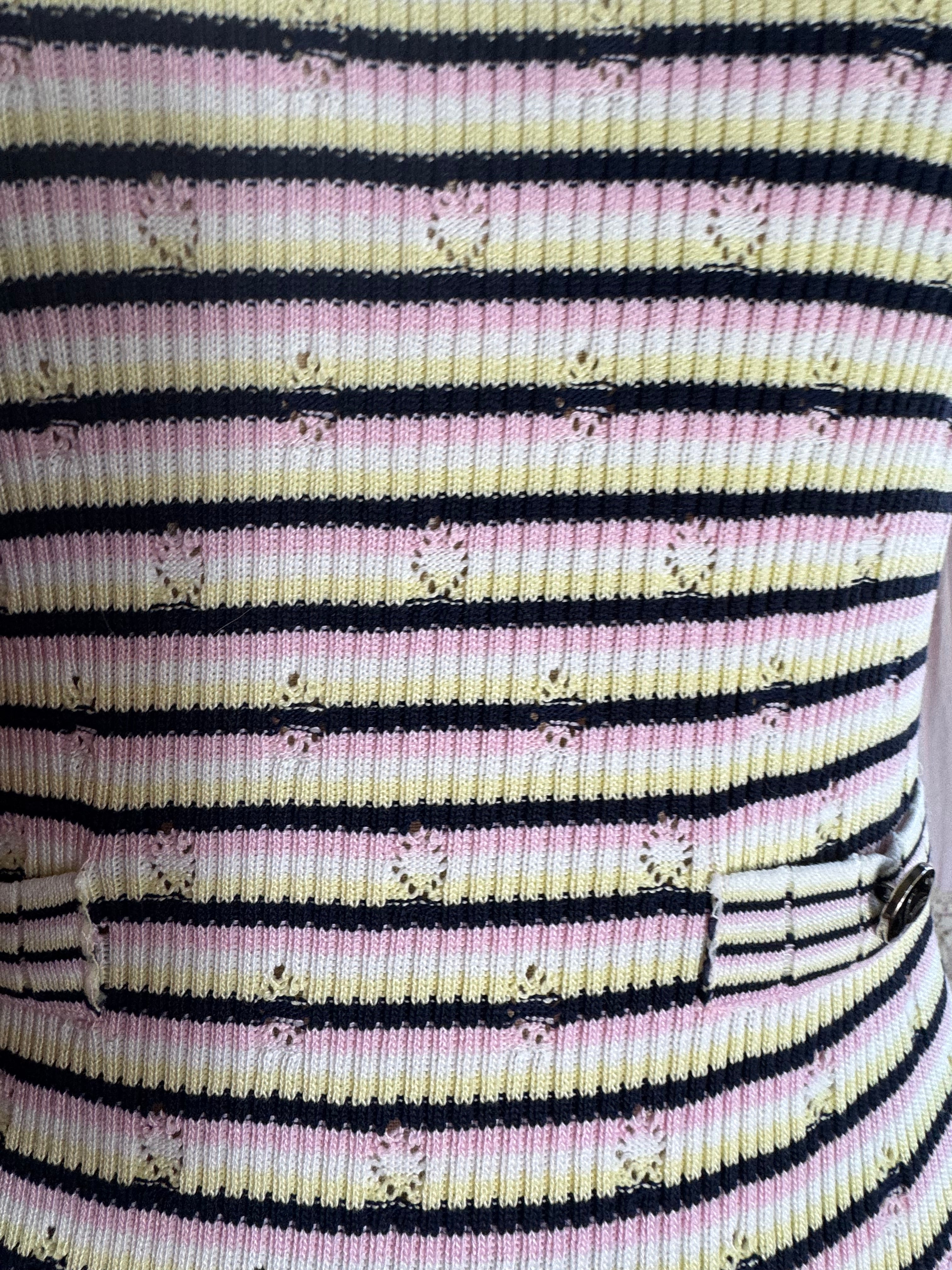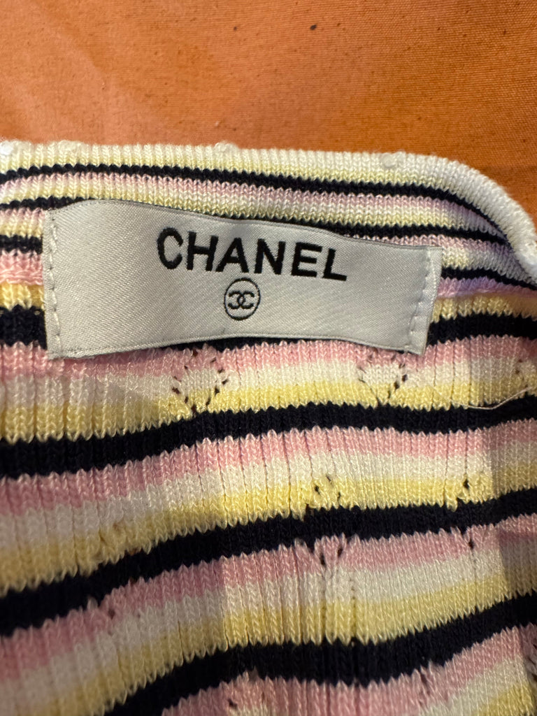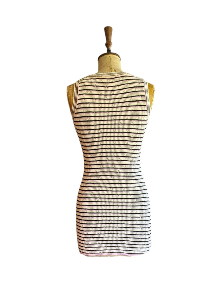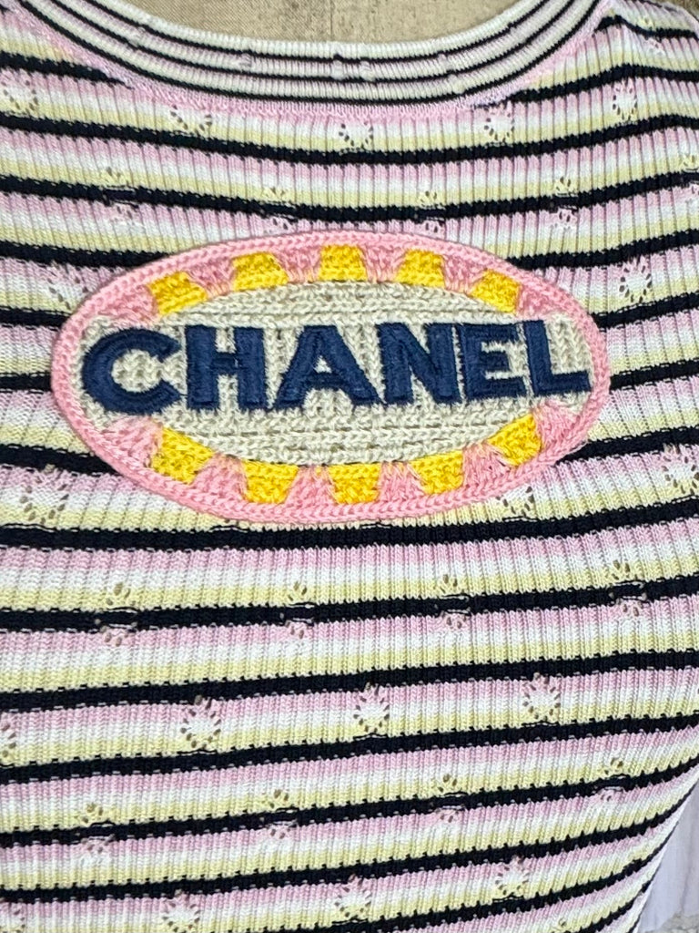 This Chanel Y2K mini knit dress is a must-have for any collector or Chanel enthusiast. It features a figure-hugging stretch Cotton fabric, sleeveless design, and chic round neckline. The faux Side pockets and monogrammed buttons add a touch of luxury to this versatile summer dress.