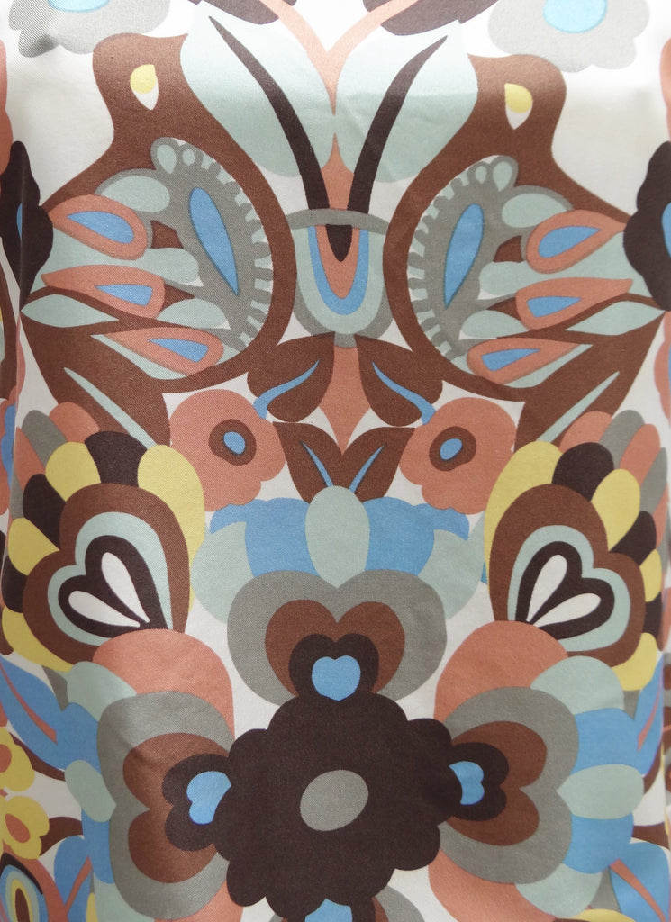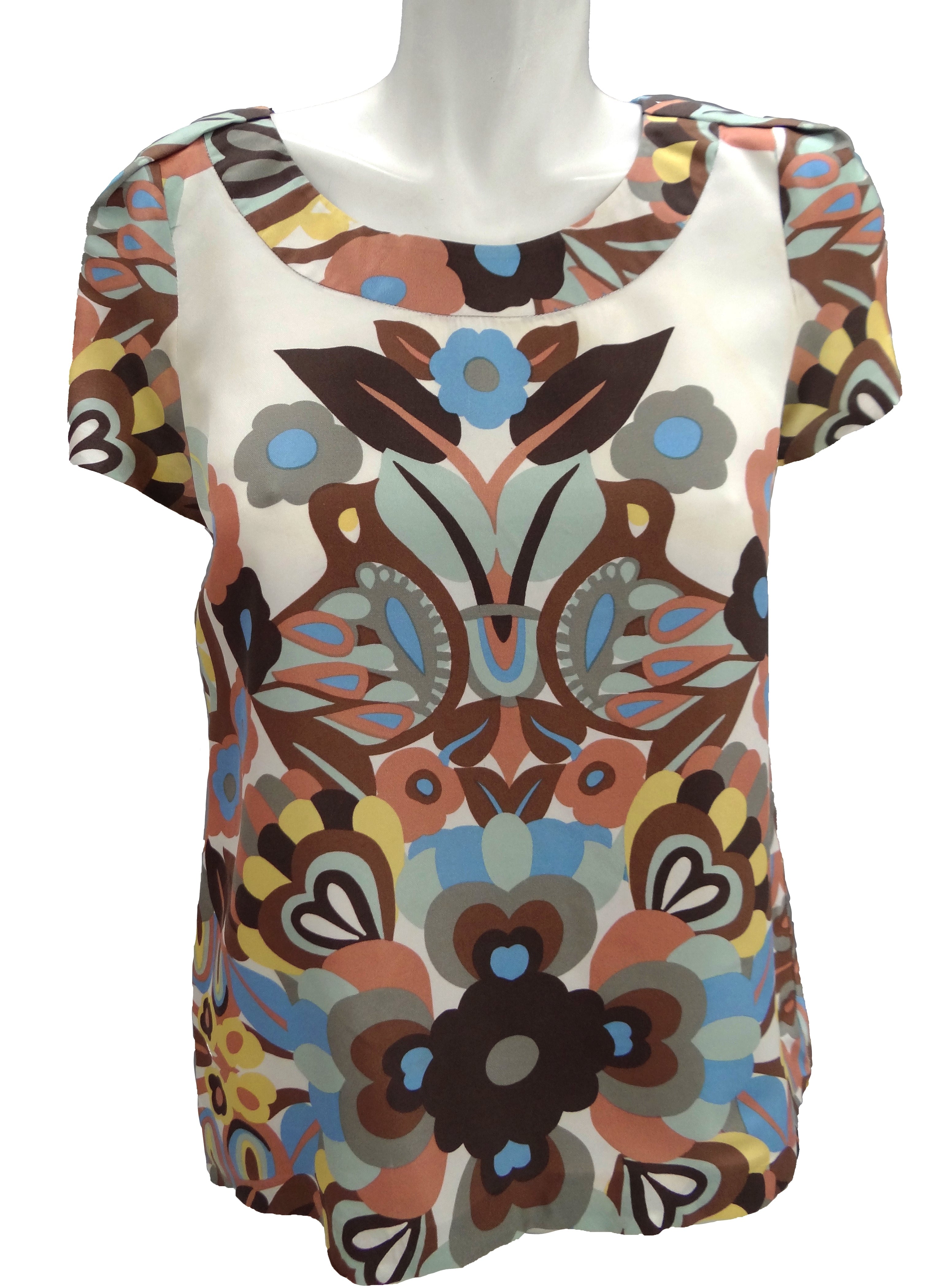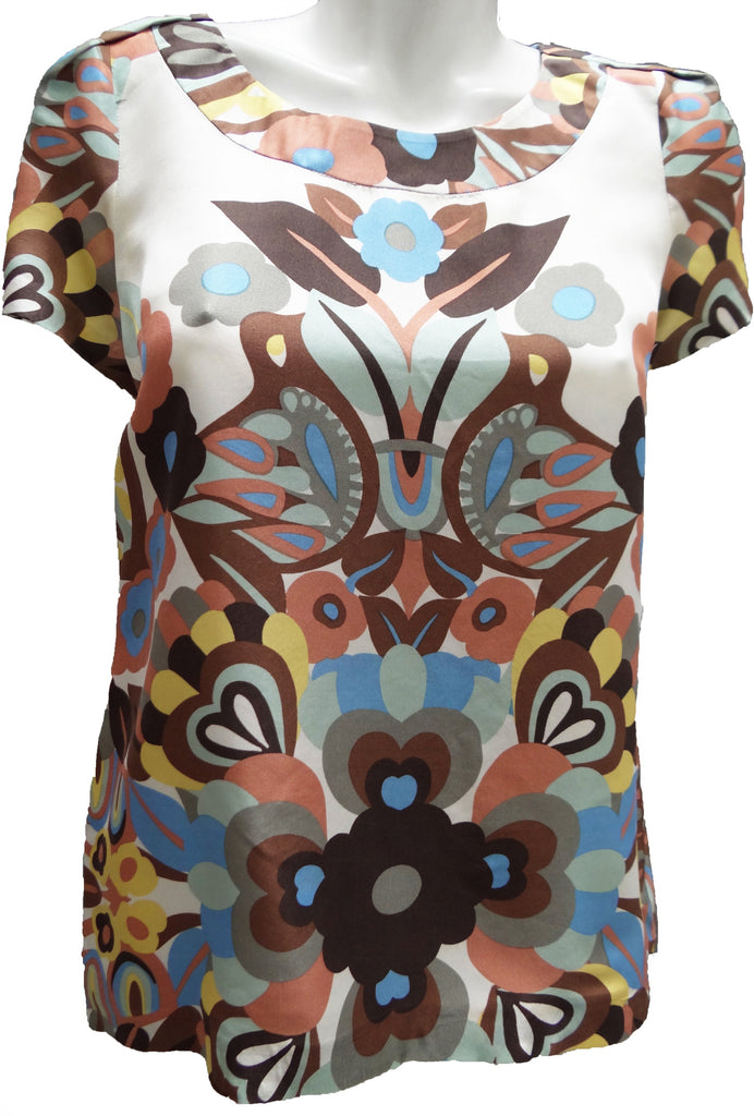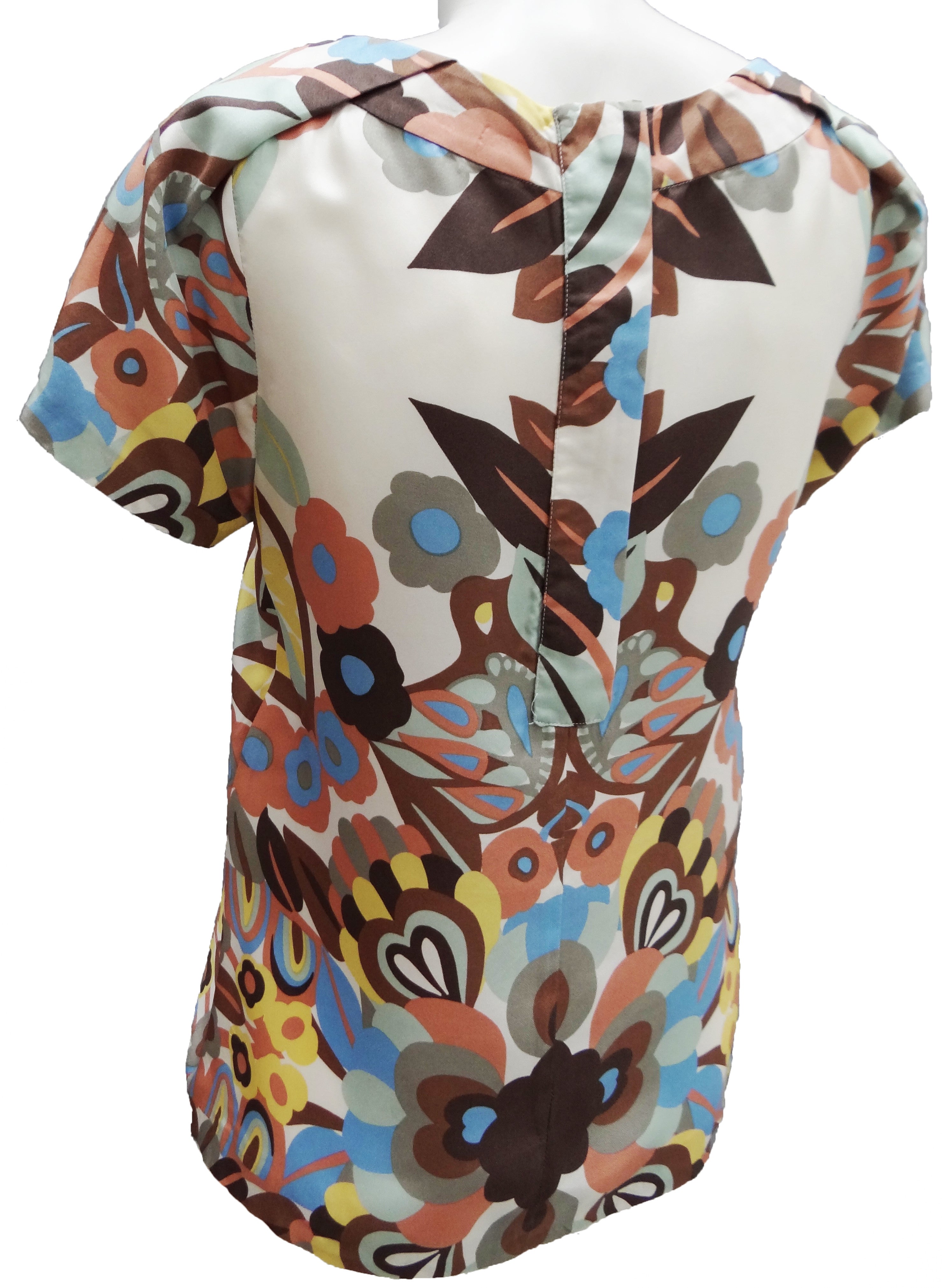 A beautiful silk short sleeved top by See by Chloe, with a distinctive and harmonious floral design, in a dusky colour palette of rose pink, blue, brown and yellow against an ivory background. The top has a short sleeves and a round neck edged in the floral pattern, with a covered zip at the back. A really great summer top.