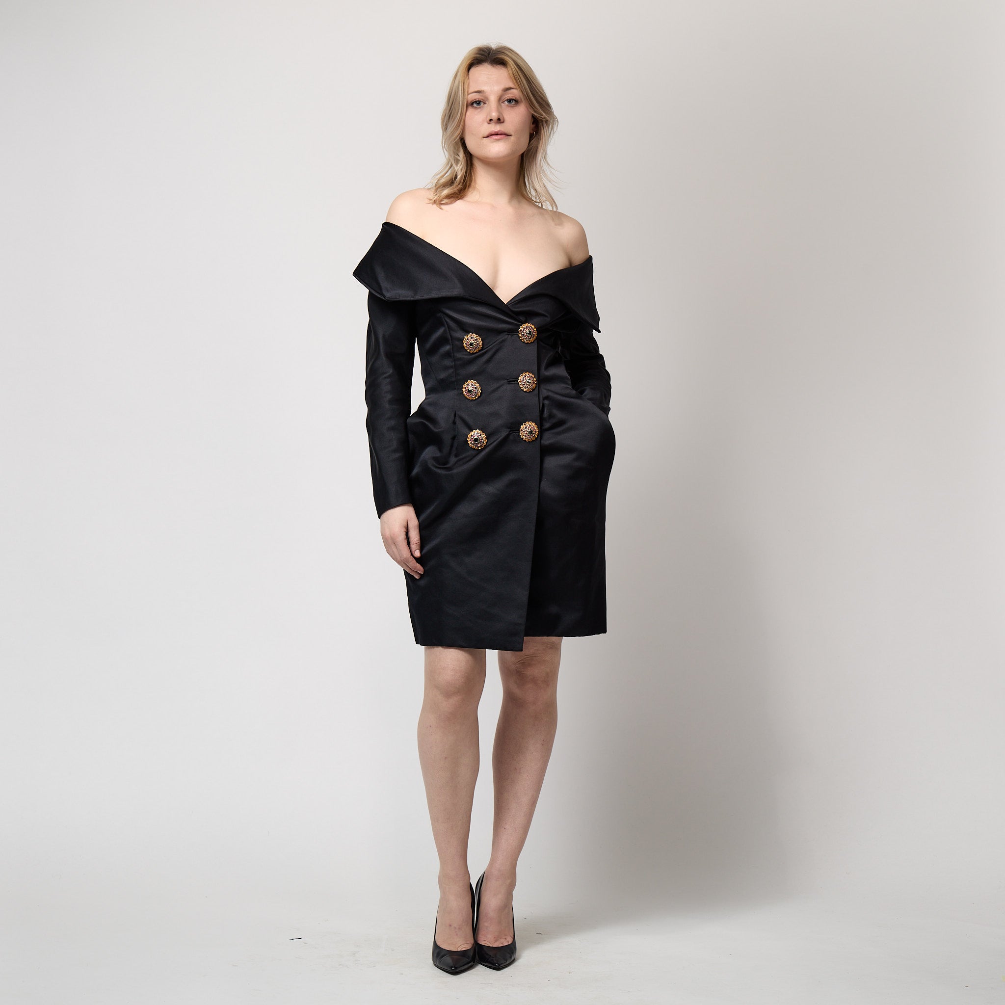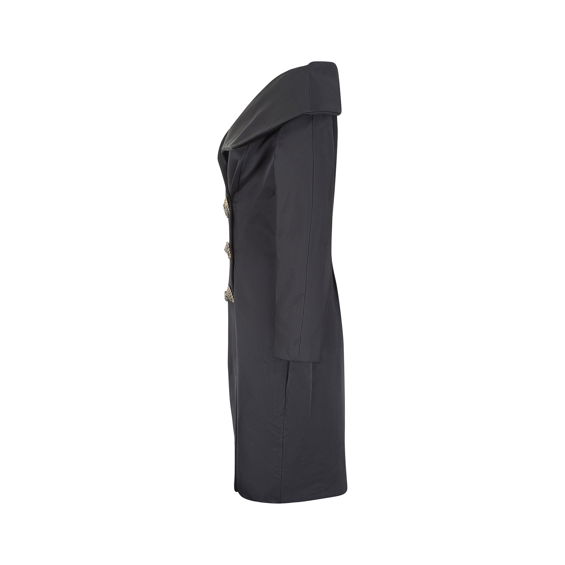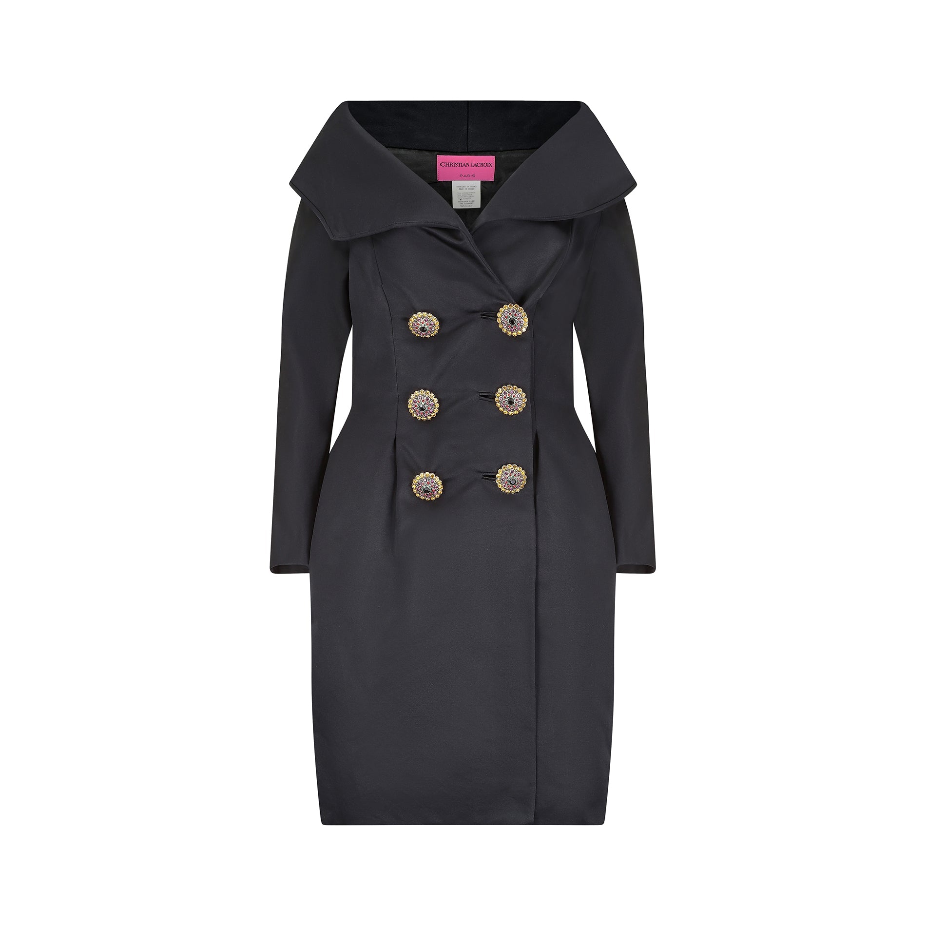 Striking black silk 'tuxedo' dress by Christian Lacroix, complete with large crystal button detail. This form fitting dress has a very wide, almost bardot style collar, reminiscent of the chic evening wear styles of the 1950s. The front is cut in a classic double breasted style, finished with six large buttons in an array of orange, purple, red and green crystals with a central black stone in the middle. The inside of the dress is lined in a very fine and soft black silk, making it extra comfortable for the wearer. The sleeves can be opened via a concealed zipper at each cuff, and the silhouette widens slightly at the hip due to the pleated detail in the skirt, narrowing again to create a flattering pencil shape at the hem.