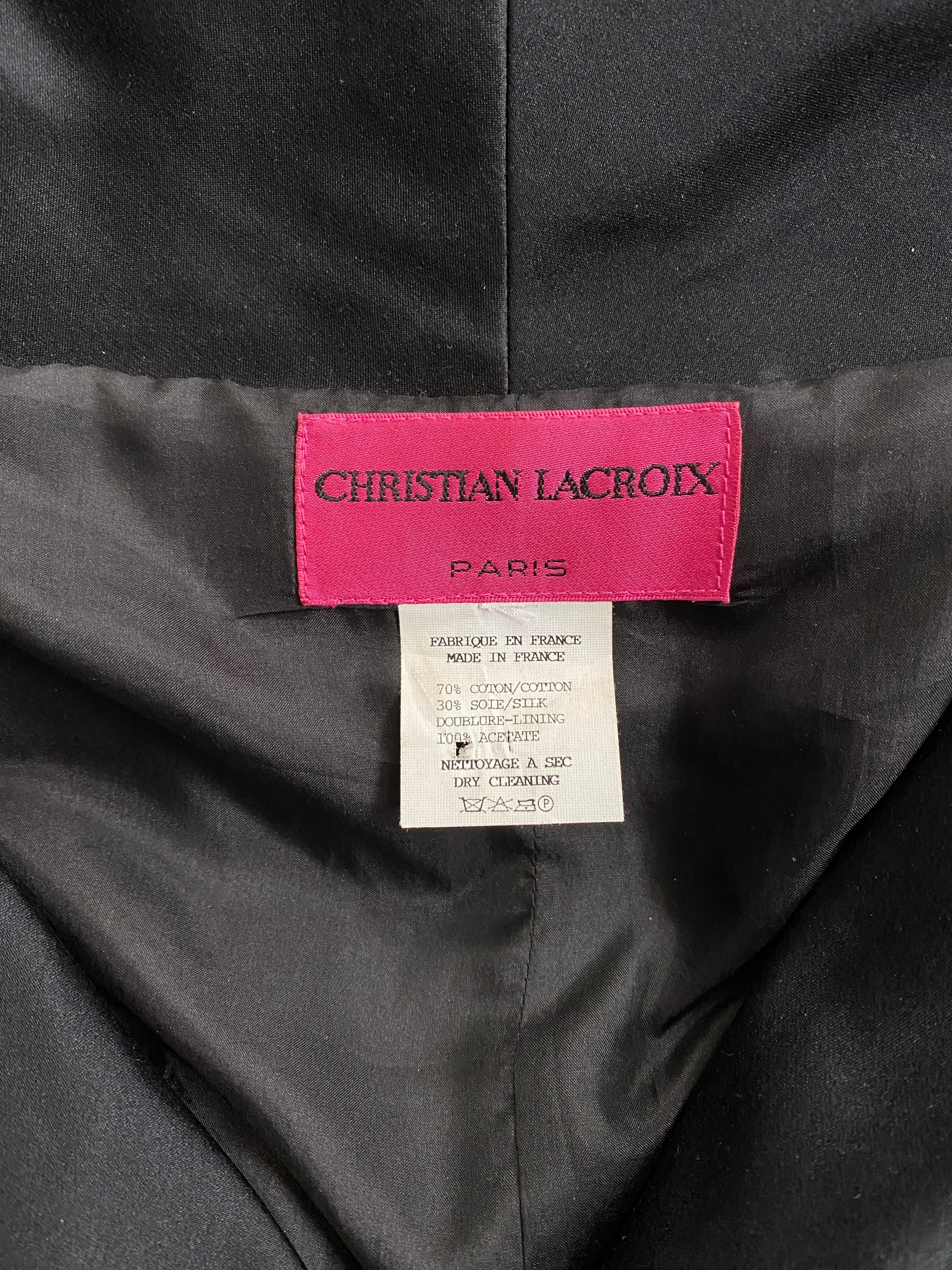 After some painstaking research we are attributing this dress to the Fall/Winter Collection of 1991 and shown here is an almost identical jacket design with the same buttons. Lacroix's mainline collections were produced in very limited numbers and made to almost the same level as his haute couture lines. We hold many pieces in our warehouse and continue to acquire archival pieces from important collections.