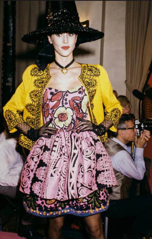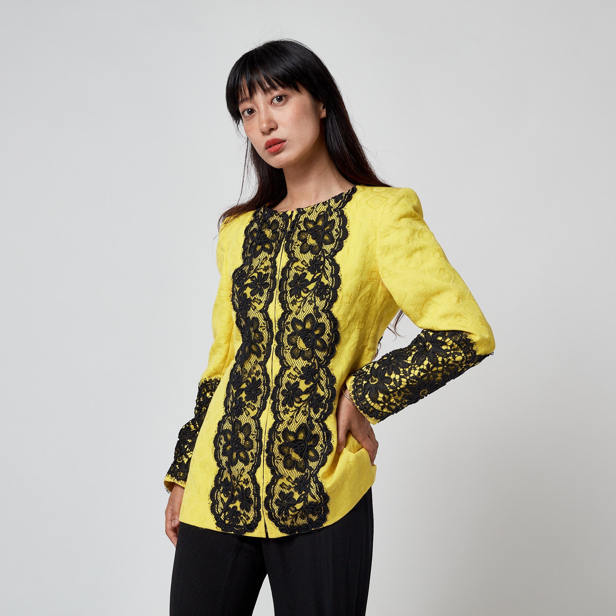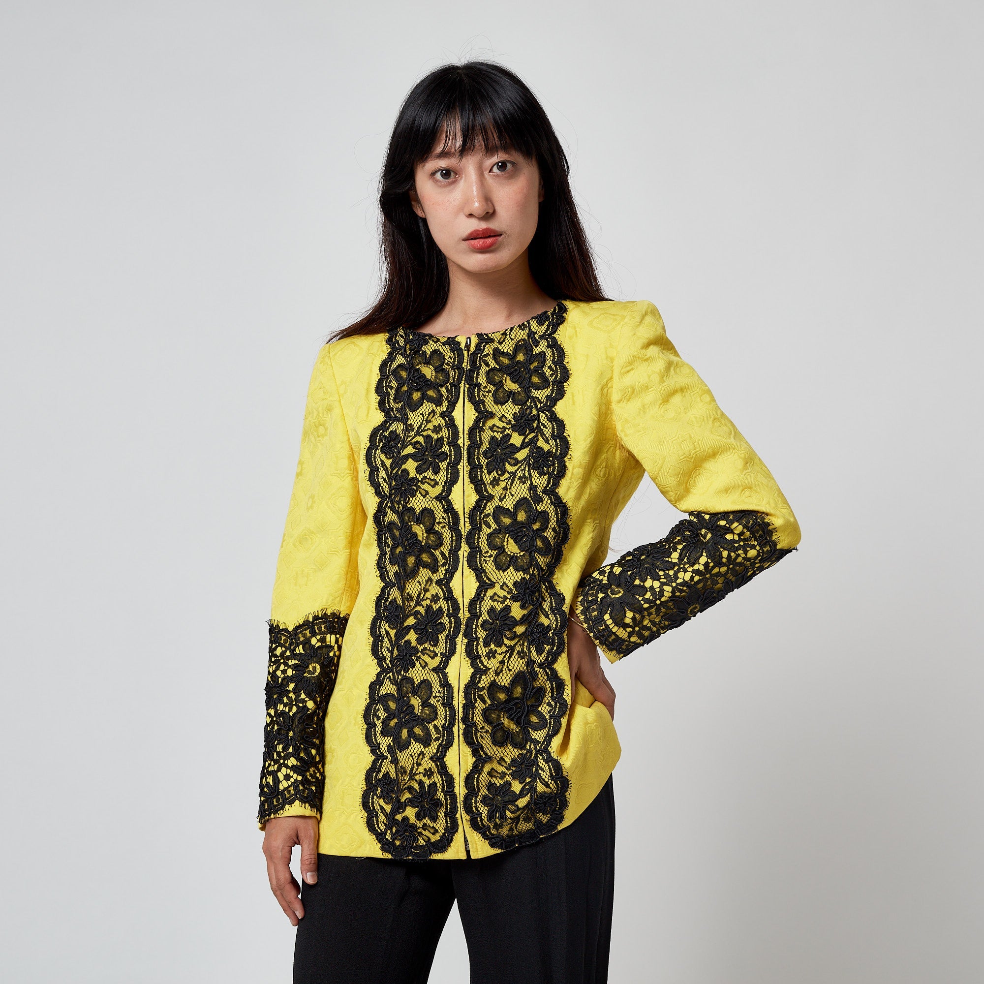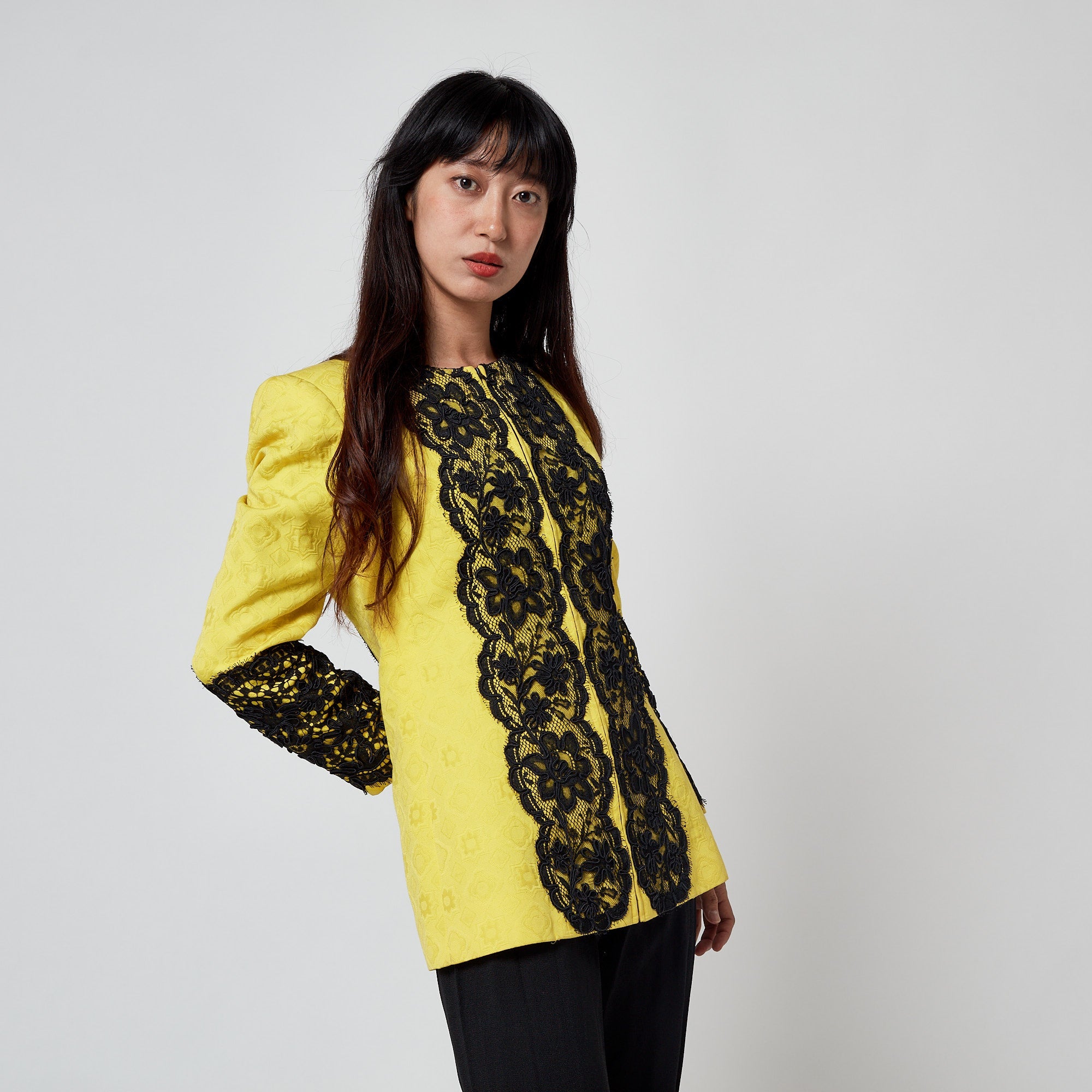This elongated, collarless jacket is from Christian Lacroix’s Spring 1991 collection. The runway image of this piece is a wonderful find - we love how the designer demonstrated his genius eye for colour by pairing it with a baby pink dress. Crafted in a bright yellow geometric jacquard, it features subtle flower- and star-like motifs. The front fastens with a concealed black metal zipper, framed on both sides by dramatic black lace trim that also continues down the back and along the cuffs. The lace is overlaid with signature Lacroix ribbon work, adding texture and dimension characteristic of the designer’s early 1990s detailing. It is fully lined in tonal yellow silk.