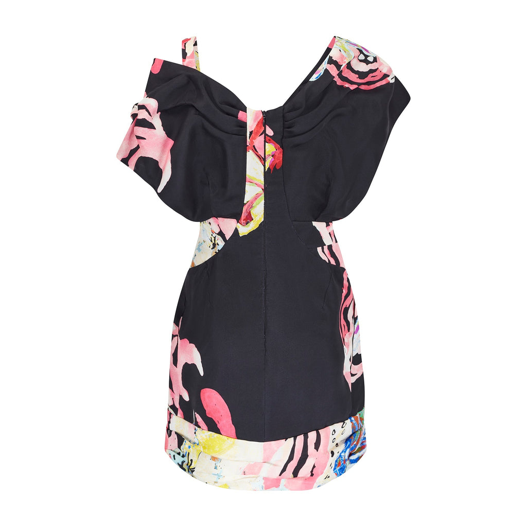 The silhouette is playful and the fabric unusual - signature traits in the French designer’s collectable designs. This dress is tailored from pure silk gauze printed with outlandish patterns in rainbow hues that suggest blown-up florals and abstract paintings. Contrasting panels of black silk make the coloured panels really pop. It is cut to a mini-dress length, the skirt has a panelled construction of clashingly patterned cloths and is cut to hug the hips. The top of the dress has a wide-neckline with a twisted construction and is pinned at the shoulders to add to the deconstructed feel. The back is curved with a ruched neckline and is secured with a hidden tonal black zip. The back of the dress makes the panelled construction apparent; mostly black, it offers hints of the vibrant florals that smother the front. The dress is labelled “Christian Lacroix Paris” in white font on a red label.