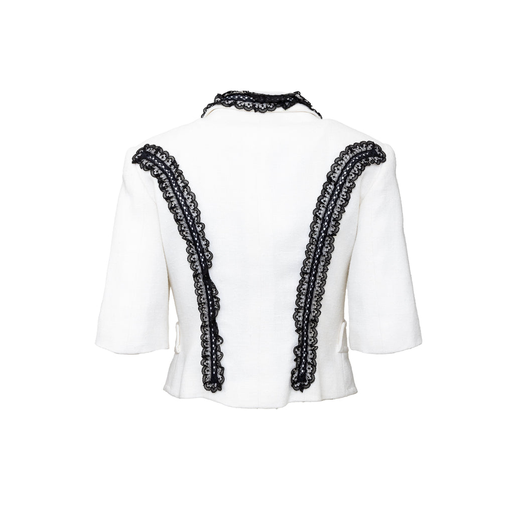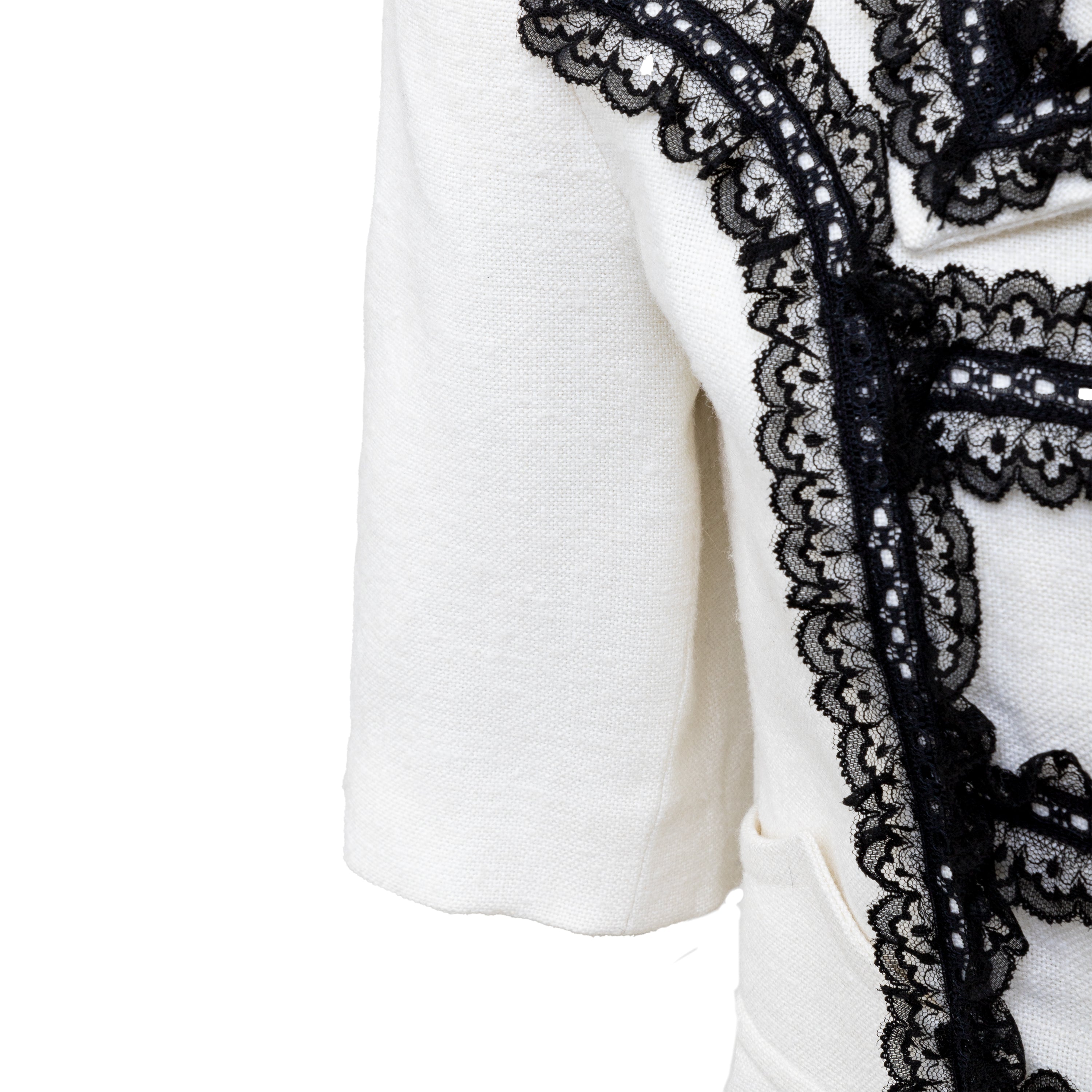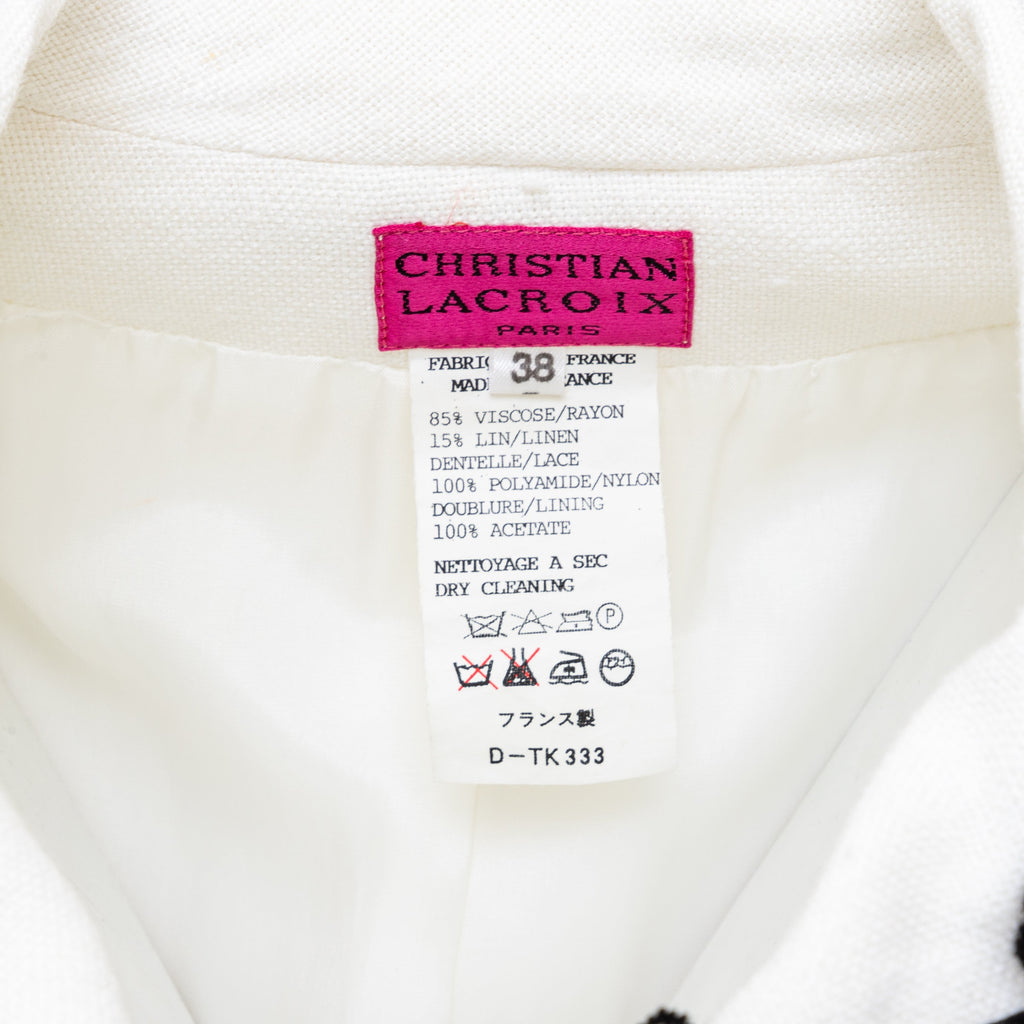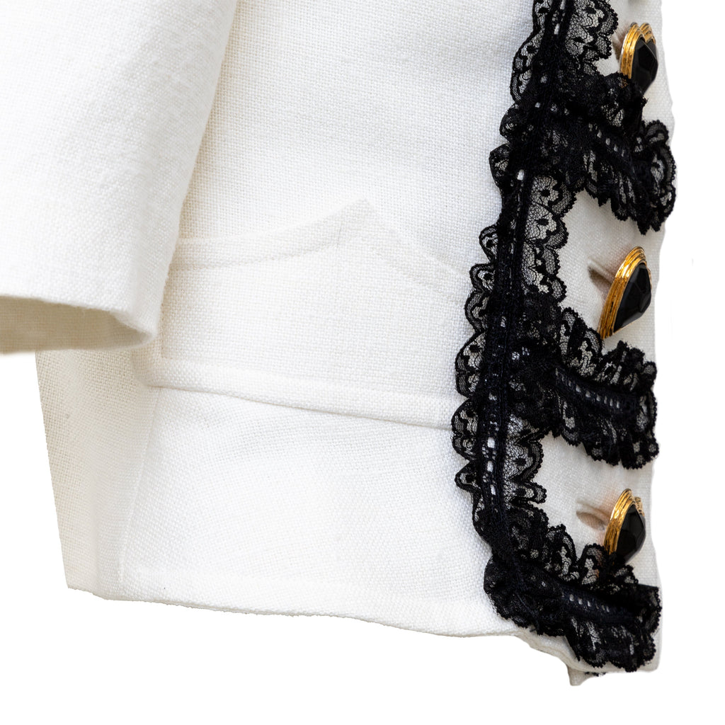 Christian Lacroix 90s vintage jacket in white linen-viscose, cropped, lace-trimmed sleeves, jewel buttons.