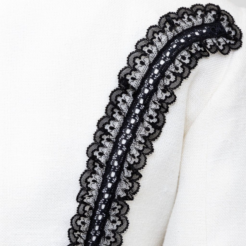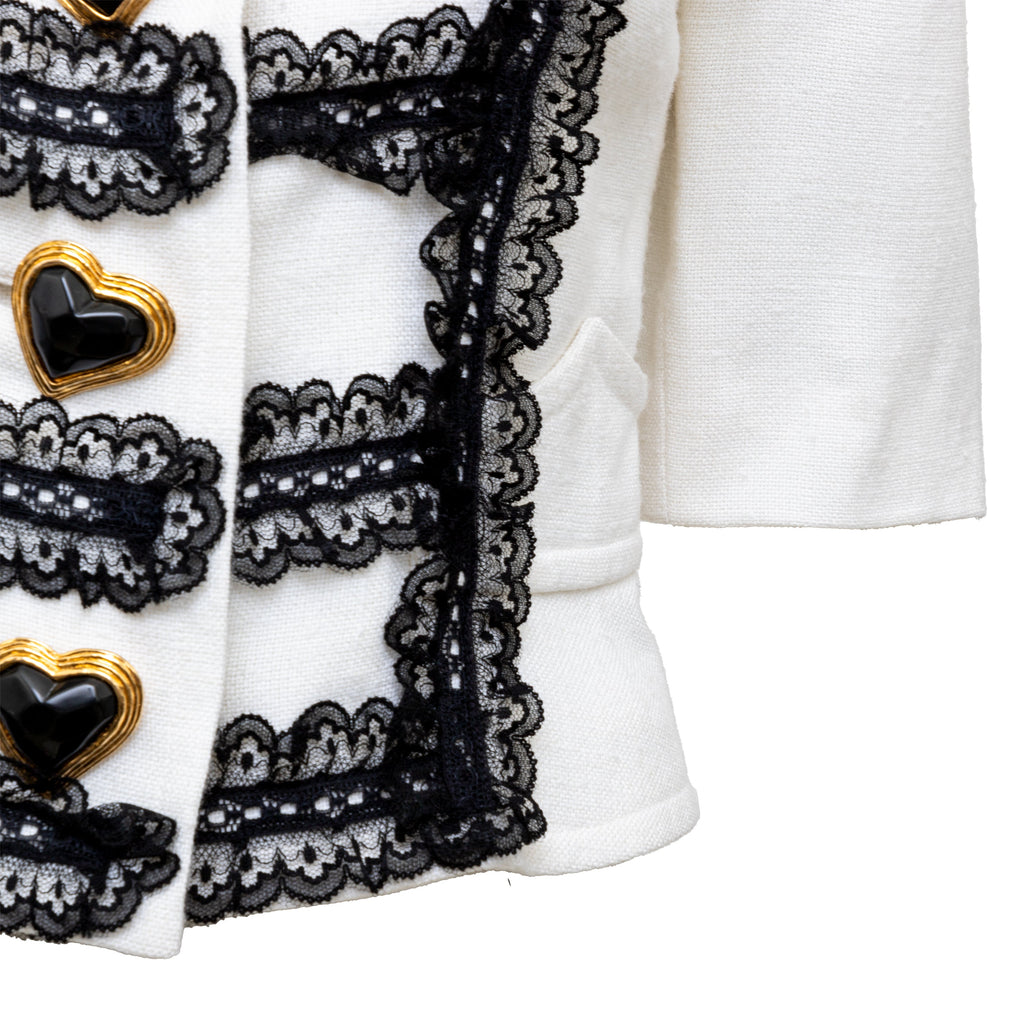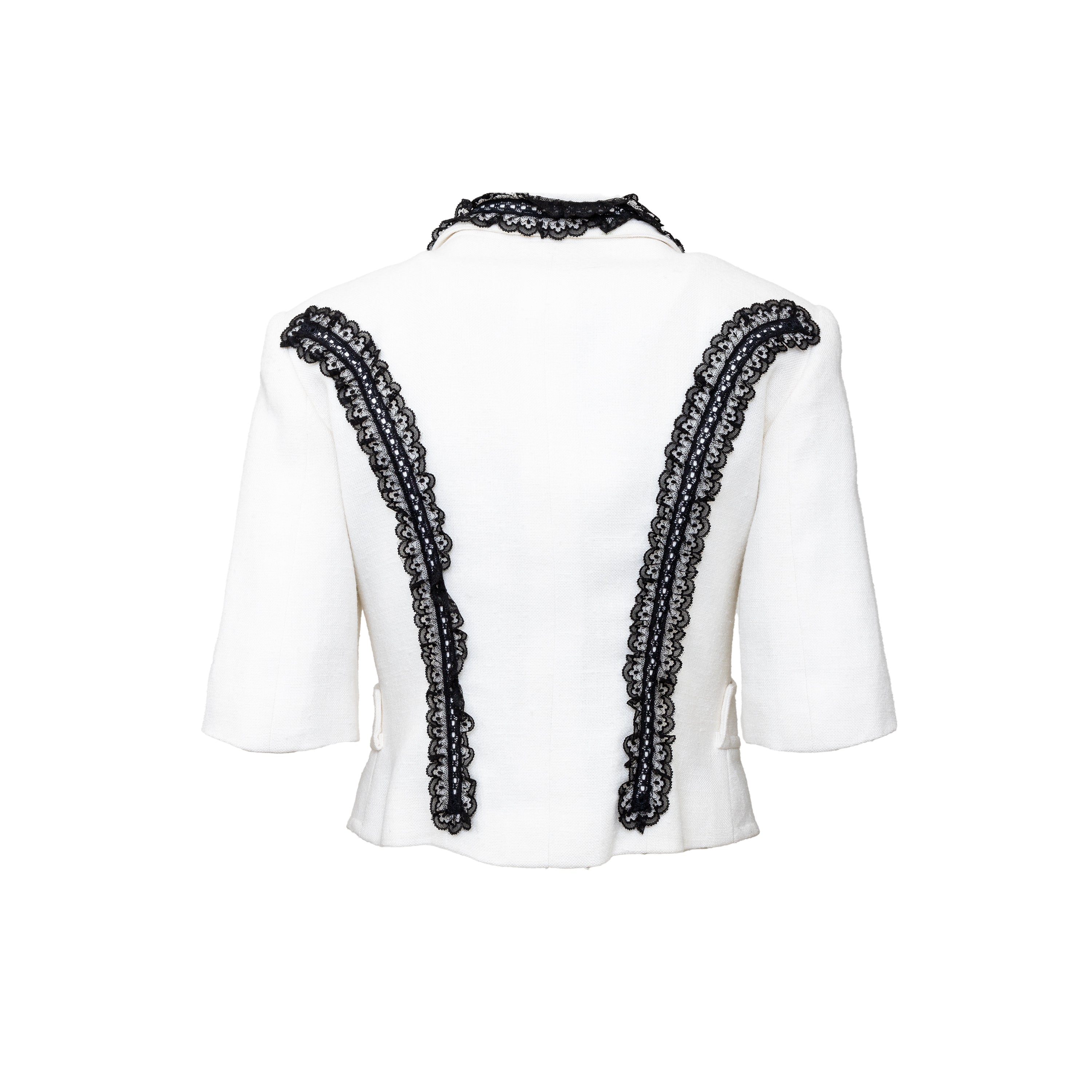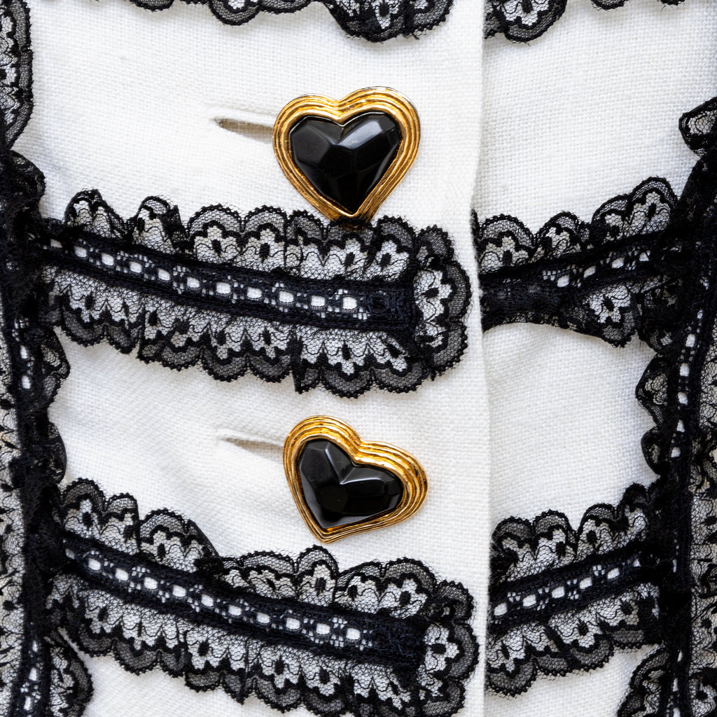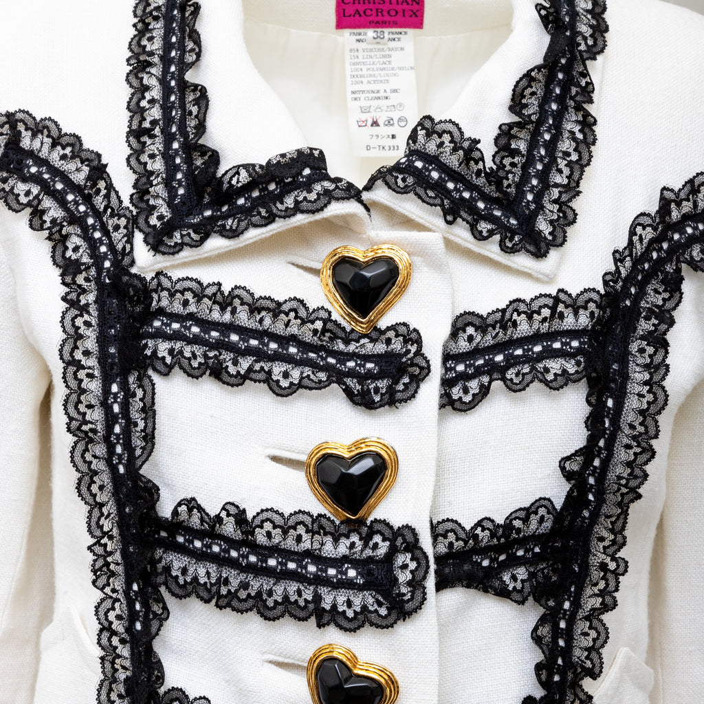 Christian Lacroix 90s vintage jacket in white linen-viscose, cropped, lace-trimmed sleeves, jewel buttons.