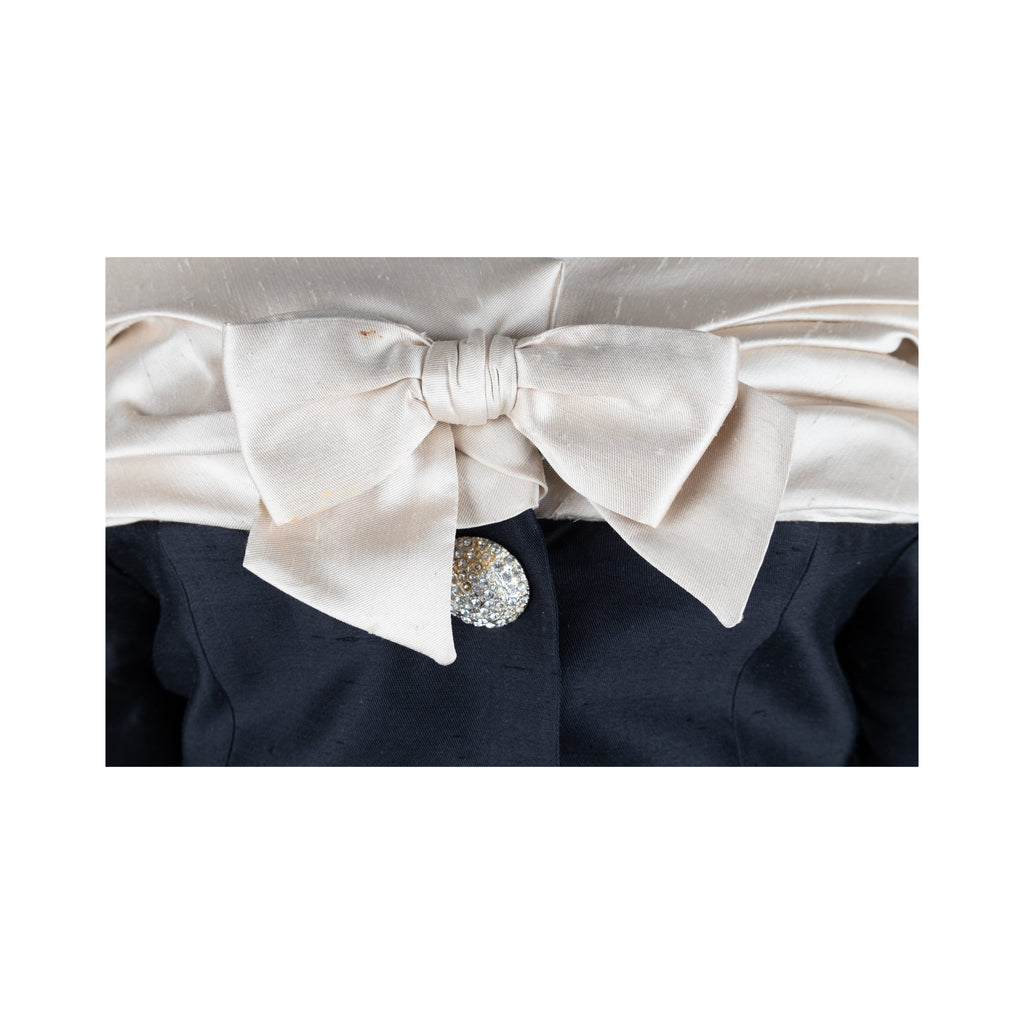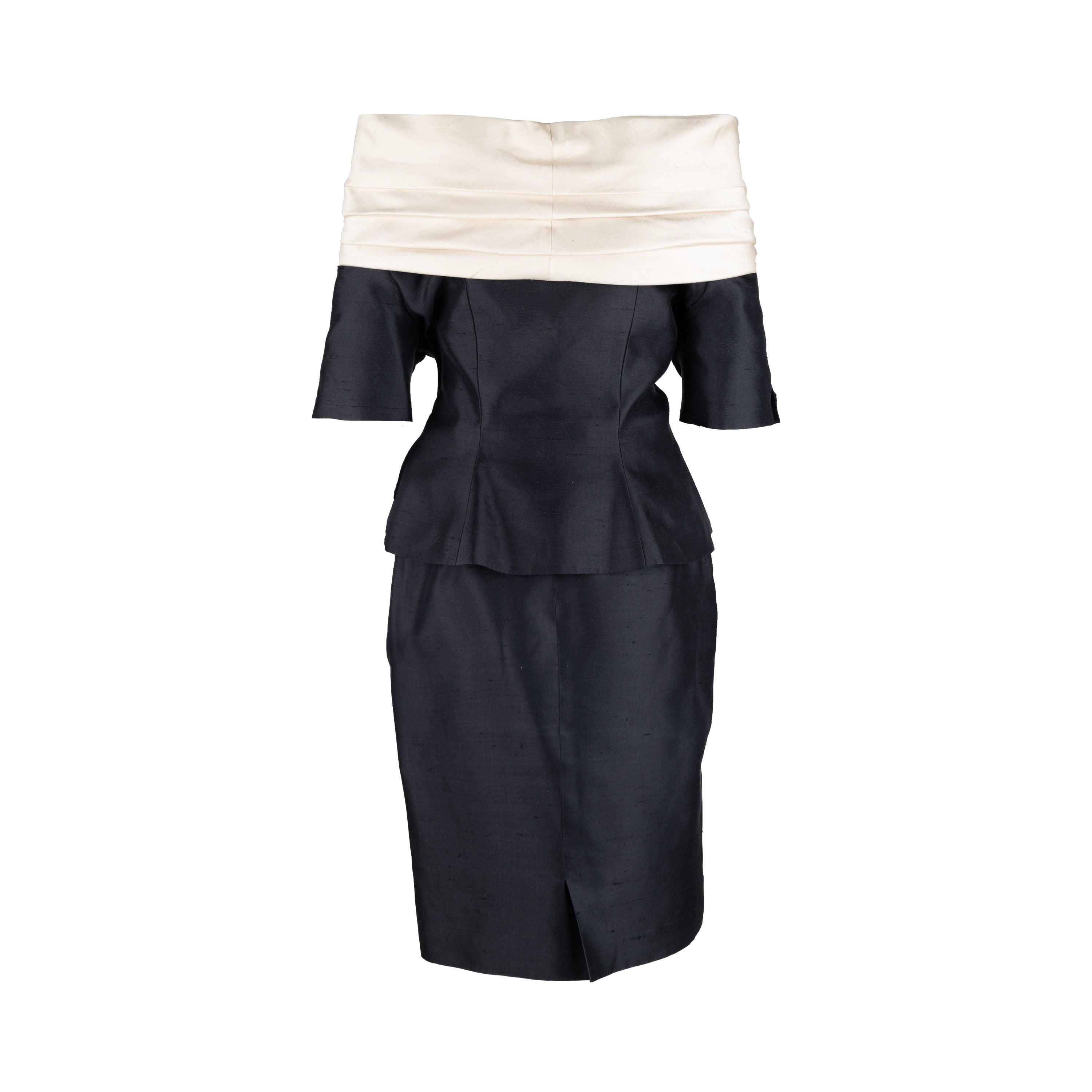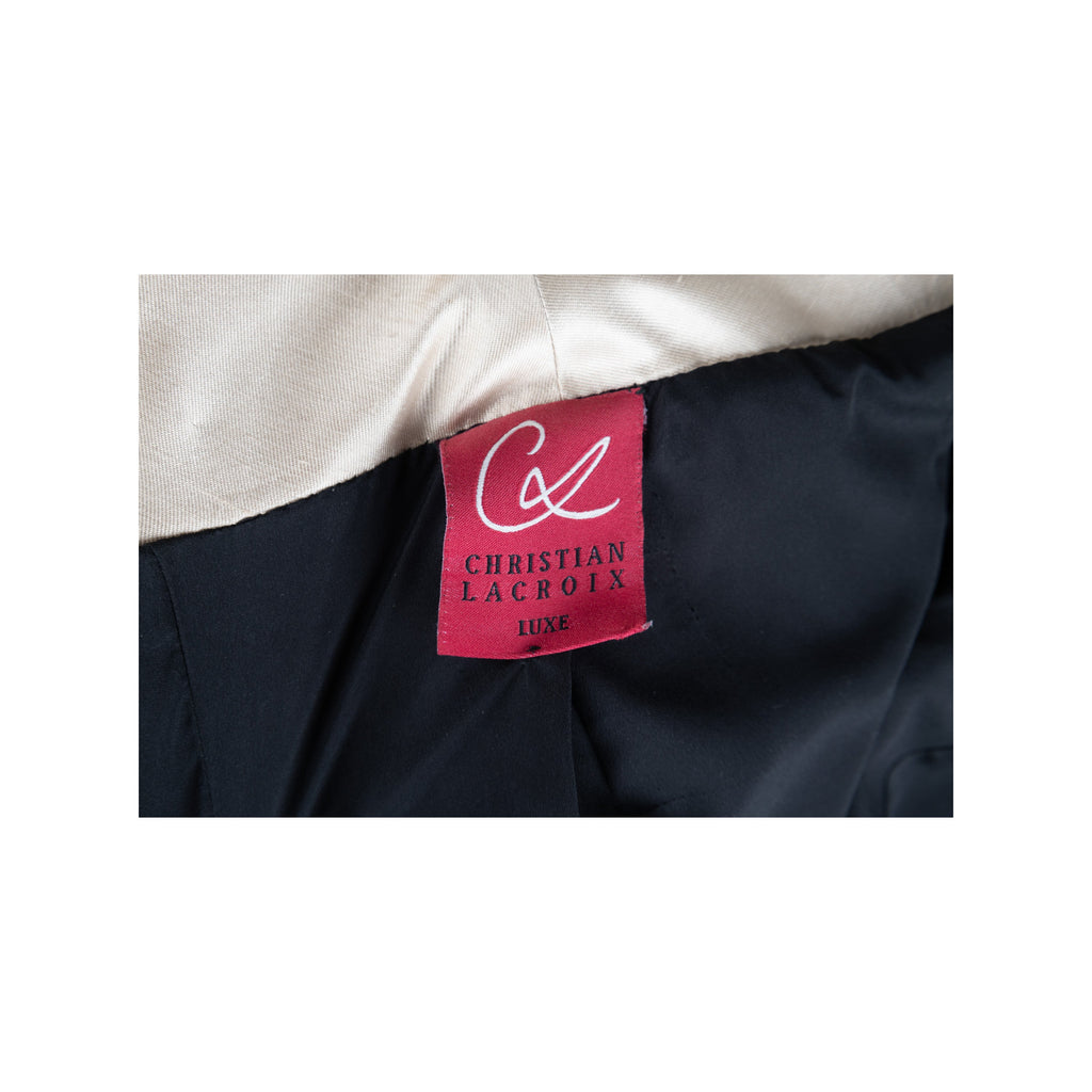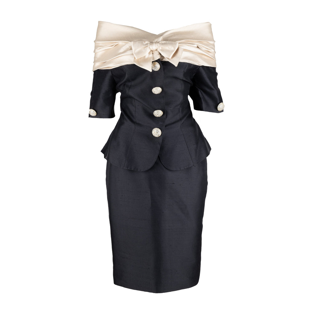 This classic 90s Christian Lacroix set includes a unique off-shoulder top with intricate pleats and a bow in contrasting off-white shade. The fitted waist creates a feminine silhouette and rhinestone buttons adds a touch of glamour. The skirt has a side closure and a small vent at the back. A true vintage find to add to any wardrobe.