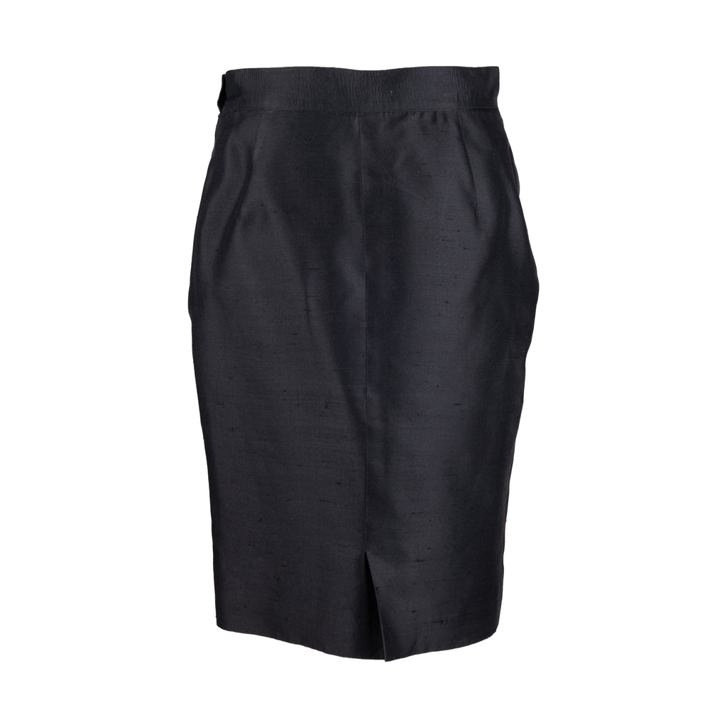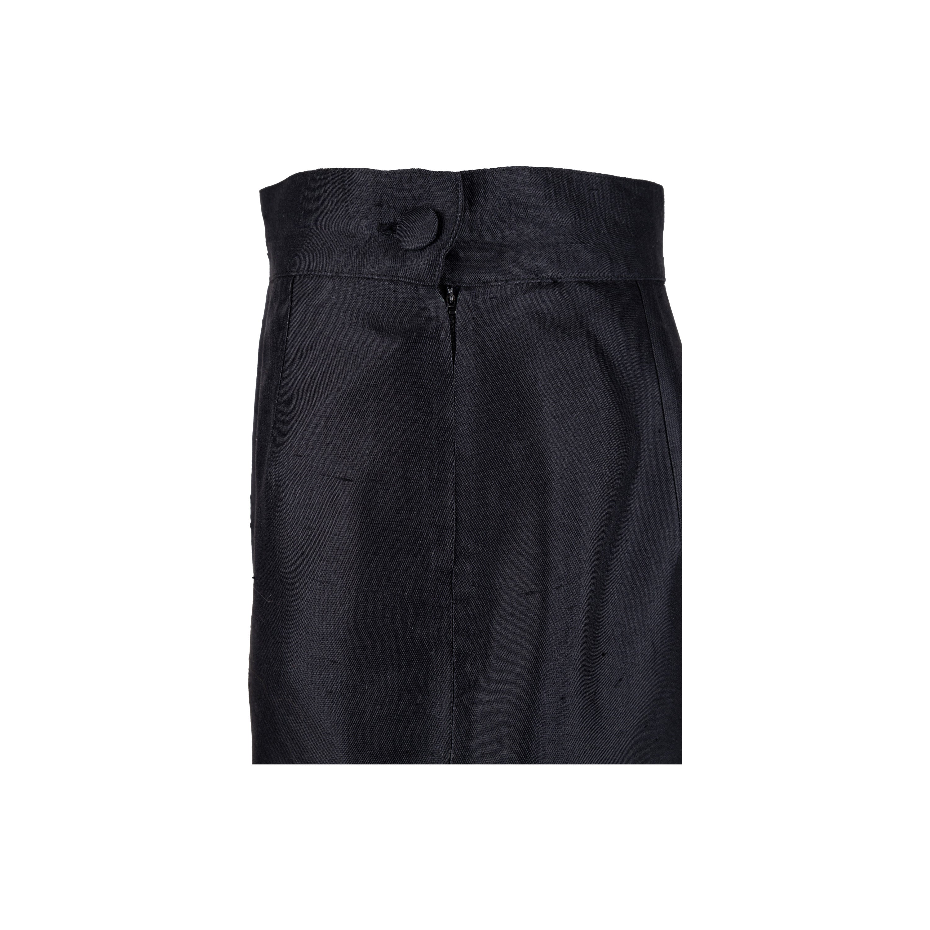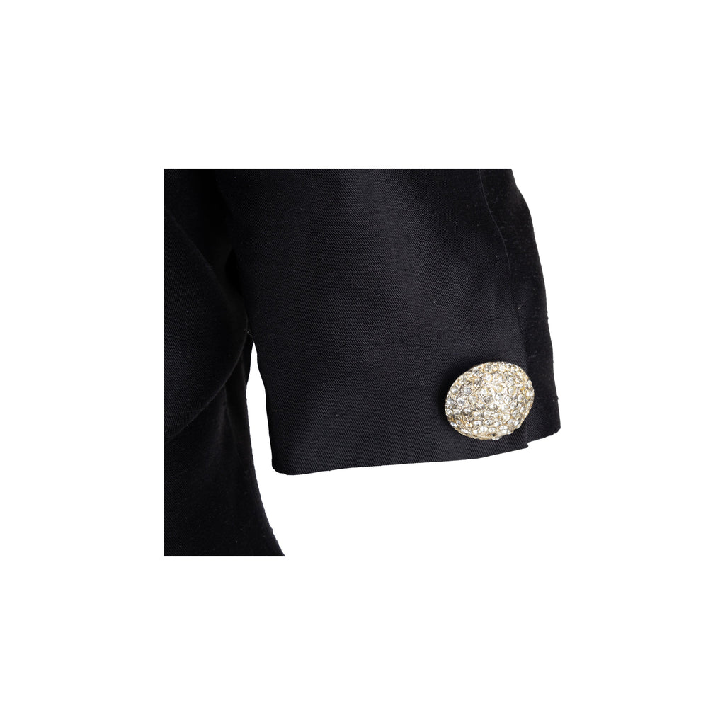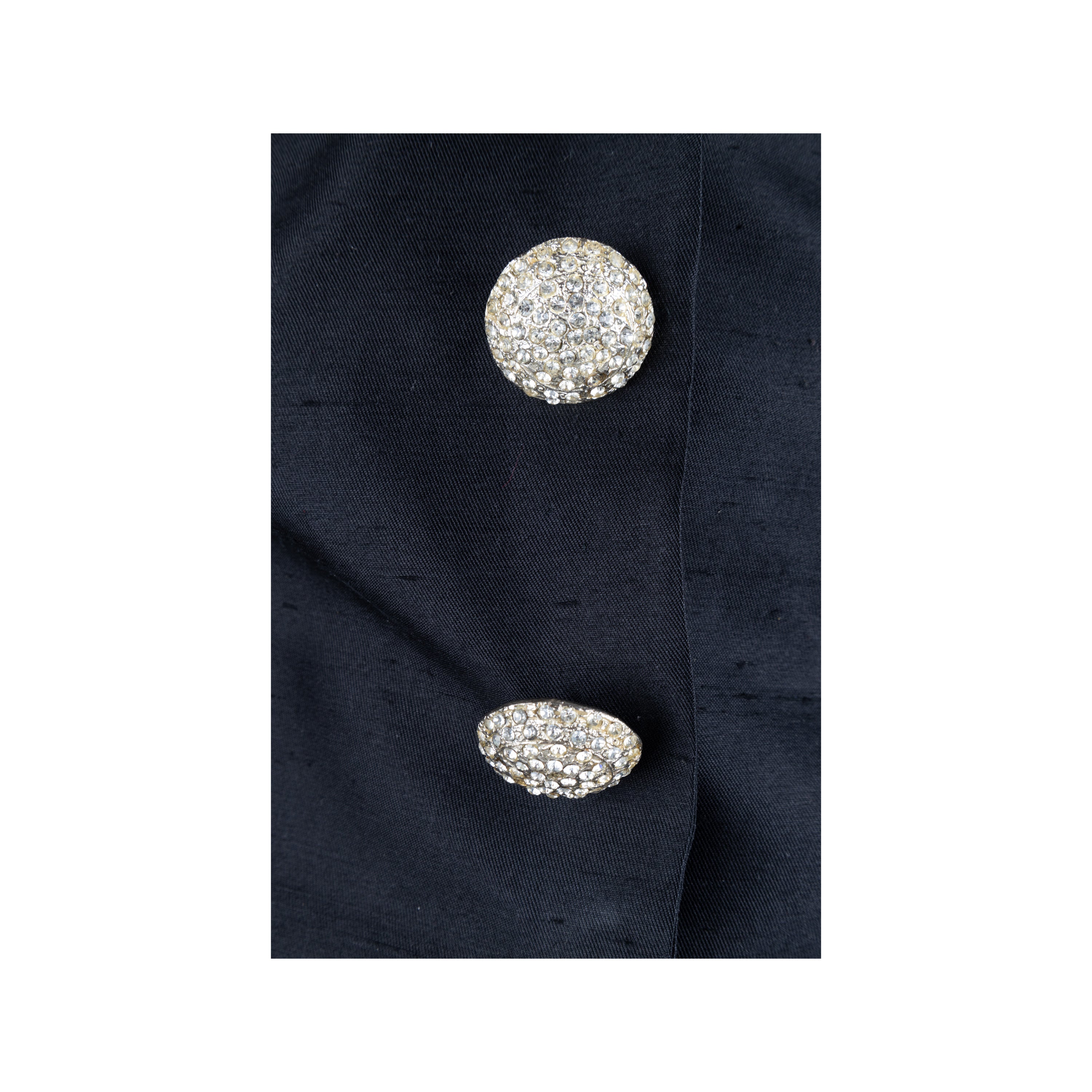 This classic 90s Christian Lacroix set includes a unique off-shoulder top with intricate pleats and a bow in contrasting off-white shade. The fitted waist creates a feminine silhouette and rhinestone buttons adds a touch of glamour. The skirt has a side closure and a small vent at the back. A true vintage find to add to any wardrobe.