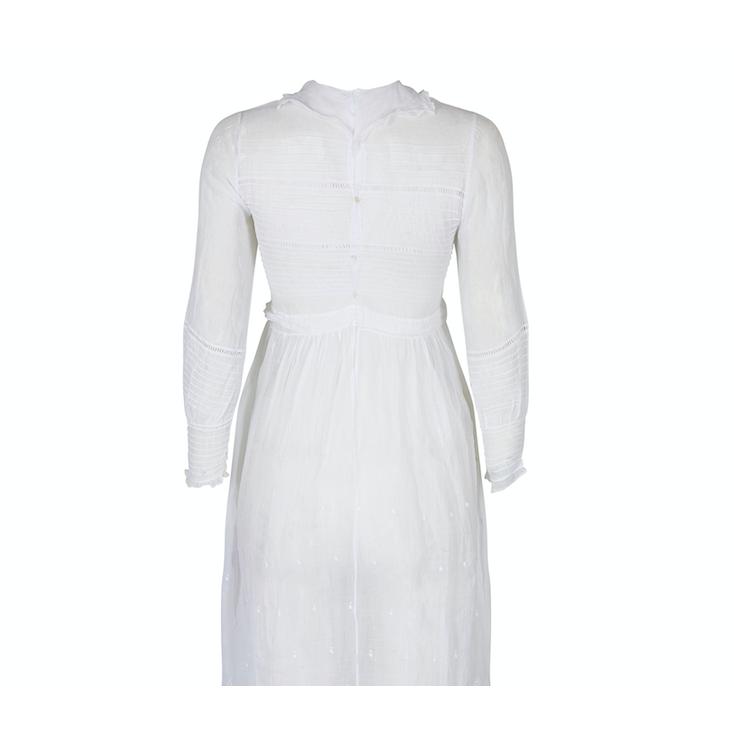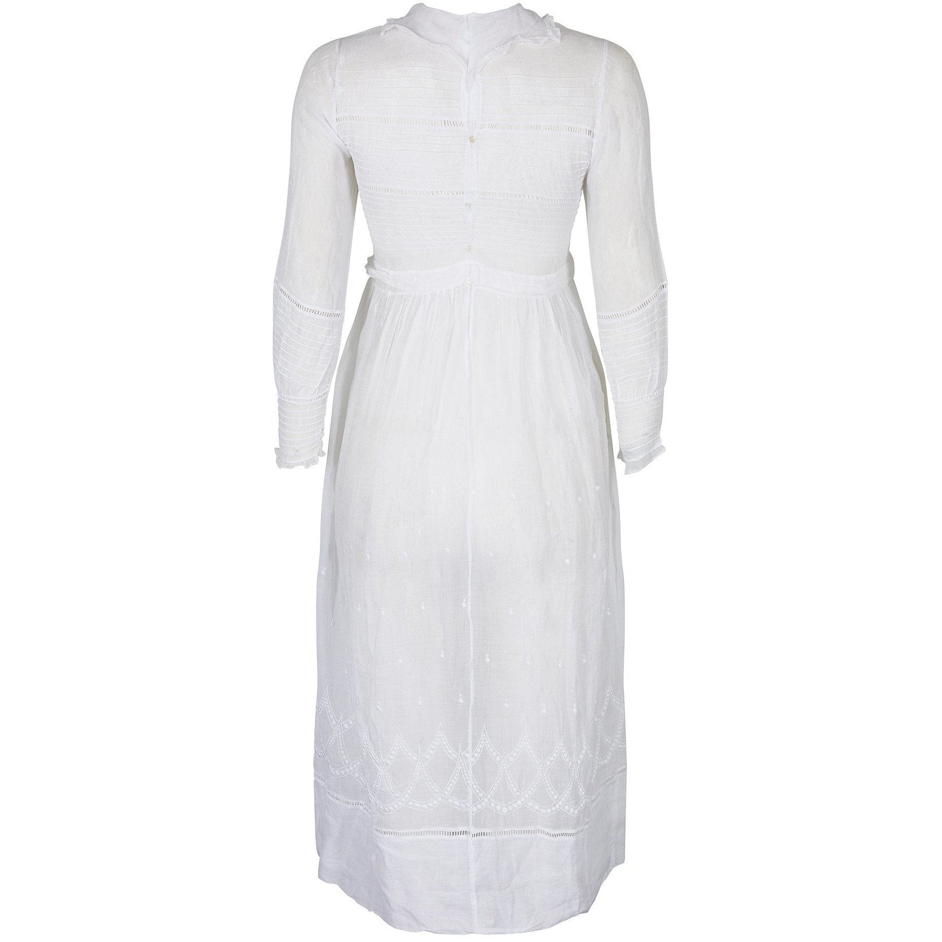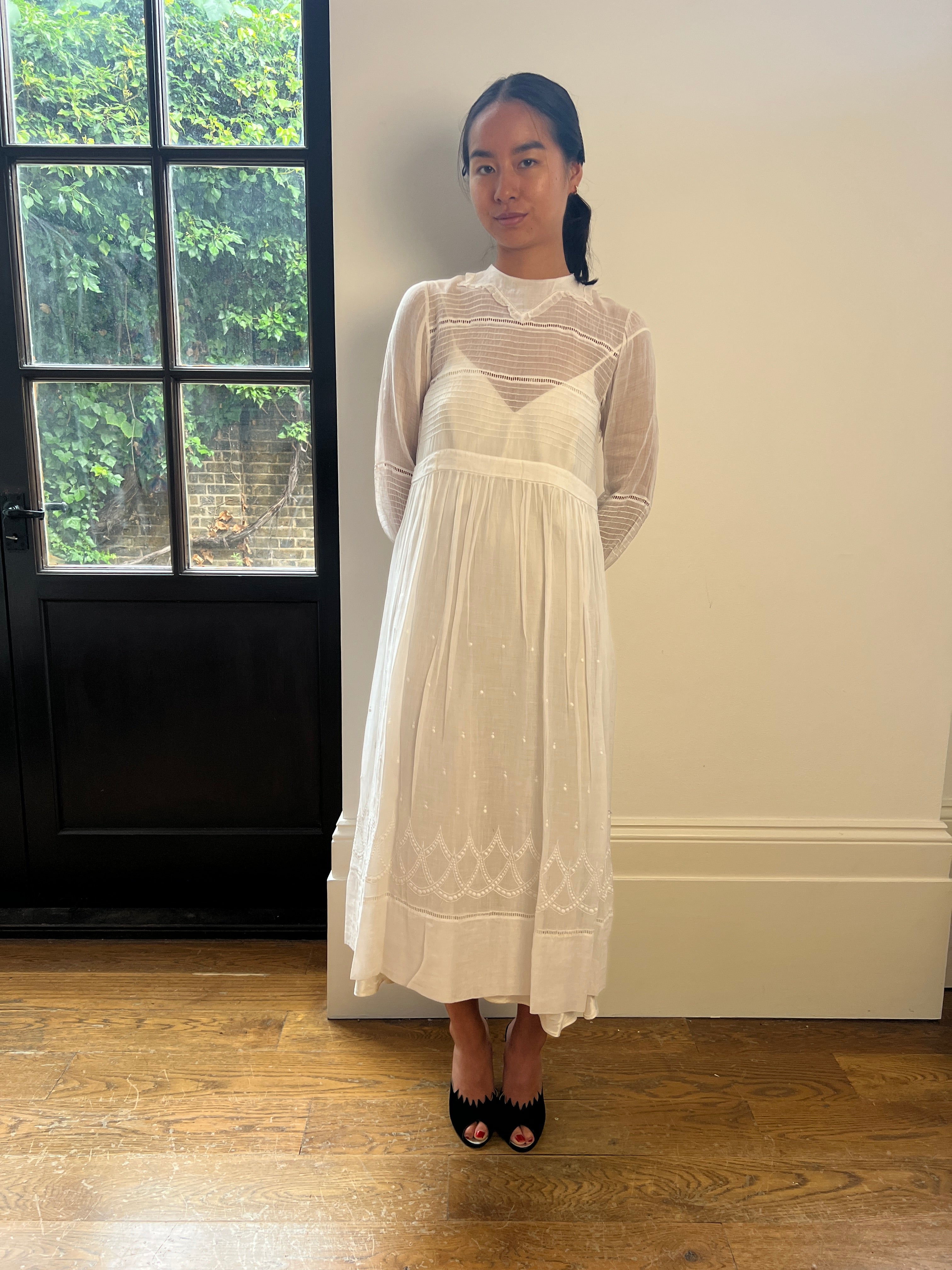 This is a very fine handmade Edwardian to early 1910s cotton white cotton mousseline tea dress. It has wonderful design details; the bodice has a series of horizontal pin tuck pleats with exposed rectangular eyelets on the collar bone. These are further repeated on the elegant tapered sleeves. The high necked collar is delicately edged in cotton tulle and this is repeated on the cuffs. It has the most dainty, genuine pearlescent buttons on the cuffs and those that fasten the dress to the rear. The skirt element is a combination of Swiss dot and an elegant inverted arch design. The dress has an empire waist band and is a straight cut although the skirt is slightly flared.