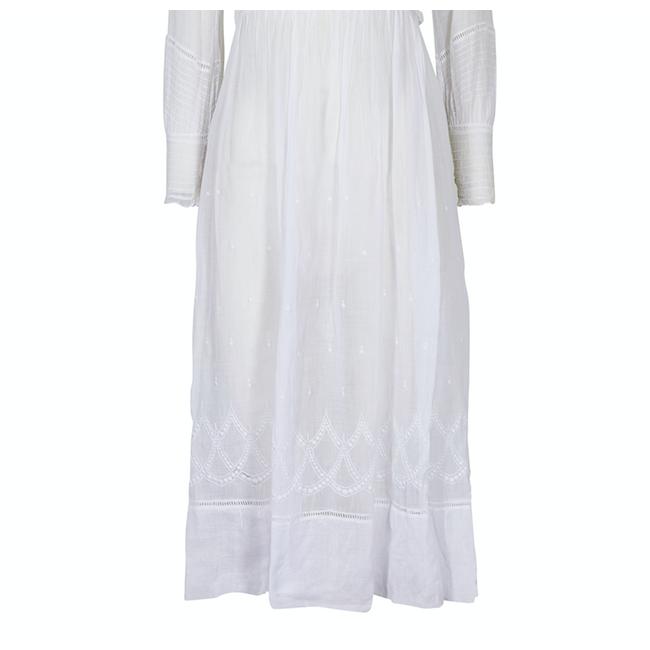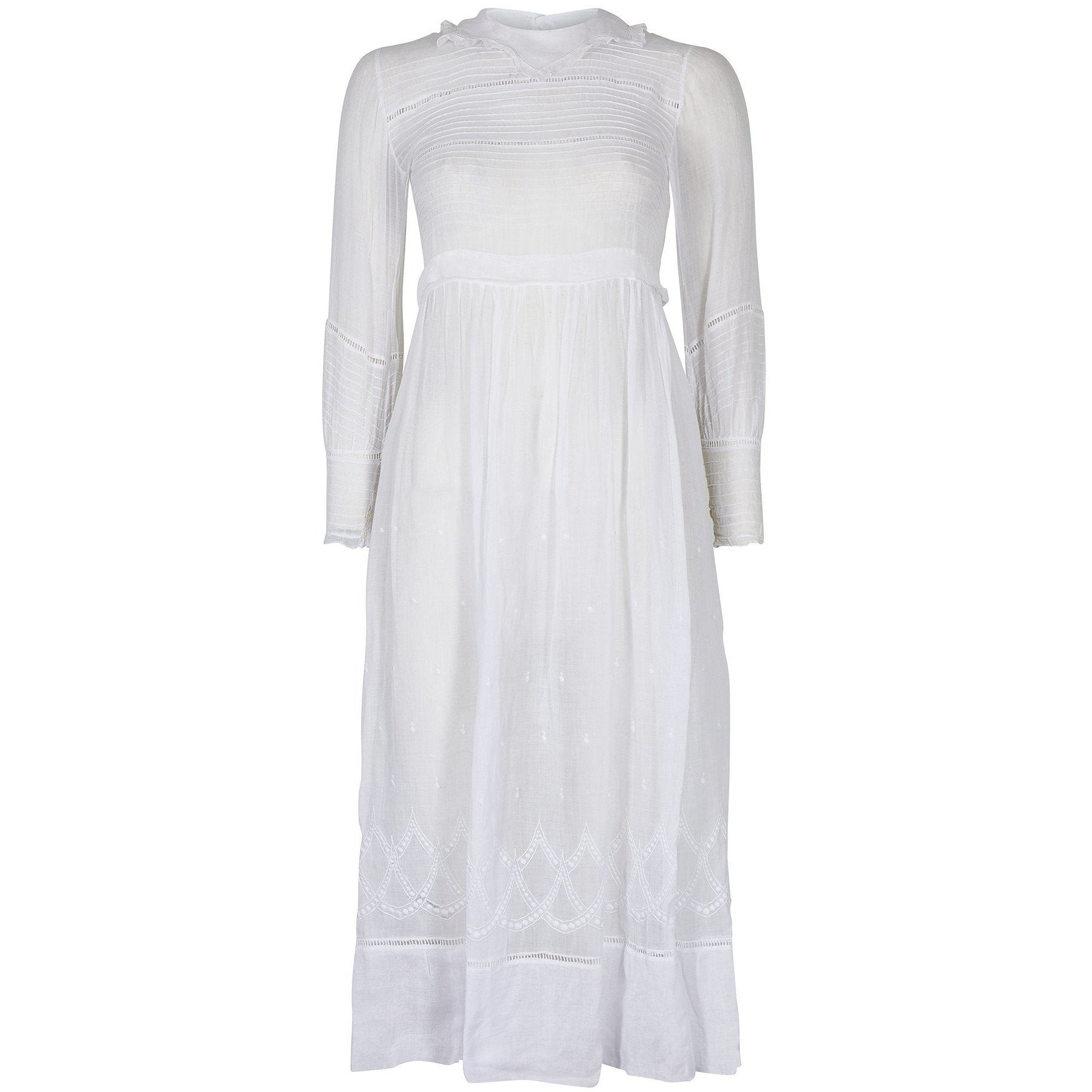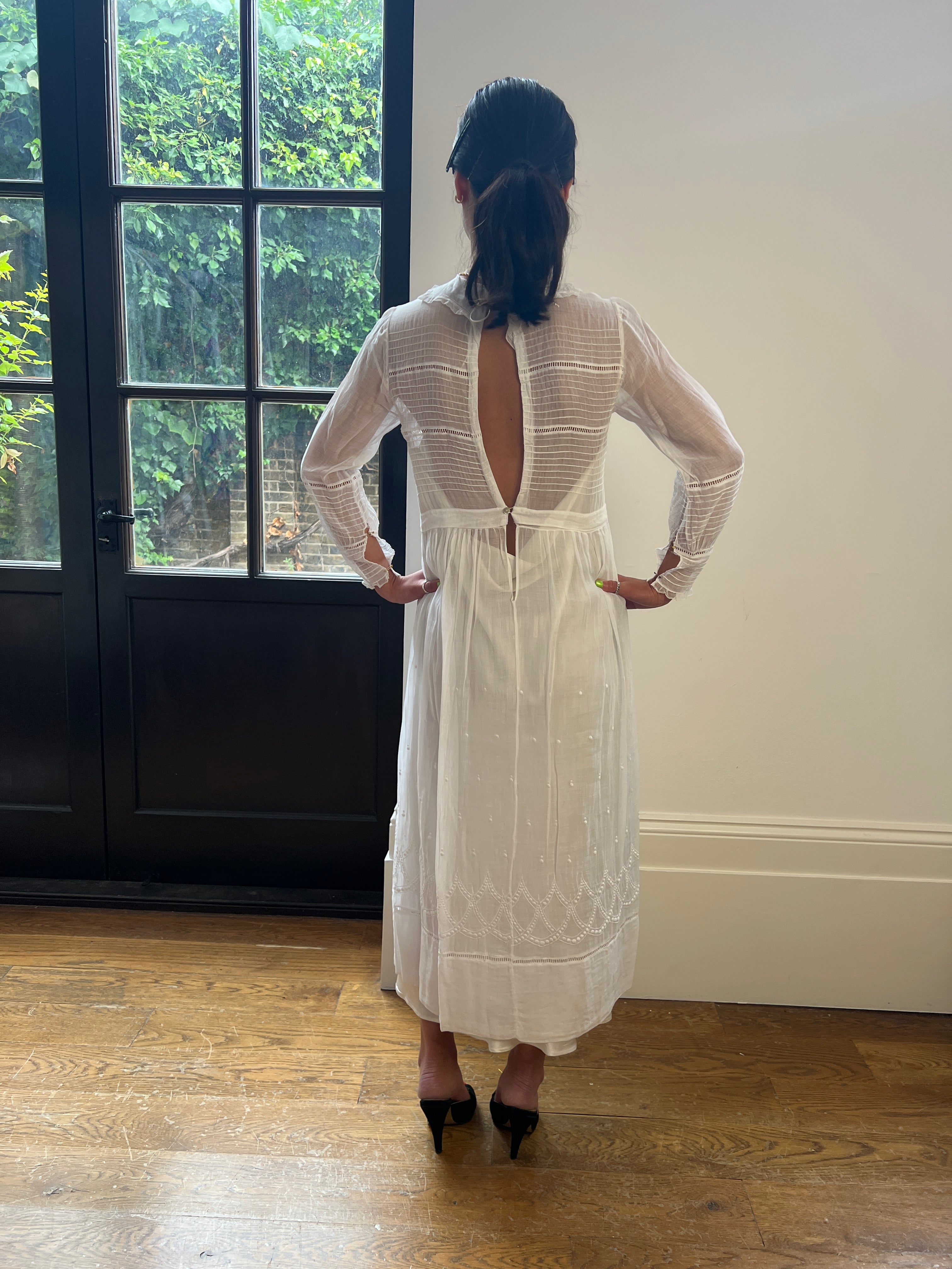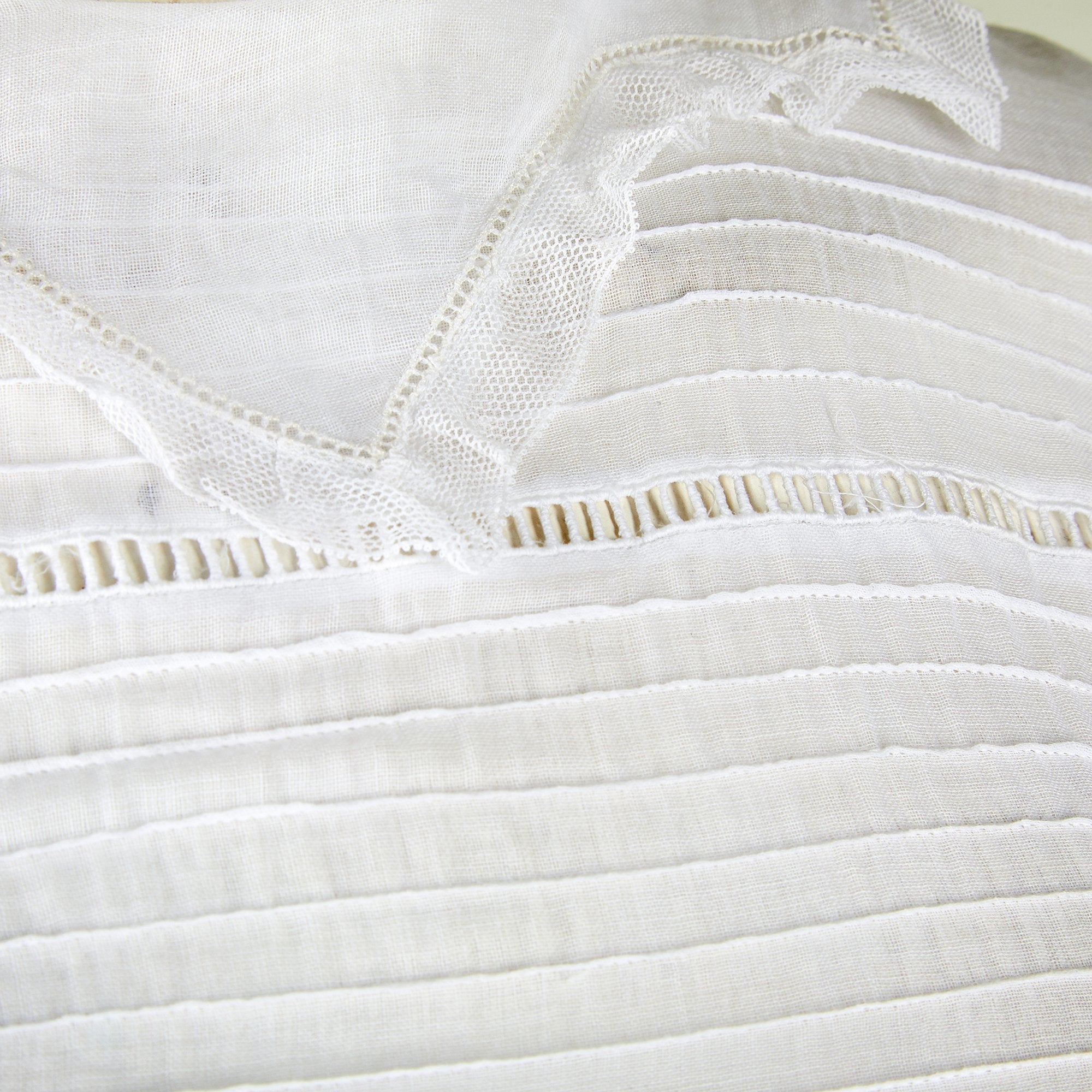 This is a very fine handmade Edwardian to early 1910s cotton white cotton mousseline tea dress. It has wonderful design details; the bodice has a series of horizontal pin tuck pleats with exposed rectangular eyelets on the collar bone. These are further repeated on the elegant tapered sleeves. The high necked collar is delicately edged in cotton tulle and this is repeated on the cuffs. It has the most dainty, genuine pearlescent buttons on the cuffs and those that fasten the dress to the rear. The skirt element is a combination of Swiss dot and an elegant inverted arch design. The dress has an empire waist band and is a straight cut although the skirt is slightly flared.