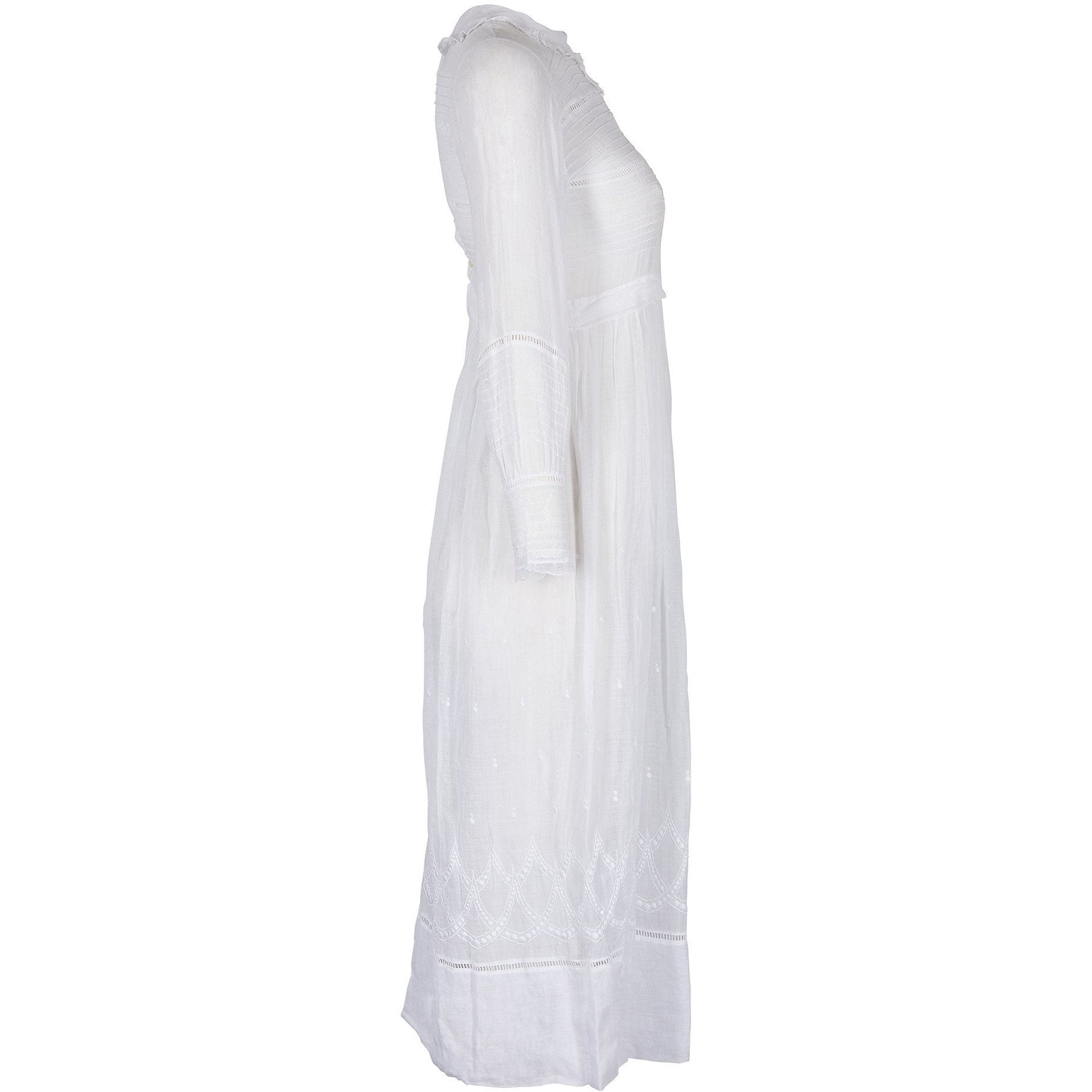 This really is an extraordinary vintage condition. It has a Snow White hue, is freshly laundered and there are no holes or repairs. This versatile antique garment would make a sweet bridal dress or summer cover up and could easily be worn with a range of undergarments or layered with warmer garments in the winter. It will best fit for round a UK size 8 but particularly someone who is petite in stature and under 5'3". Our model is a UK 6-8 and 5ft 4in. (163cm) and this dress was slightly roomy on her. We placed a slip underneath this dress for some extra coverage.