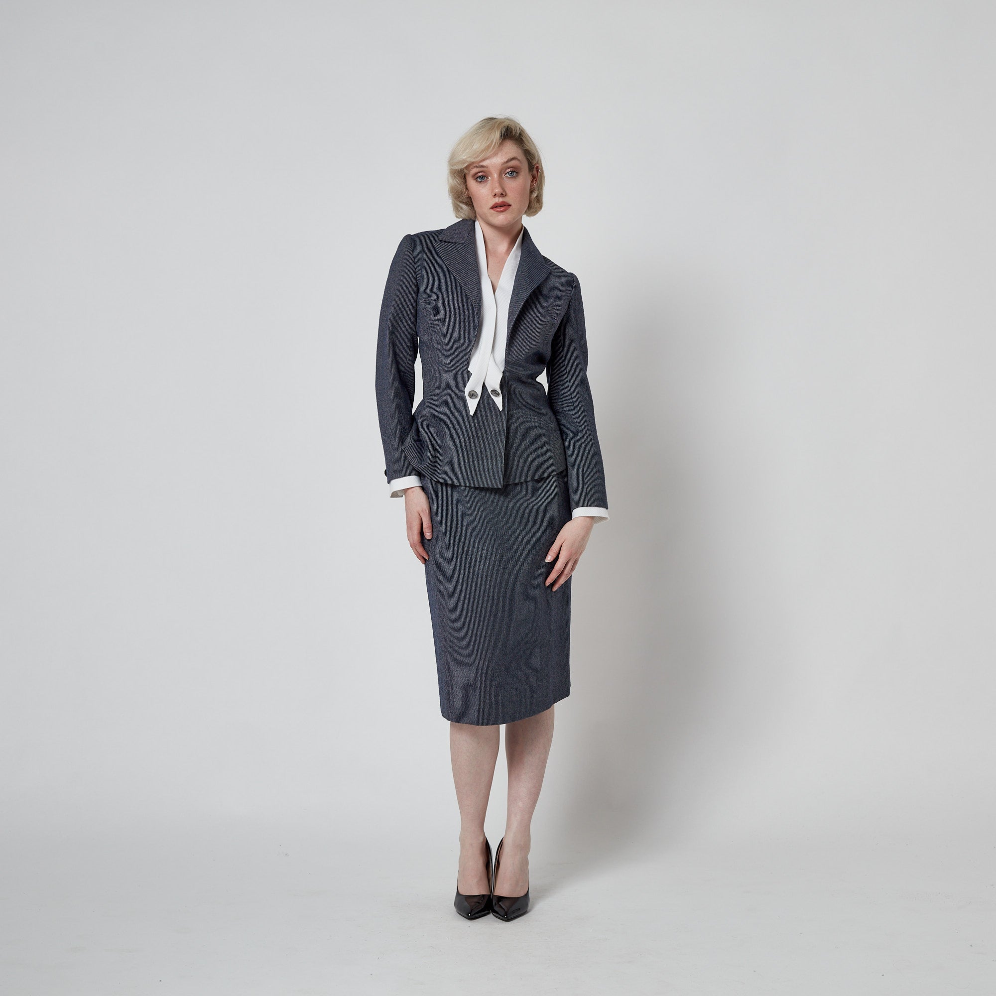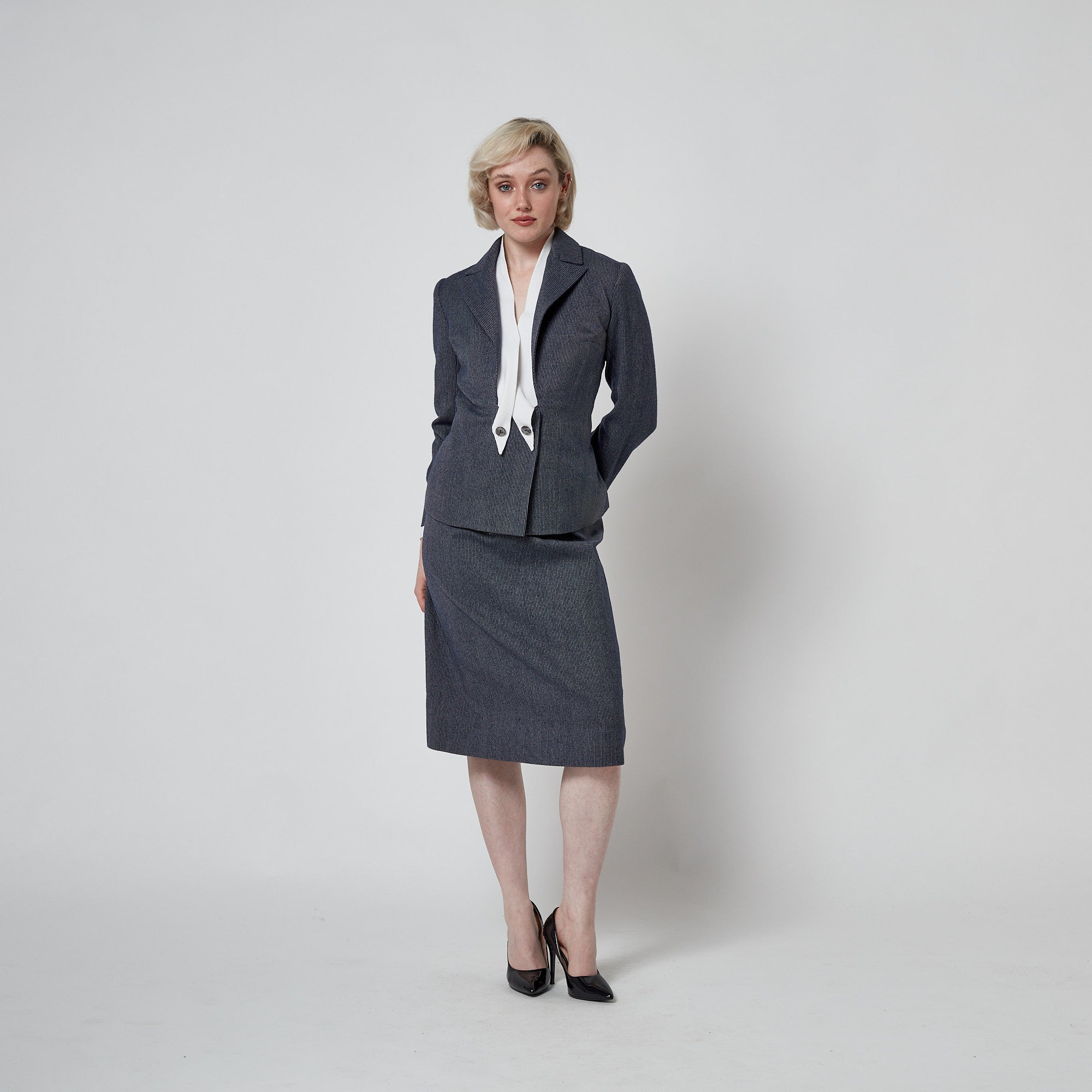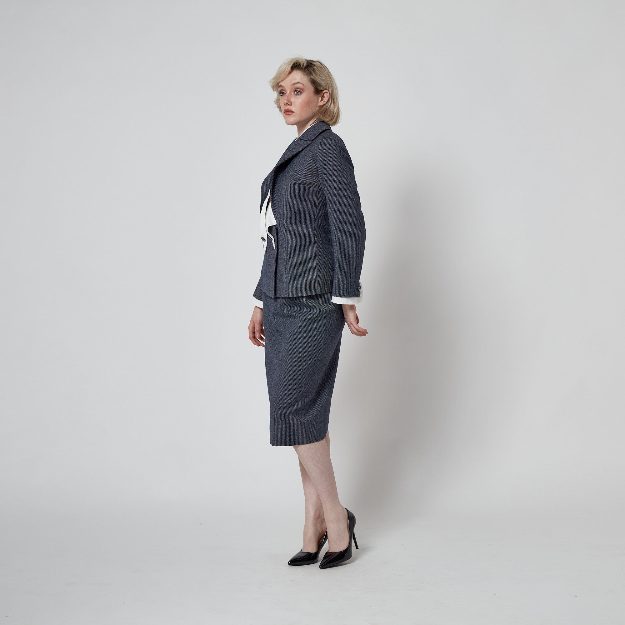 Renowned for its refined femininity and masterful tailoring, Carven built its haute couture legacy on sculpted silhouettes that balanced structure with elegance. This late 1960s to early 1970s Carven haute couture skirt suit is crafted from navy wool with a narrow pinstripe formed from tiny dashed lines, lending subtle texture and depth to the cloth. Of complex construction, the jacket is beautifully shaped with a wide pointed collar that echoes the curved lines of the design, a tightly nipped-in waist and softly flared hips. A trompe-l’œil white “shirt” is integrated beneath the jacket, rendered in a thick cotton fabric with a shawl collar just visible behind the lapels. It reappears at the centre waist, forming two crossing points that fasten onto the exterior of the jacket with pearlescent buttons. Additional faux white cuffs emerge at the sleeves, finished with matching buttons. The jacket fastens discreetly below the shirt points with tonal hidden snap closures and is lined in blue-grey satin. The matching skirt is cut from the same pinstripe wool in a high-waisted, below-the-knee A-line silhouette. It fastens at the back with a concealed zip and hook-and-eye and fully lined in coordinating blue-grey satin.