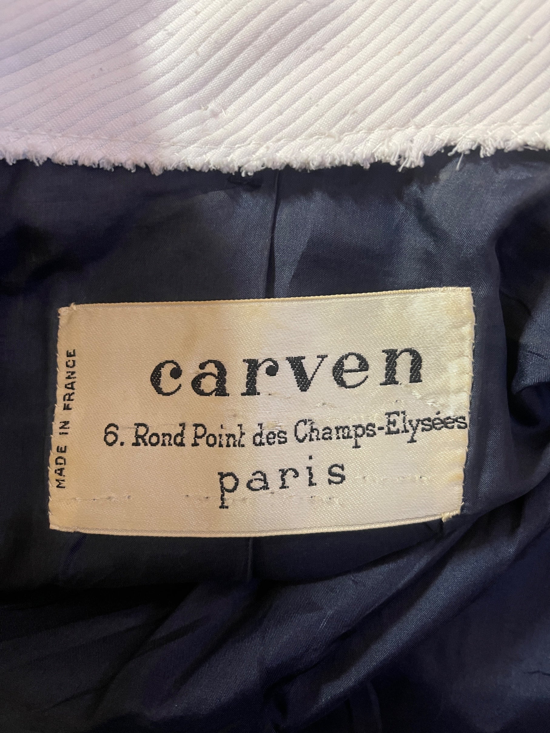 Notes on Designer: Founded in 1945 by Marie-Louise Carven (born Carmen de Tommaso), the House of Carven was among the earliest French fashion houses to take its collections abroad soon after the end of World War II. Carven’s work was especially celebrated for its lightweight fabrics, fresh colors, and garments designed for petite women — a gap she identified from her own experience. Carven staged runway shows internationally, helping establish French ready-to-wear and couture on the global stage. Her 1946 perfume launch for “Ma Griffe” was famously promoted by dropping sample bottles over Paris from parachutes — a now-legendary PR stunt.