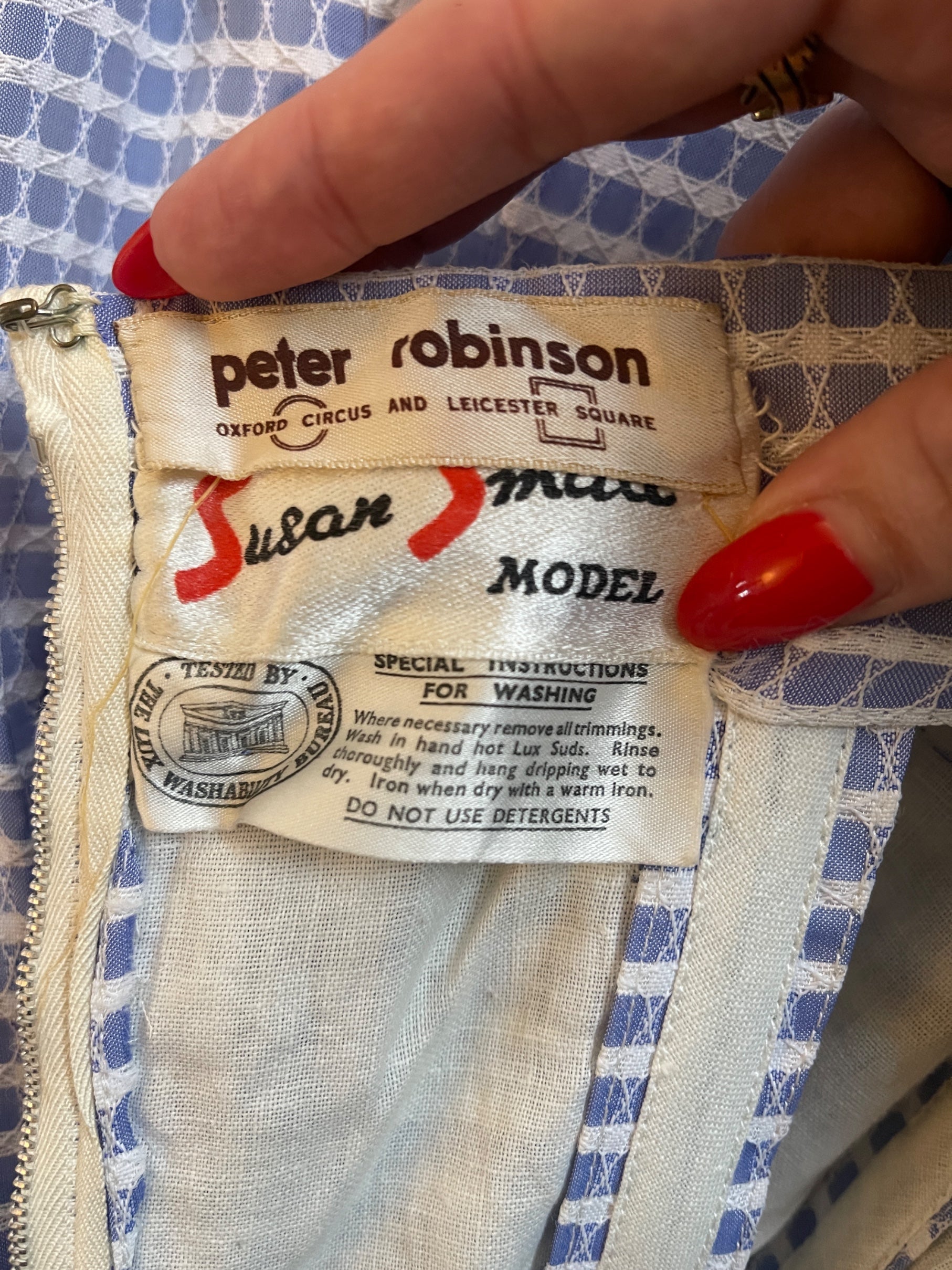 The original label reads “Susan Small - Model”. It also has a Peter Robinson label, an up-market 1960s department store that existed on Oxford Circus and Leicester Square. In truly excellent vintage condition with no issues and suitable for a US size 4 or UK 8 with plenty of give in the hip. Photographed without a petticoat; however, for a fuller flare, it would certainly look sensational with one.