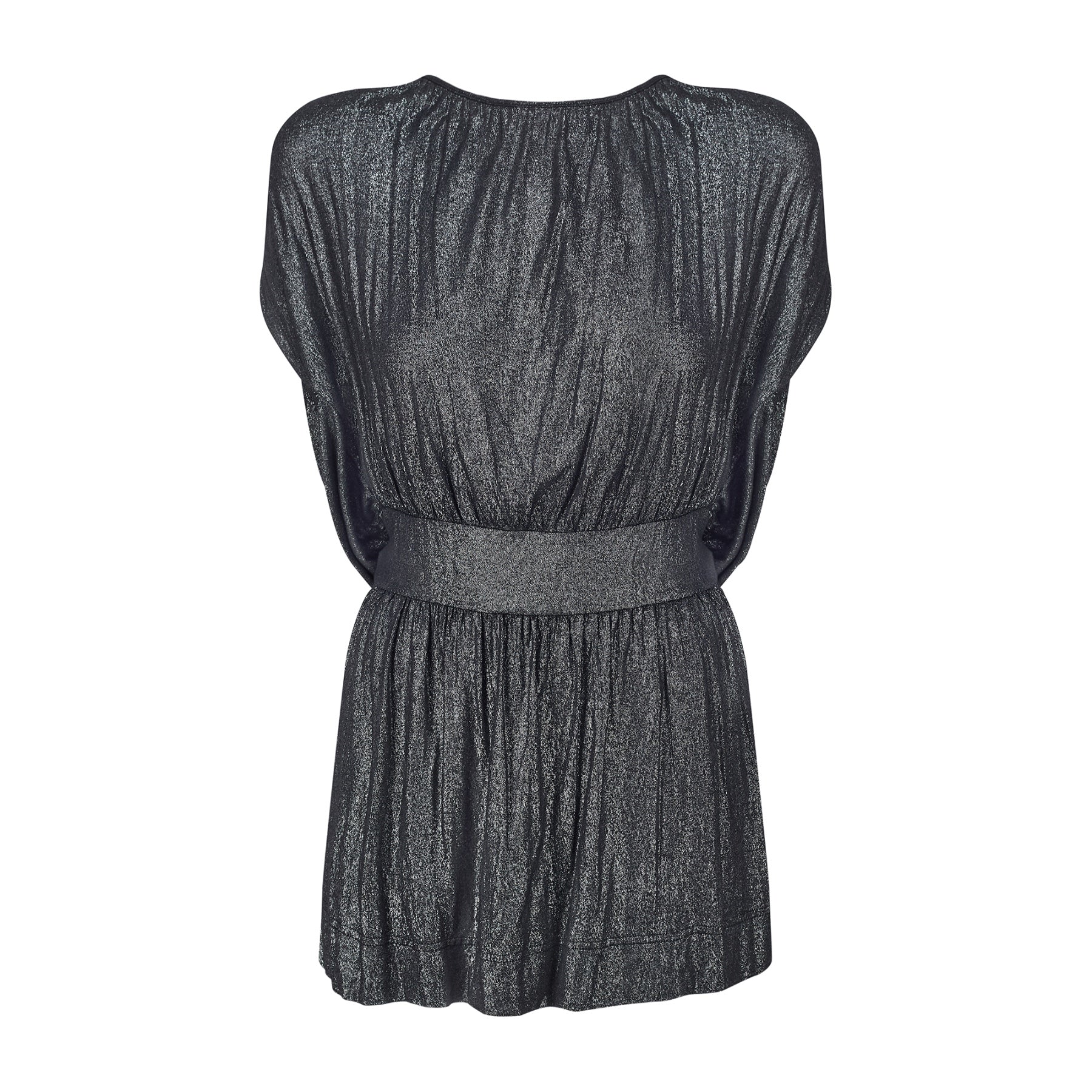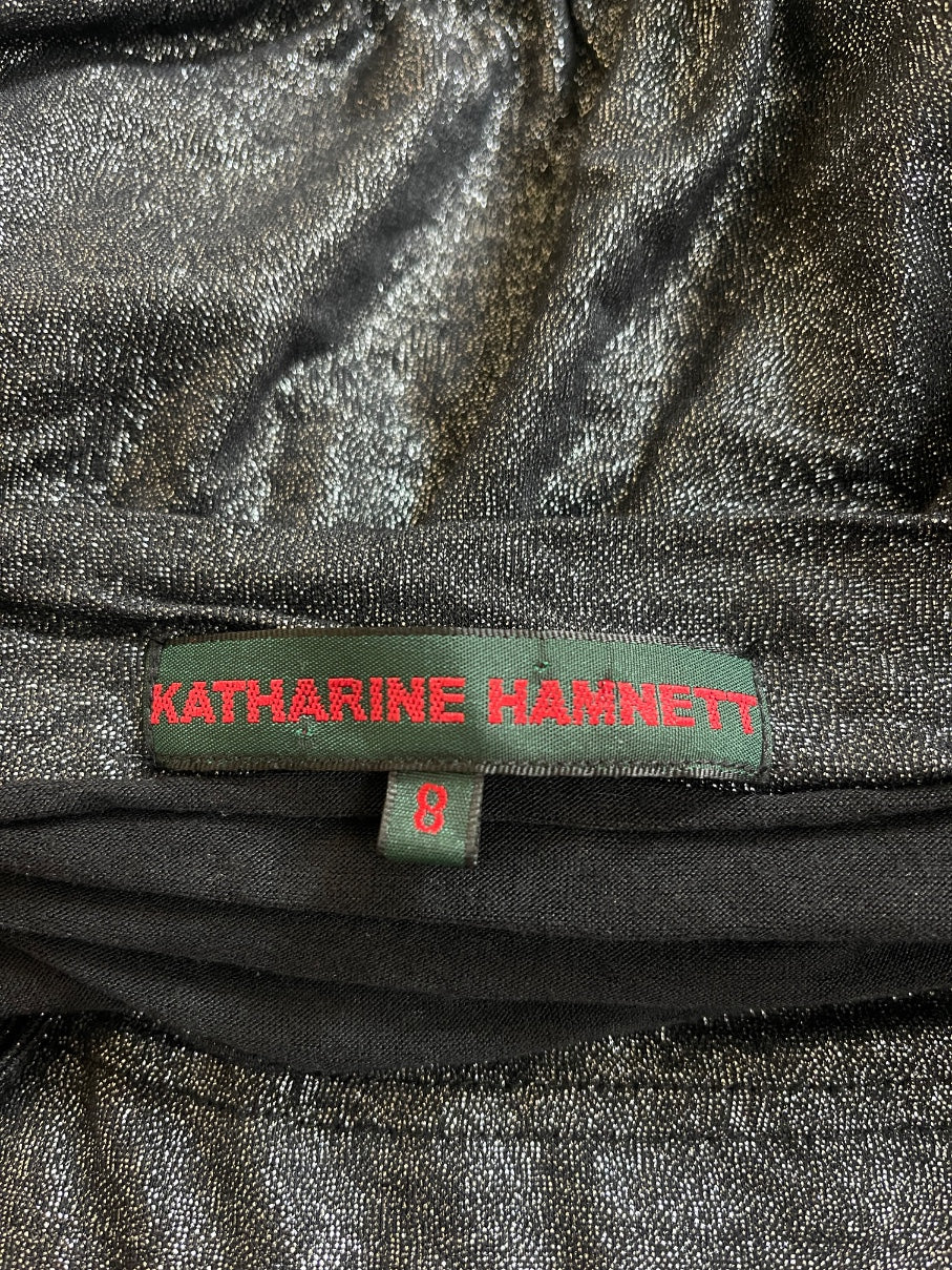 This party-ready mini-dress was designed by iconic British brand Katharine Hamnett during its 1990s heyday. English fashion designer Katharine E. Hamnett founded her namesake label in 1979 and was a founding design member of the British Fashion Council when it began in 1984. Taking its lead from disco dresses of the 1970s, this playful dress is generously cut from a fluid black jersey woven with metallic silver thread which shimmers as it catches the light. It is tailored to sway as the wearer moves; the fabric is ruched and gathered at the shoulders, and cinched at the waist by a wide waistband. The open back has a cowl cut and is secured at the back by a coordinating tie. The dress pulls on over the head and is unlined.