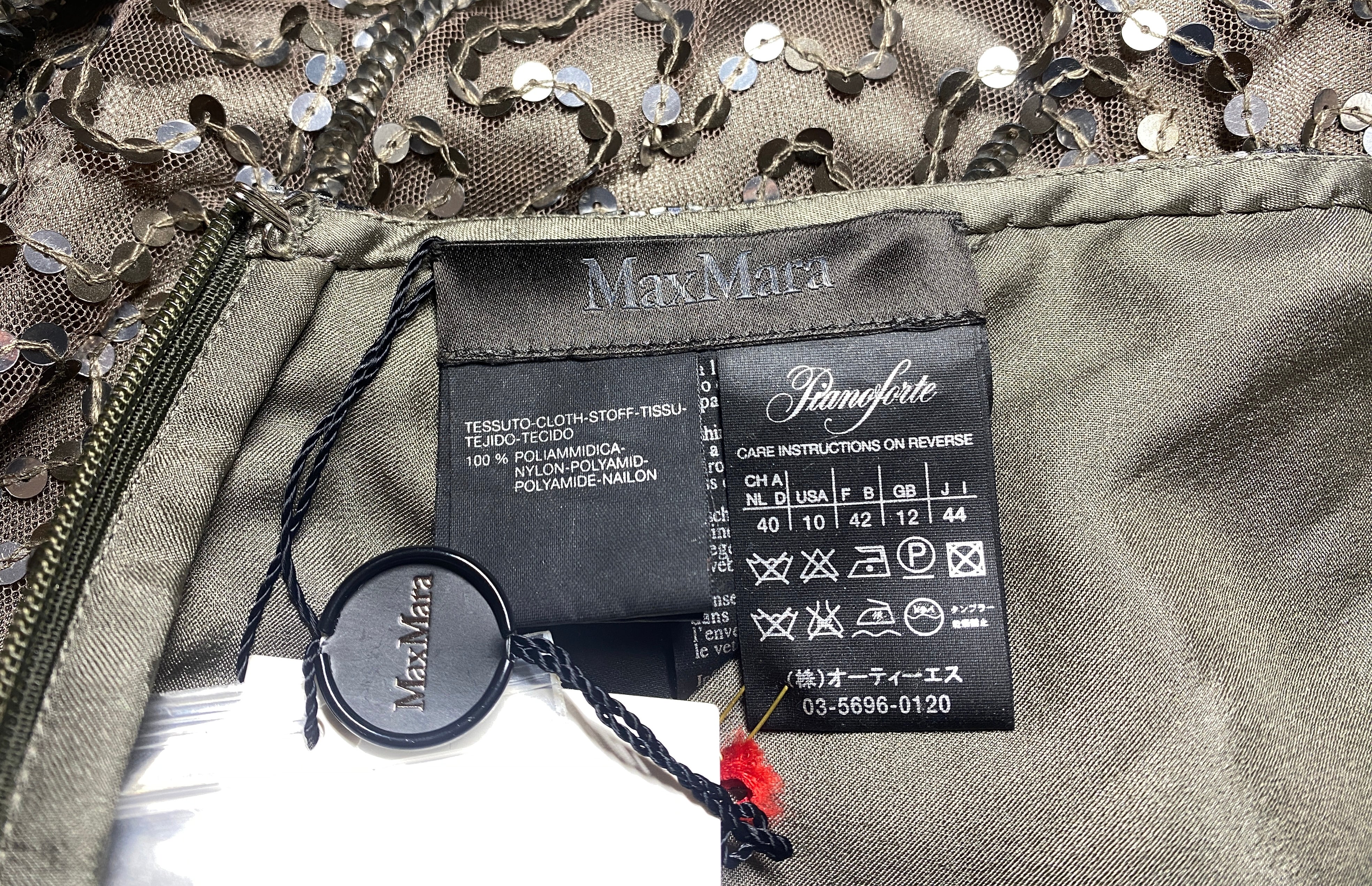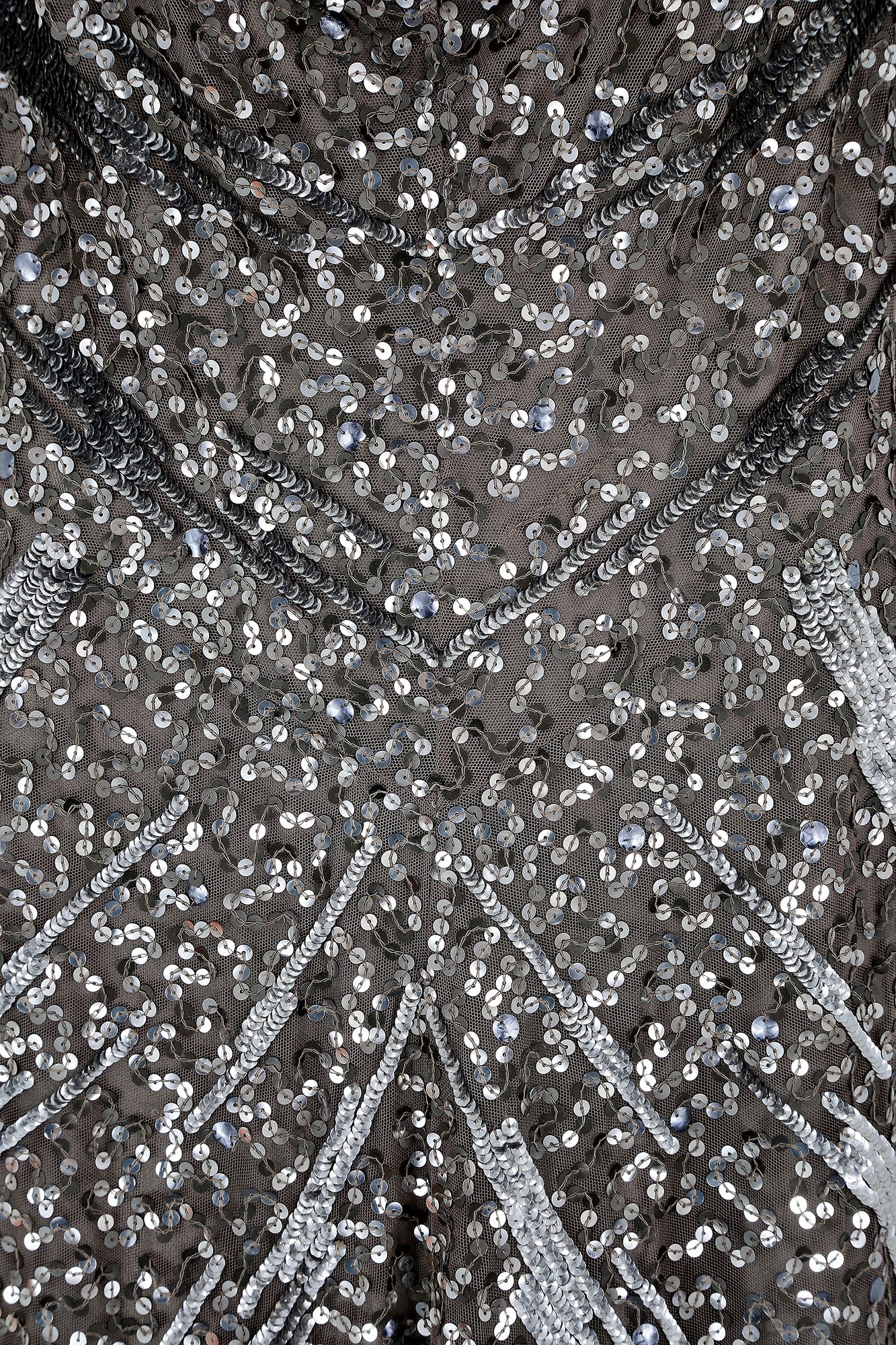You're sure to turn eyes wearing this Max Mara evening gown, circa 2006-2007, just in time for the holiday and awards season. This showstopper of a dress reflects the 2000s Max Mara aesthetic and perfectly encapsulates the 'quiet luxury' trend for timeless investment pieces. It is entirely embellished by hand and adorned allover with 2 types of metallic sequins onto a warm grey mesh. The satin finish lining is visible through the mesh and together with the magnificent arrangement of sequins, provides an elegant multidimensional finish to the dress. A plunging, but not distasteful, halter top secures the dress around the wear's neck for a party ready look. An invisible zipper closes at the middle back of the dress.