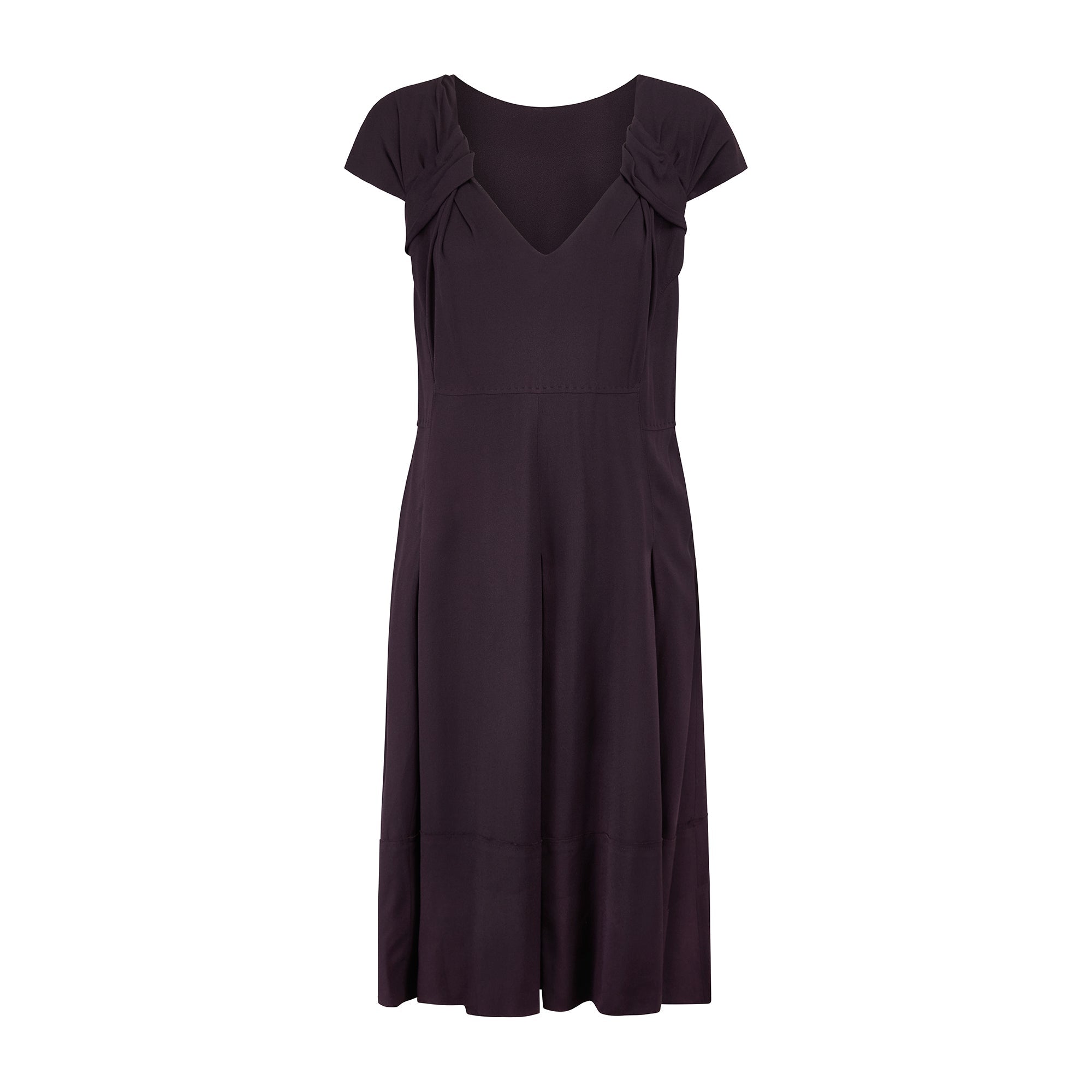 This elegant Prada gown displays all the elevated, feminine trademarks that have become a part of Miuccia Prada’s signature style. Designed in 2007, it is tailored from smooth crepe in a rich, deep plum colourway. Tailored to a 1940s tea-dress shape, the cloth has a fantastic drape and flatteringly skims the curves of the body. It has short-sleeves and a decollétage-revealing V-neckline. The waist is lightly tailored and the skirt falls to the mid-calf with several soft pleats adding movement. At the side of the bust, plum crepe wraps around the edge of the sleeves - a detail typical of the Italian brand’s grown-up take on pretty. This dress is unlined.
