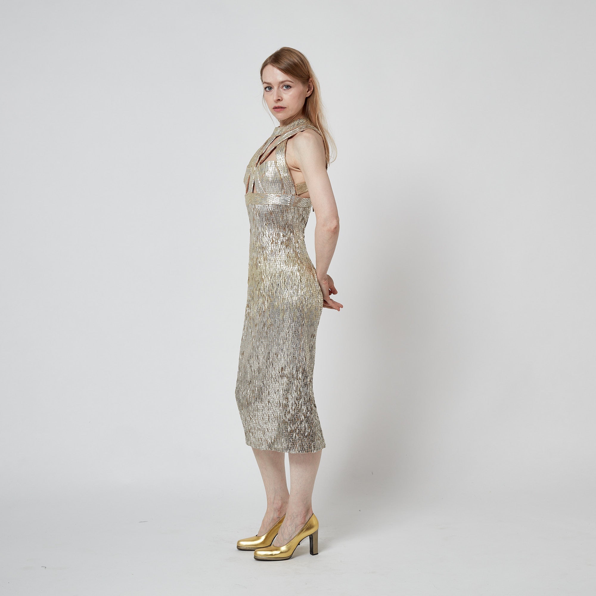 Walking the runway as look 31/57, this dress was a glittering disco-ball in a collection that was monochrome in the majority. Tailored from a fine mesh in a pale nude hue, it has a body-con silhouette with an intricately crafted cage top. The dress is elaborately sequinned all-over with large rectangular paillettes in a champagne hue that look silver or gold depending on how the light hits. Up close, the embellishment is incredibly detailed. The paillettes are all individually stitched at each end with a tonal thread onto the mesh. At the rear, the cage top gives way to two chunky embellished straps which meet in the middle of the back. The strap which forms a choker at the neck crosses the back straps and is secured under the arm with hook-and-eye clasps. The dress is unlined. It fastens at the centre of the back with an exposed gold-tone zip and chunky gold-tone zip-pull.