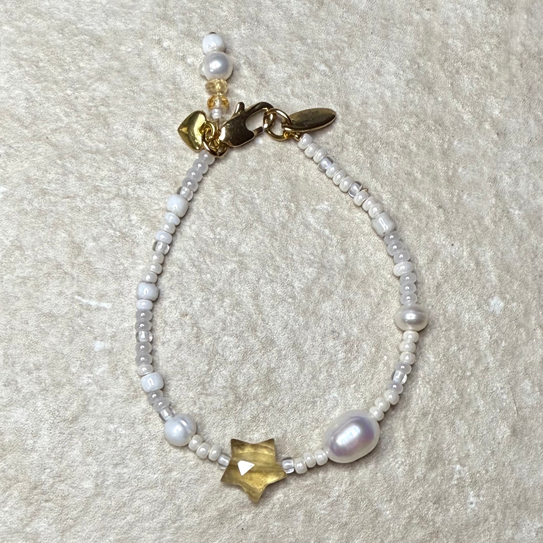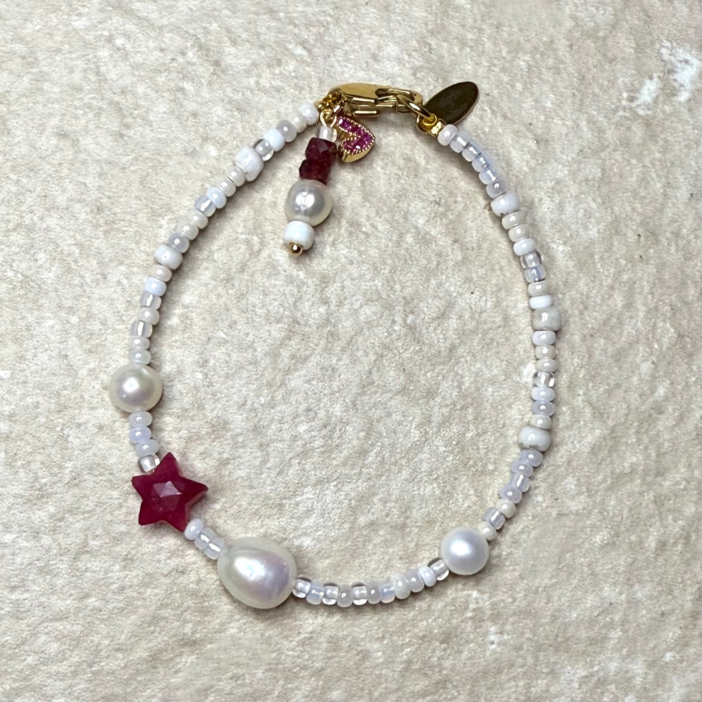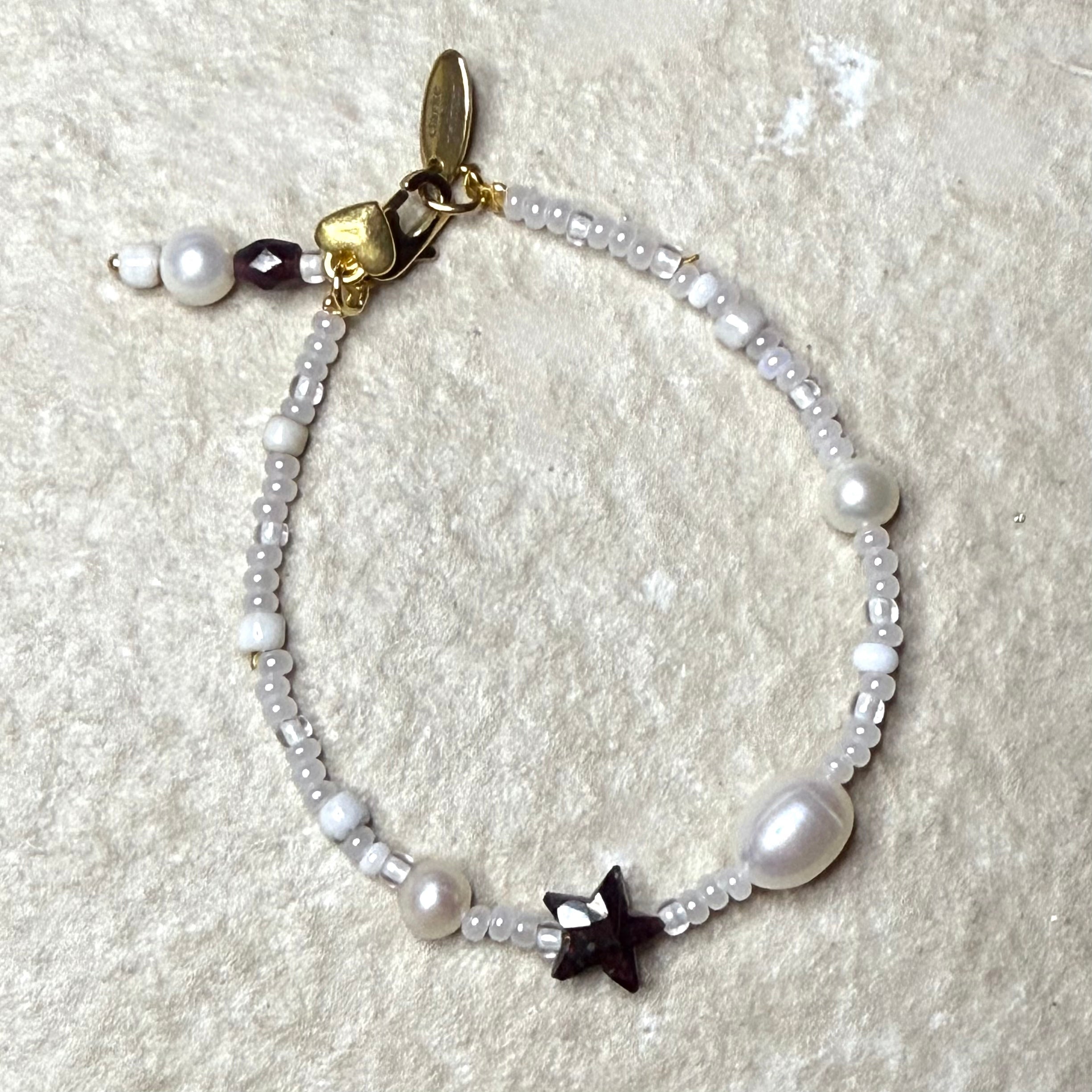 Handmade from white & pearl shades of miyuki glass beads with real round pearls a large oval pearl, a handcut gemstone Star.  It has a lobster clasp, gemstone & pearl charm. Add an initial if you wish.