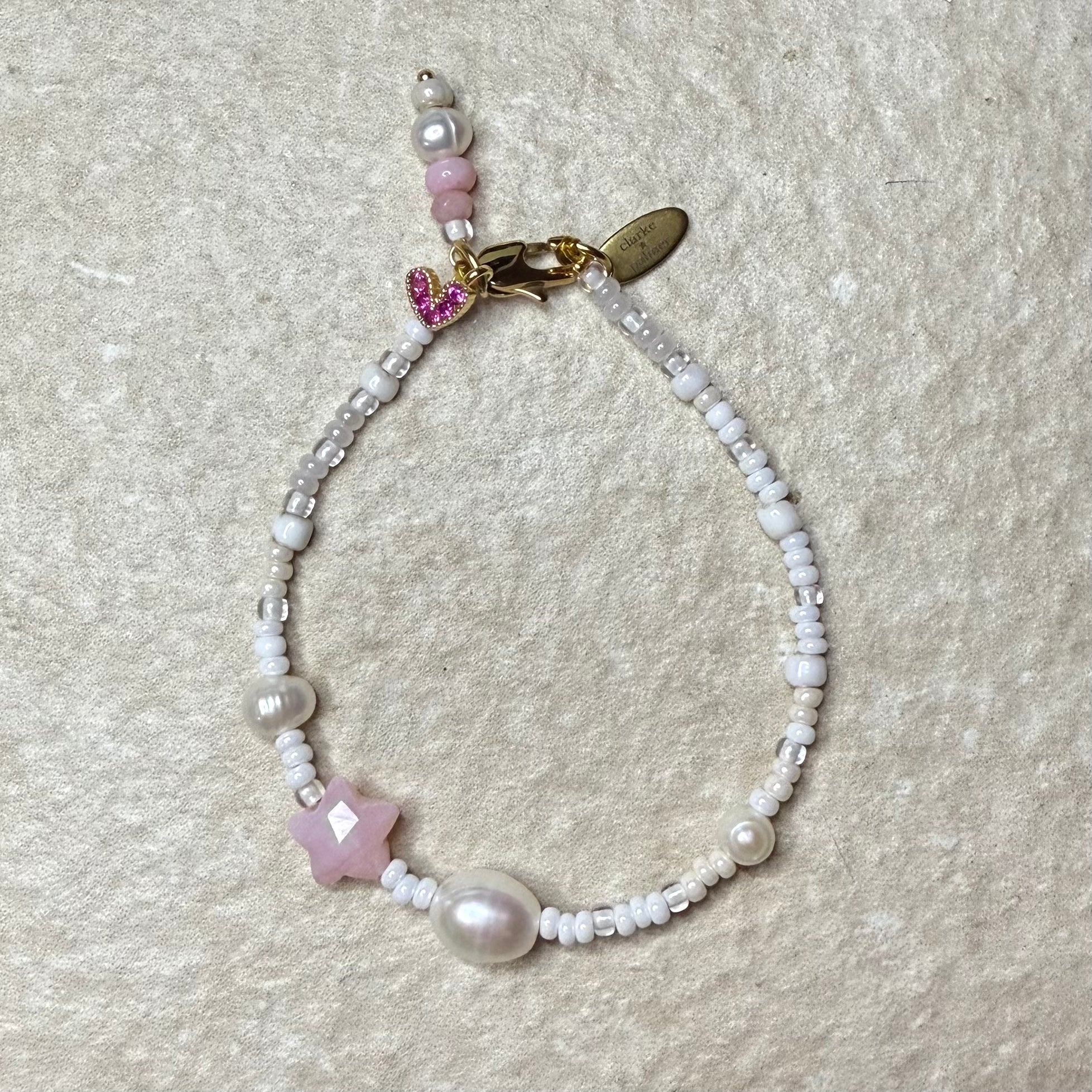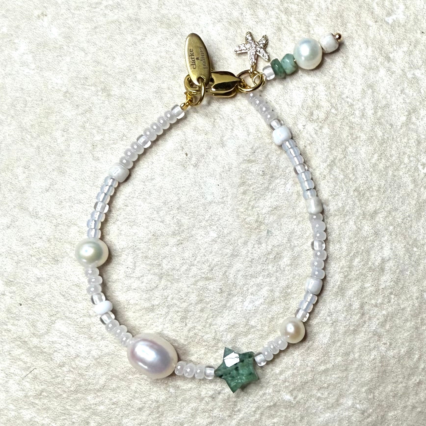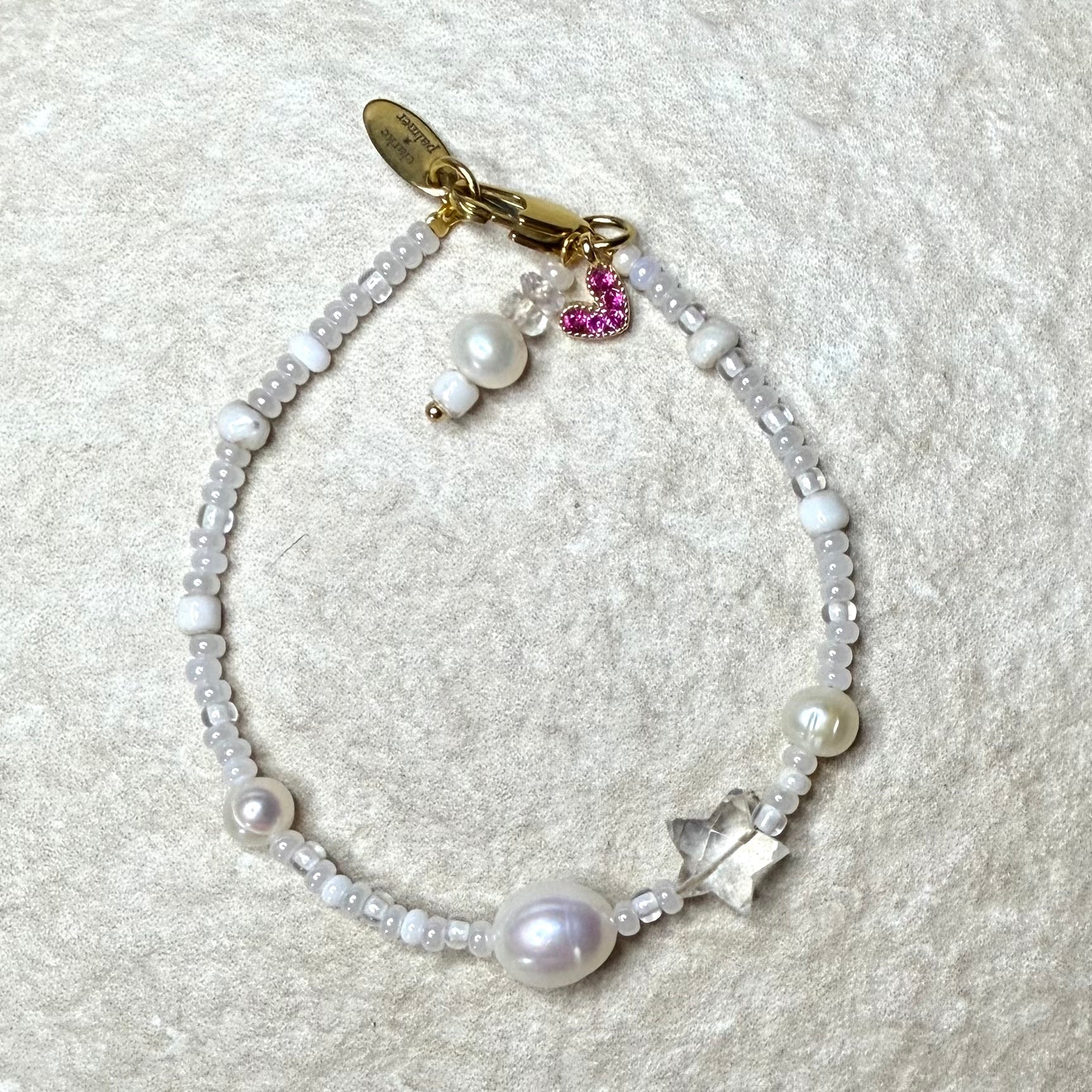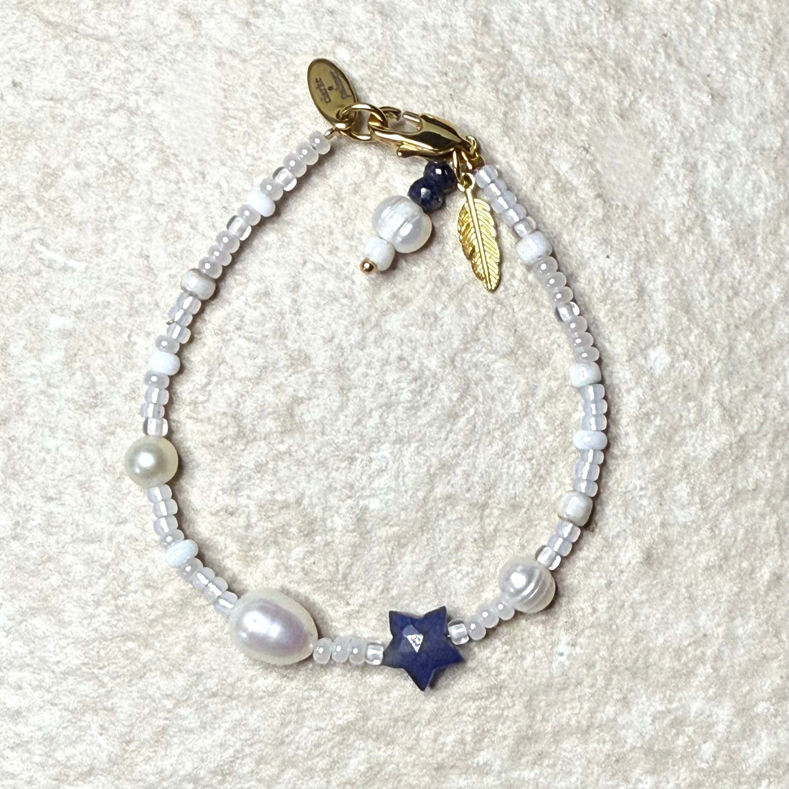 Handmade from white & pearl shades of miyuki glass beads with real round pearls a large oval pearl, a handcut gemstone Star.  It has a lobster clasp, gemstone & pearl charm. Add an initial if you wish.