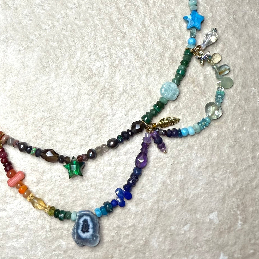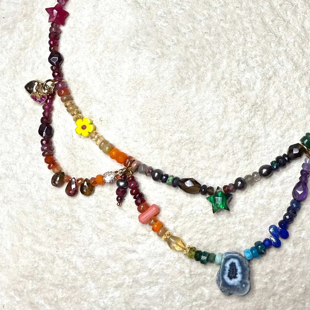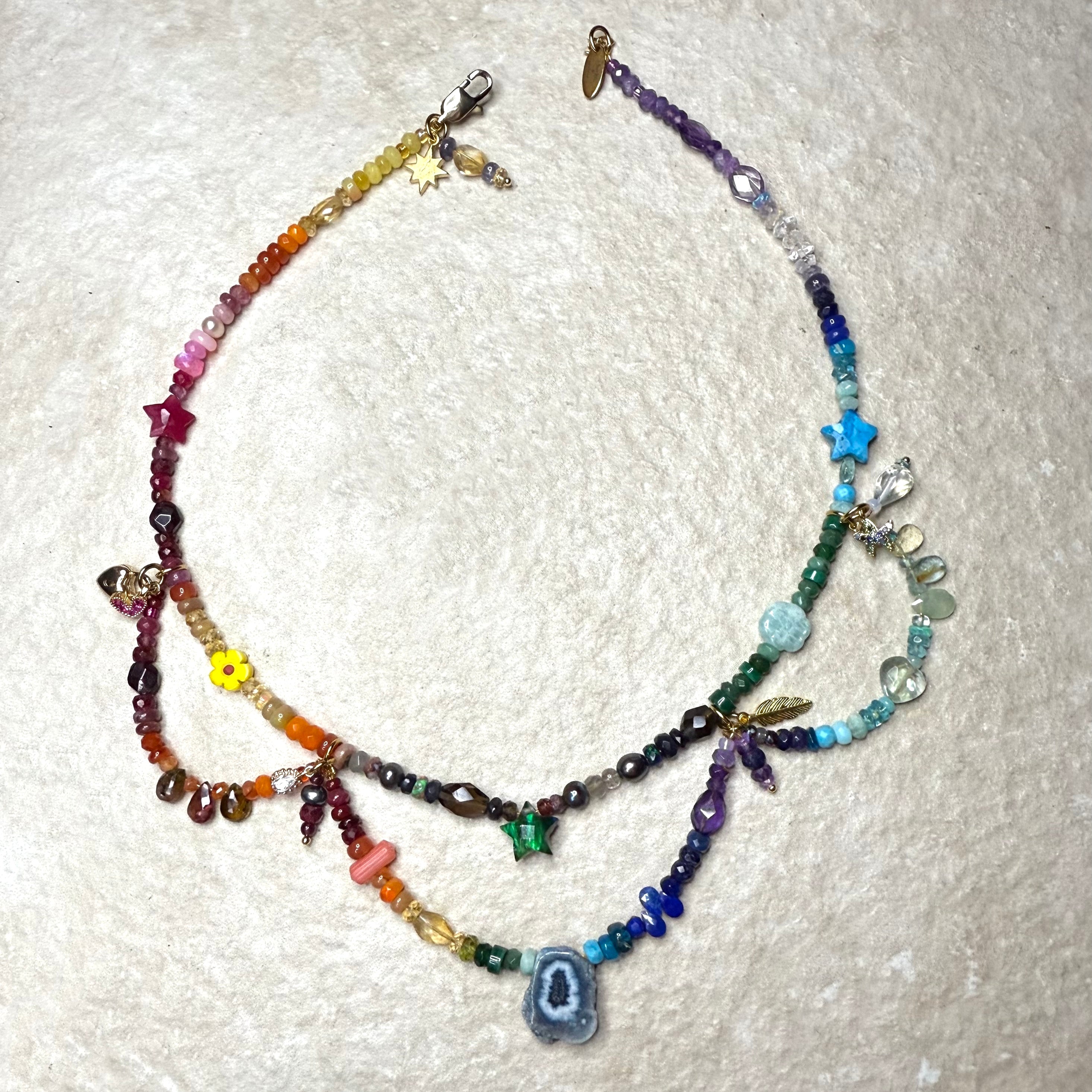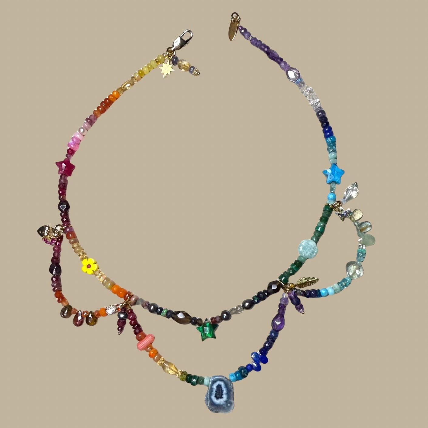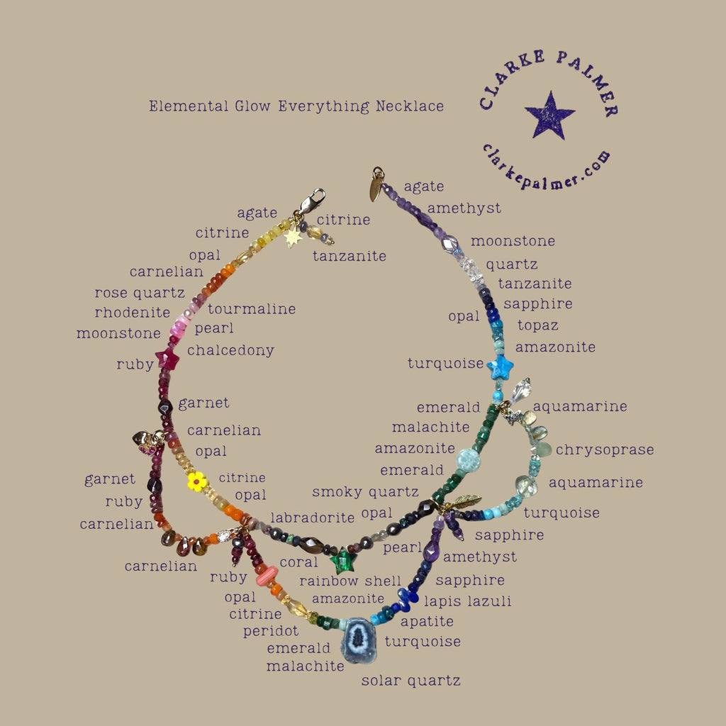 Our Elemental Glow Everything Necklace is a luminous celebration of the earth’s treasures, where rainbow hues flow seamlessly into one another like an aurora captured in motion.