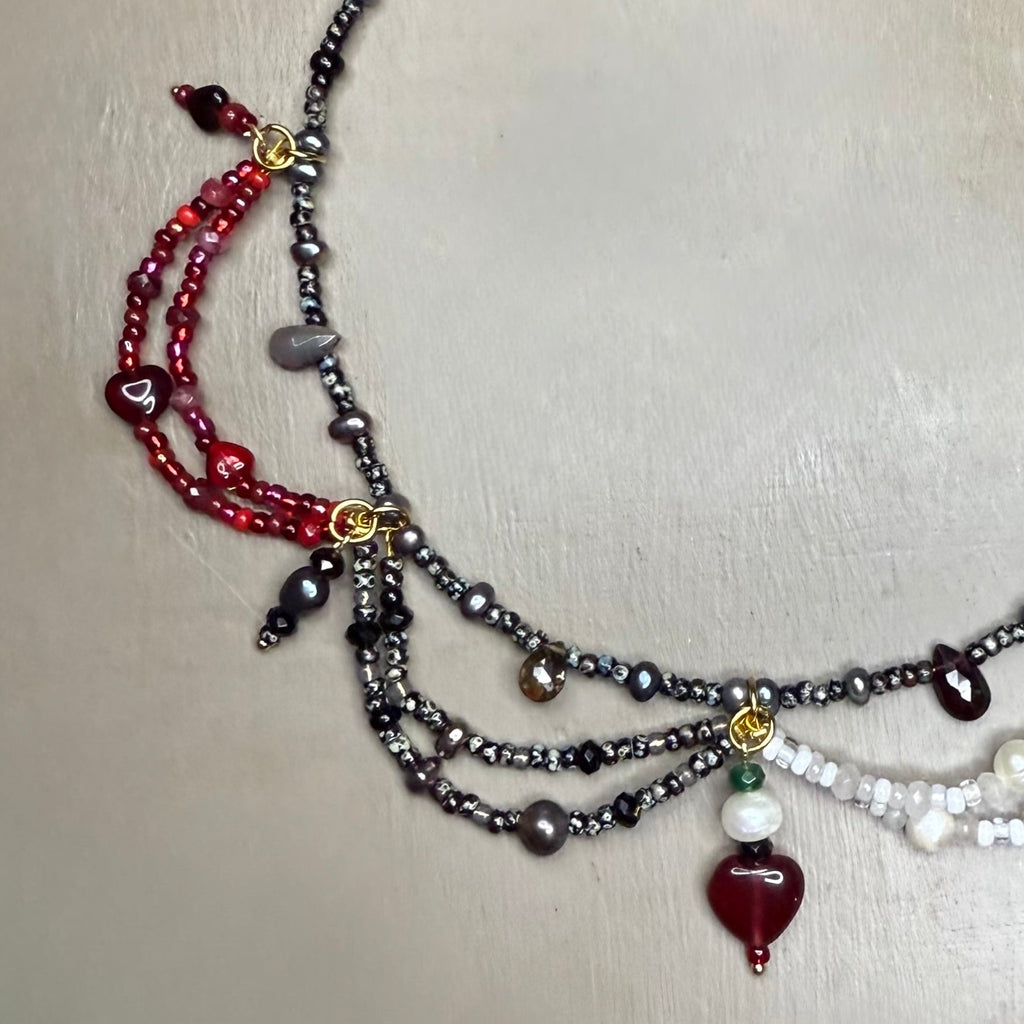 Praying for a positive peace process in Gaza. Including ruby, chalcedony, spinel, black pearls, quartz, moonstone, white pearls and emerald, this necklace celebrates the preciousness of Palestine and its people.