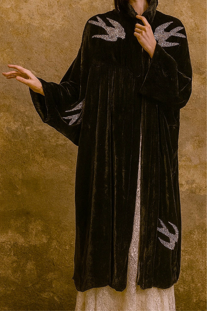 This unique 1920s Art Deco silk Velour coat features draped batwing draped sleeves and a pleated distinctive yolk seem creating a distinctive, flowing silhouette. Made from the softest silk, it offers a long, loose fit for comfortable elegance. The coat fastens at the front and is adorned with an exquisite rhinestone pattern of swallows murmuring across the back and front, exemplifying exceptional craftsmanship and vintage charm. Fully lined in a delicate print Silk.