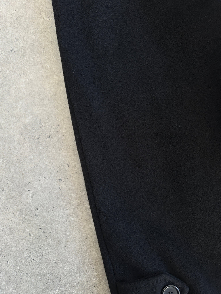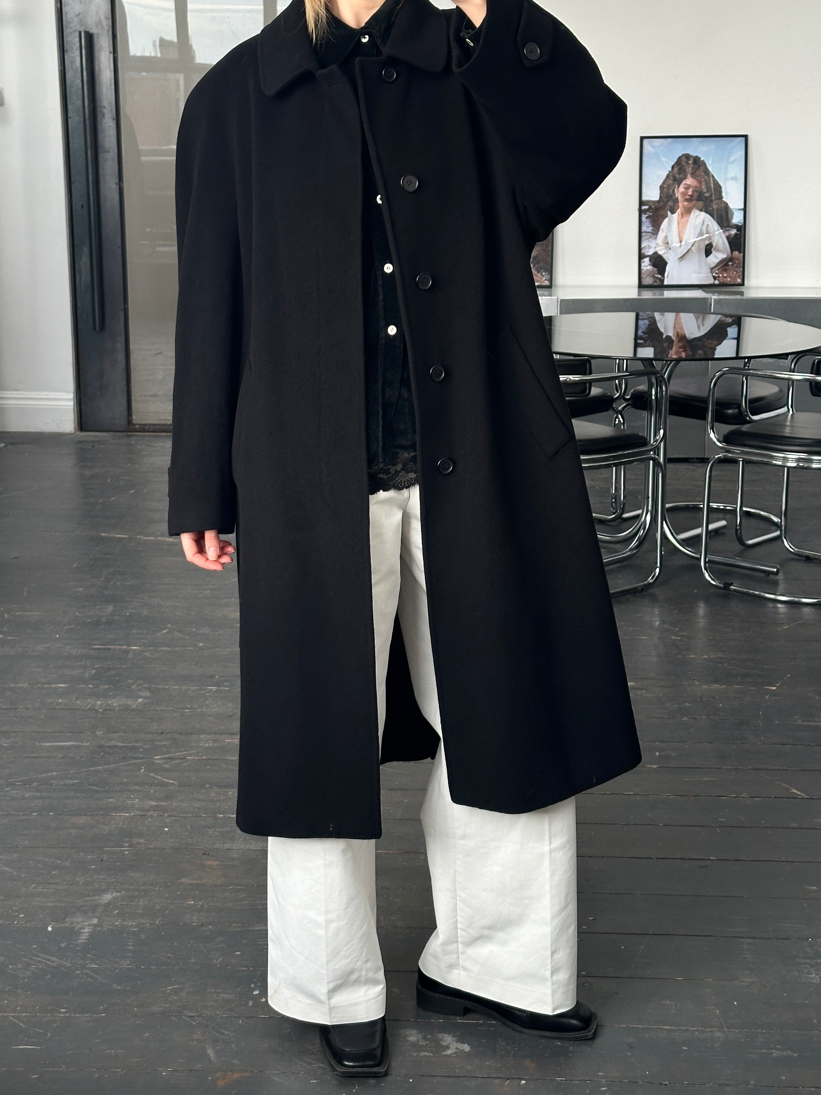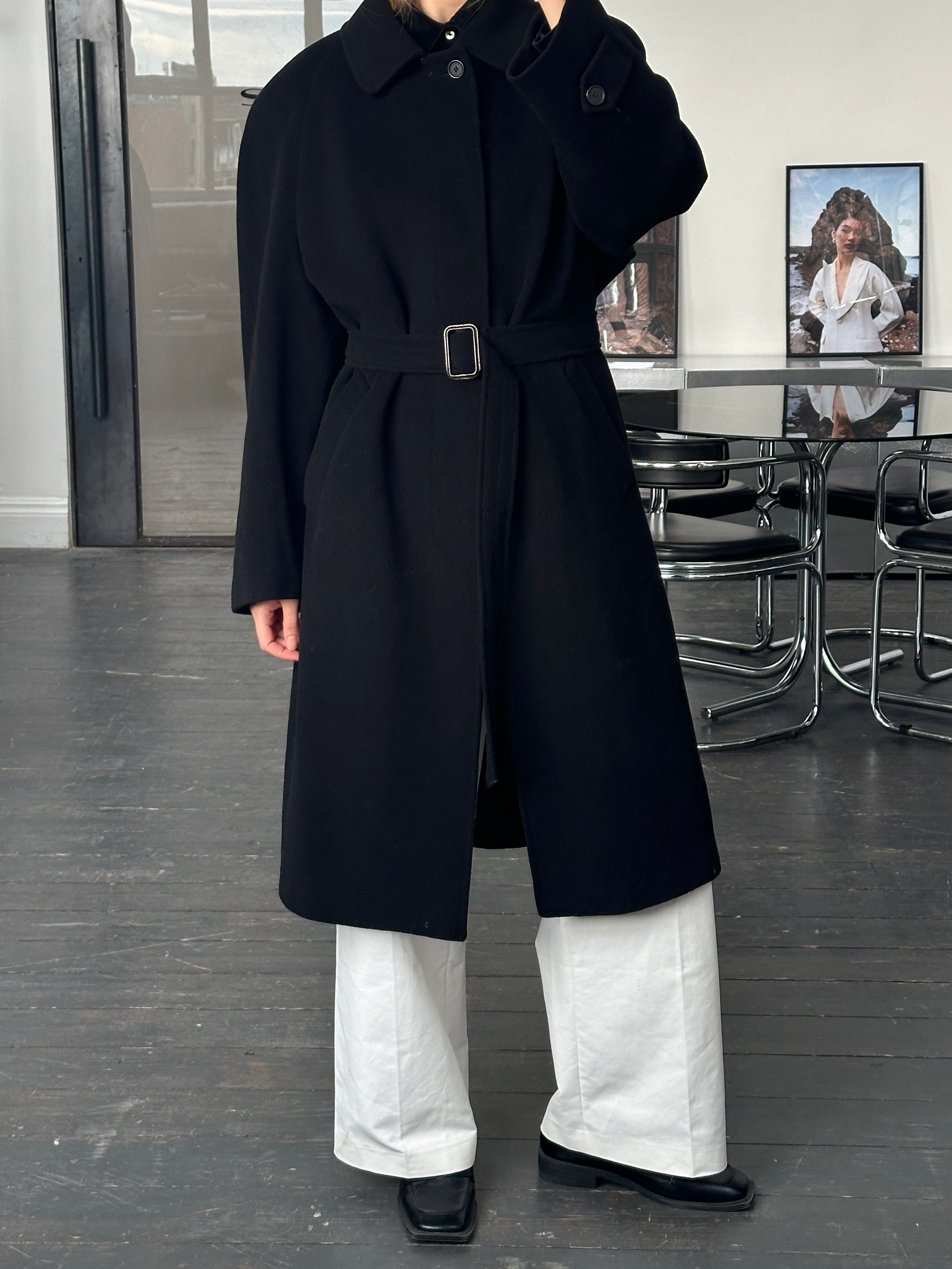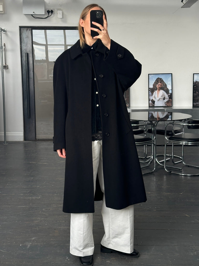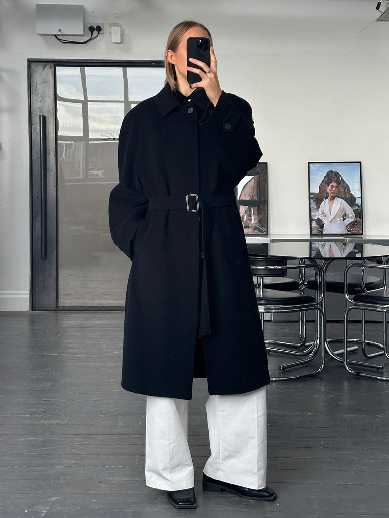 Vintage 1990s black concealed-placket Pennesi coat in a clean minimal silhouette, crafted in Italy with a soft wool cashmere blend. Refined and timeless, this overcoat offers an easy oversized drape and a belted waist for structure.