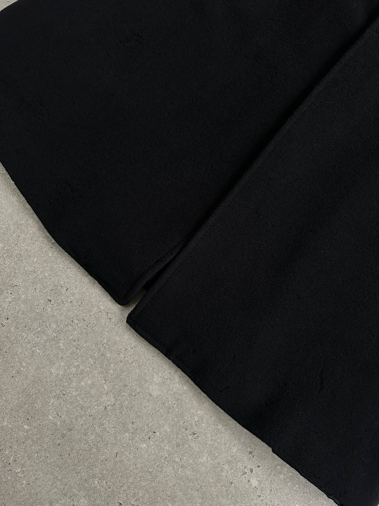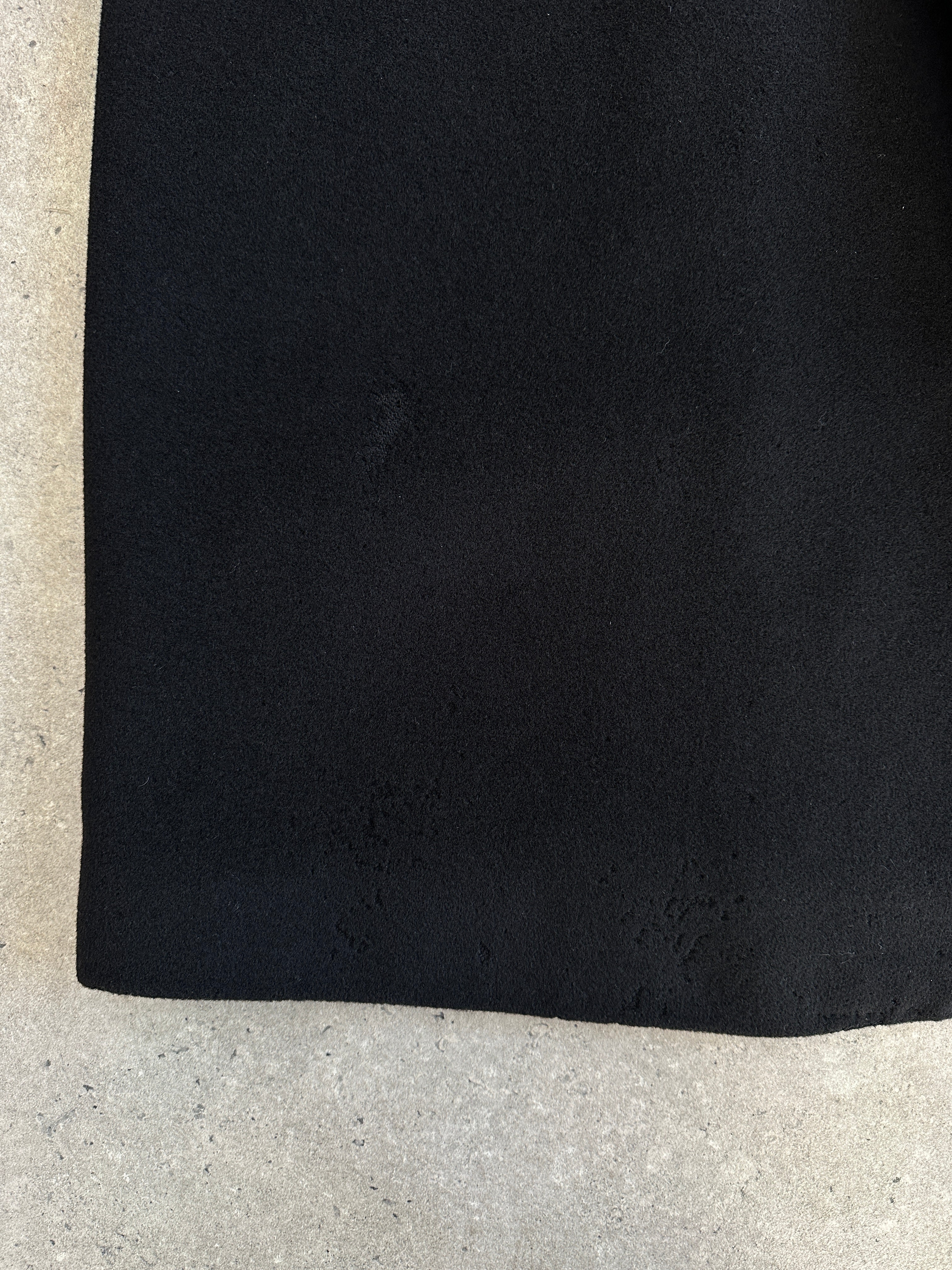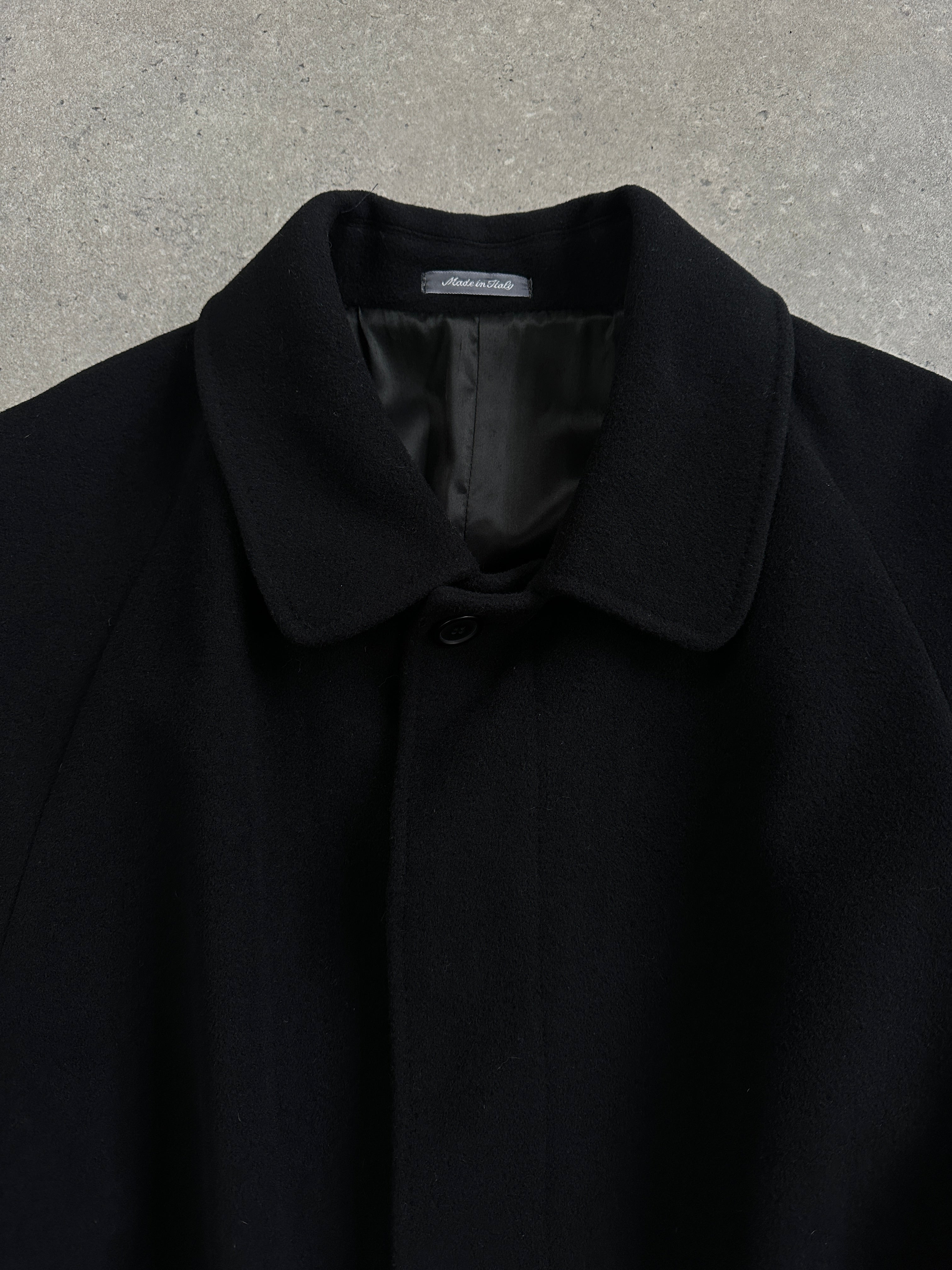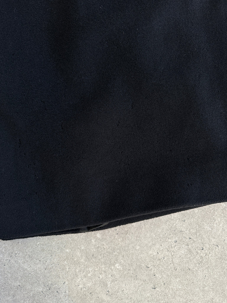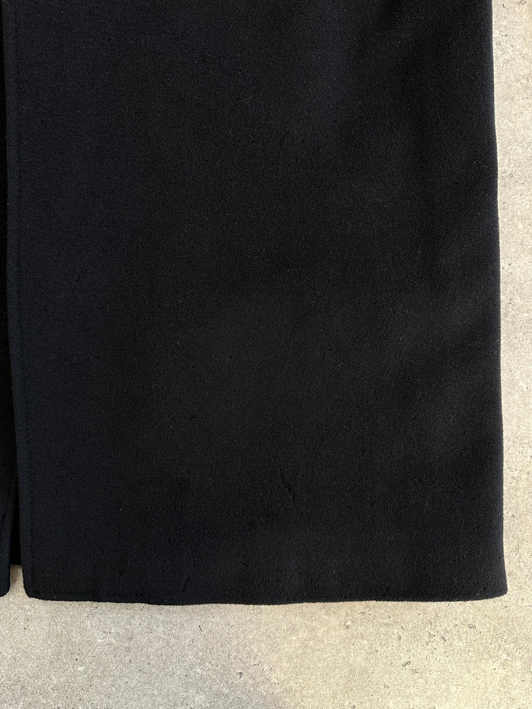 Vintage 1990s black concealed-placket Pennesi coat in a clean minimal silhouette, crafted in Italy with a soft wool cashmere blend. Refined and timeless, this overcoat offers an easy oversized drape and a belted waist for structure.