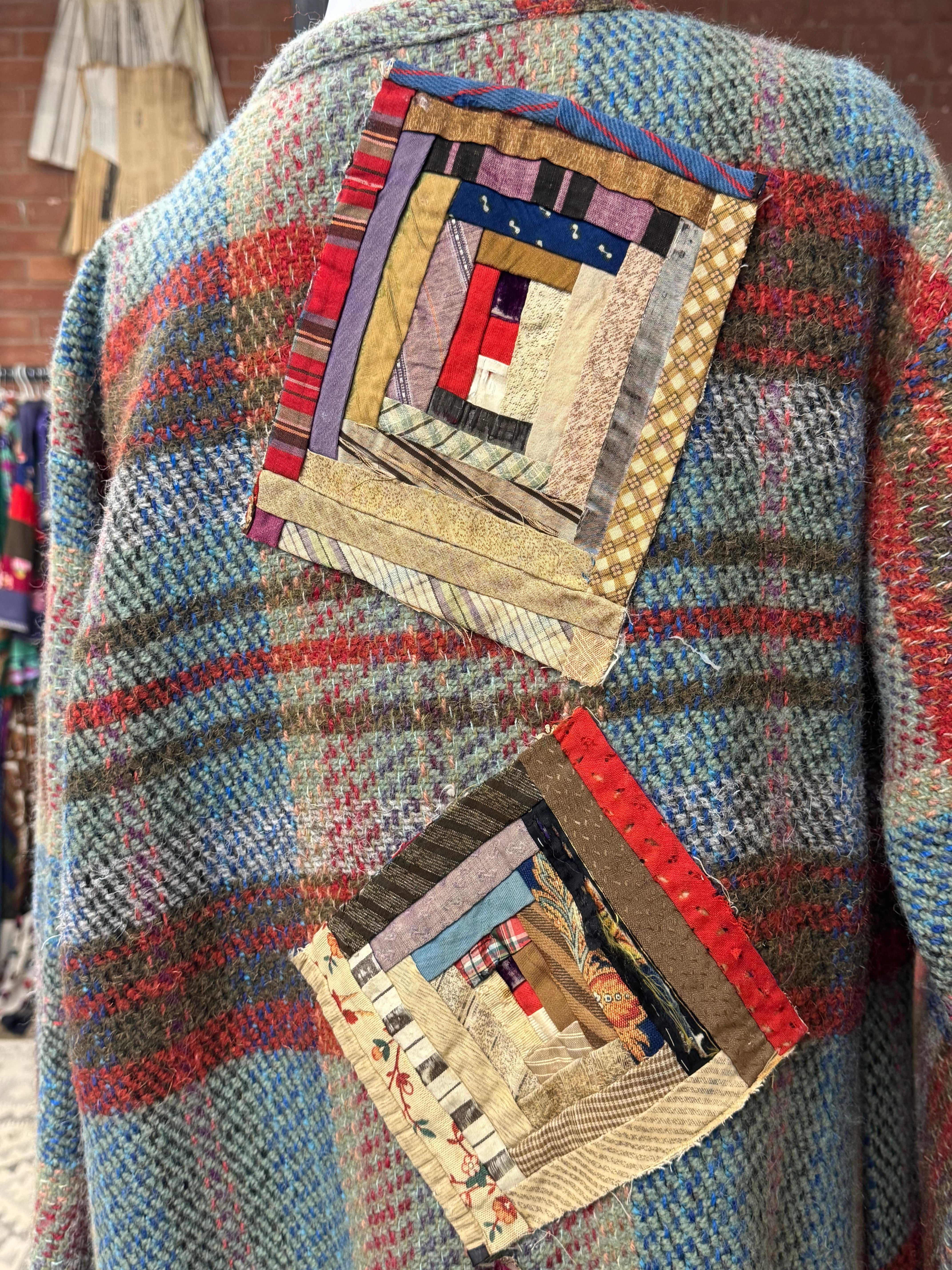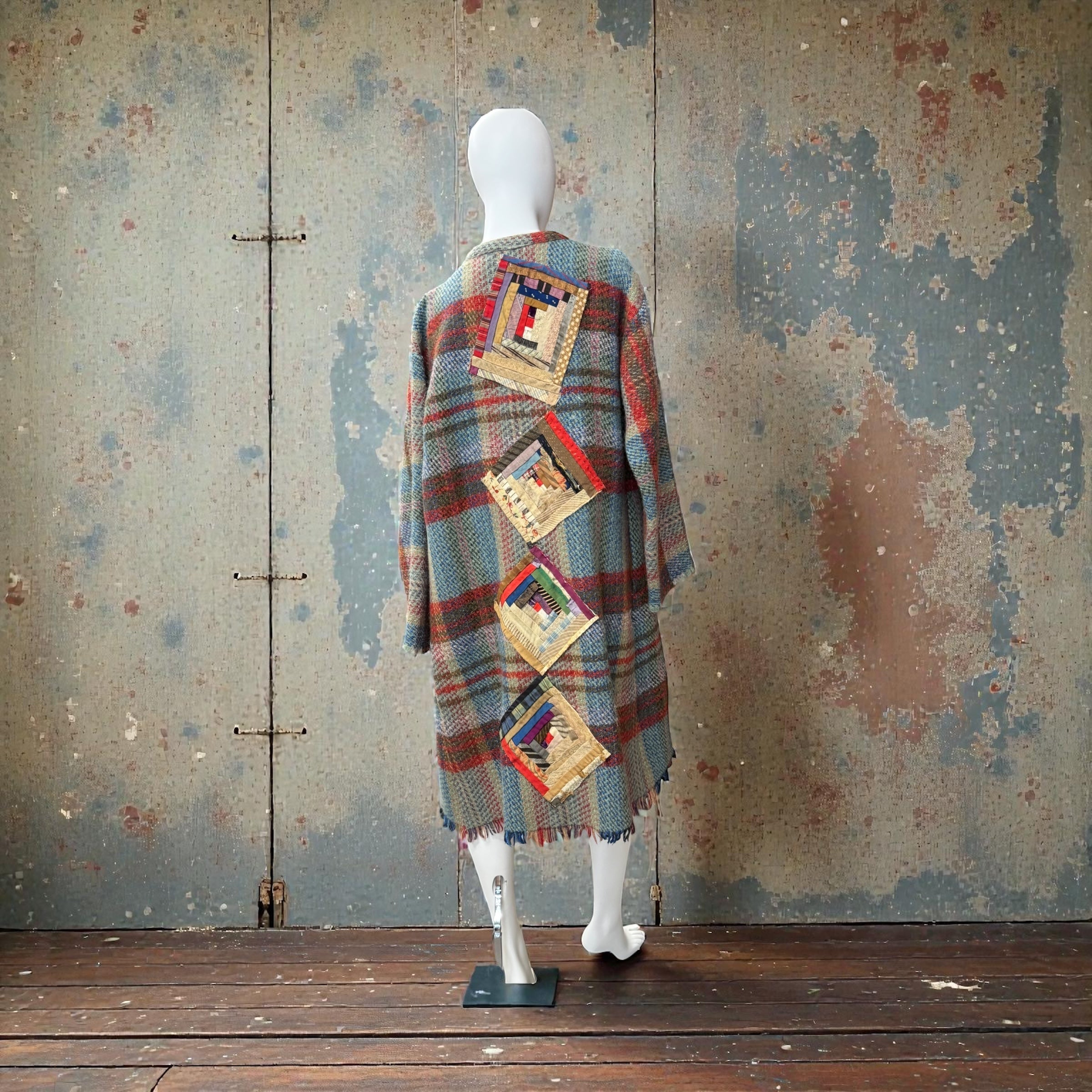 Kitty, reworked 70s blanket coat with Victorian patchwork samplers
