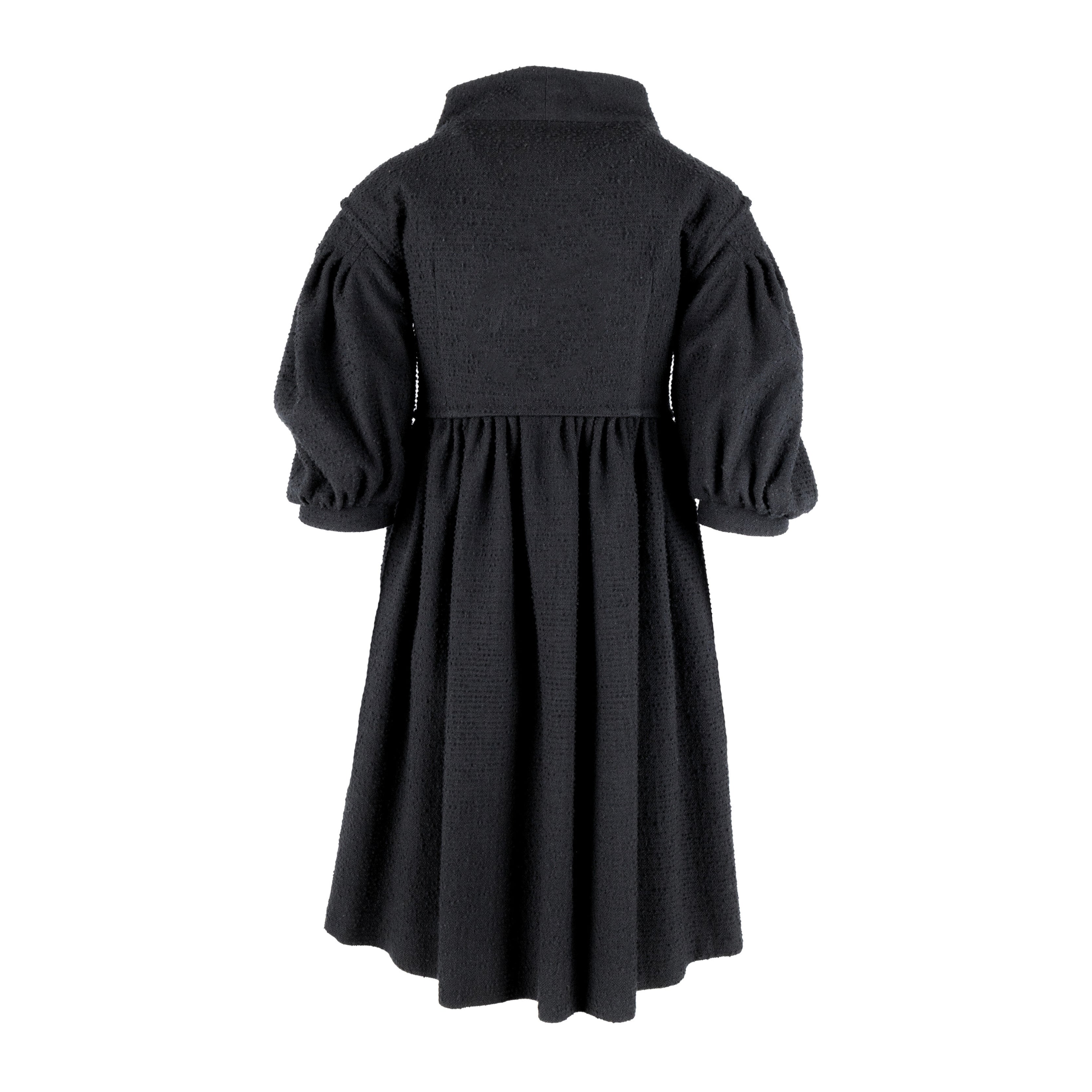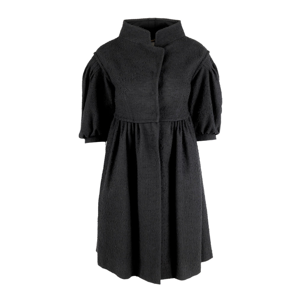 Crafted from a blend of virgin wool, the Moschino Balloon Sleeve Dress Coat boasts a textured finish and elegant balloon sleeves. The high neck collar and snap button closure add a touch of sophistication, while the pleated gathering at the waist creates a flattering and feminine silhouette.