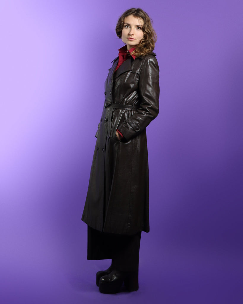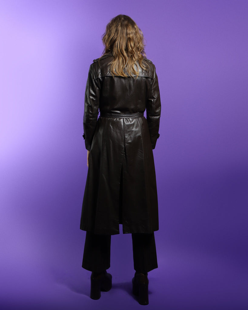 Beautiful vintage 1970s dark chocolate brown leather trench coat. Featuring a dramatic widespread lapel collar, shoulder and cuff tab detailing, integrated side pockets, storm shield style yoke panelling, a waist cinching tie belt & centre back vent for a flattering silhouette. Finished with matching acrylic buttons. Fully lined & butter soft leather- super chic coat in a timeless design. Immaculate condition.