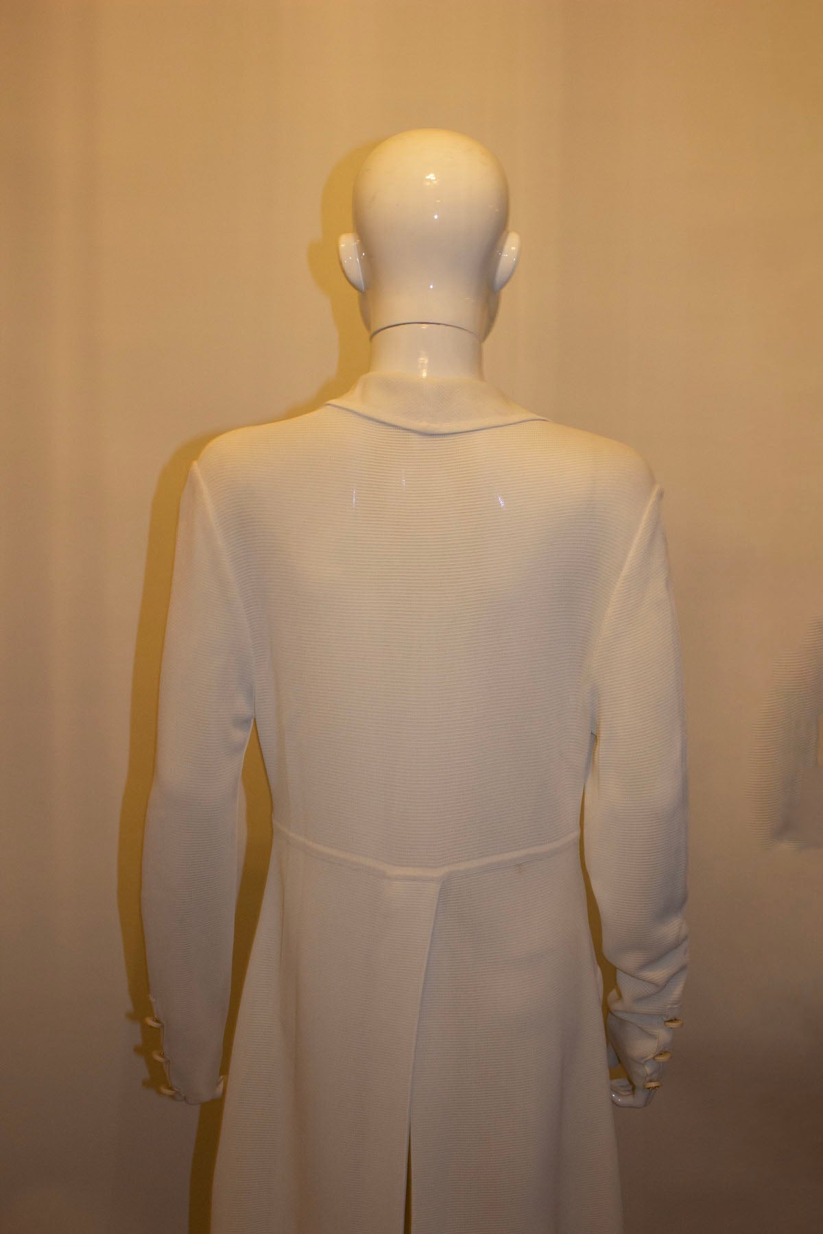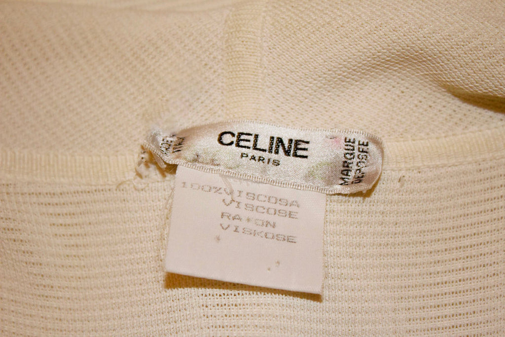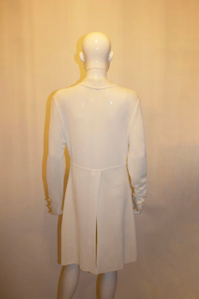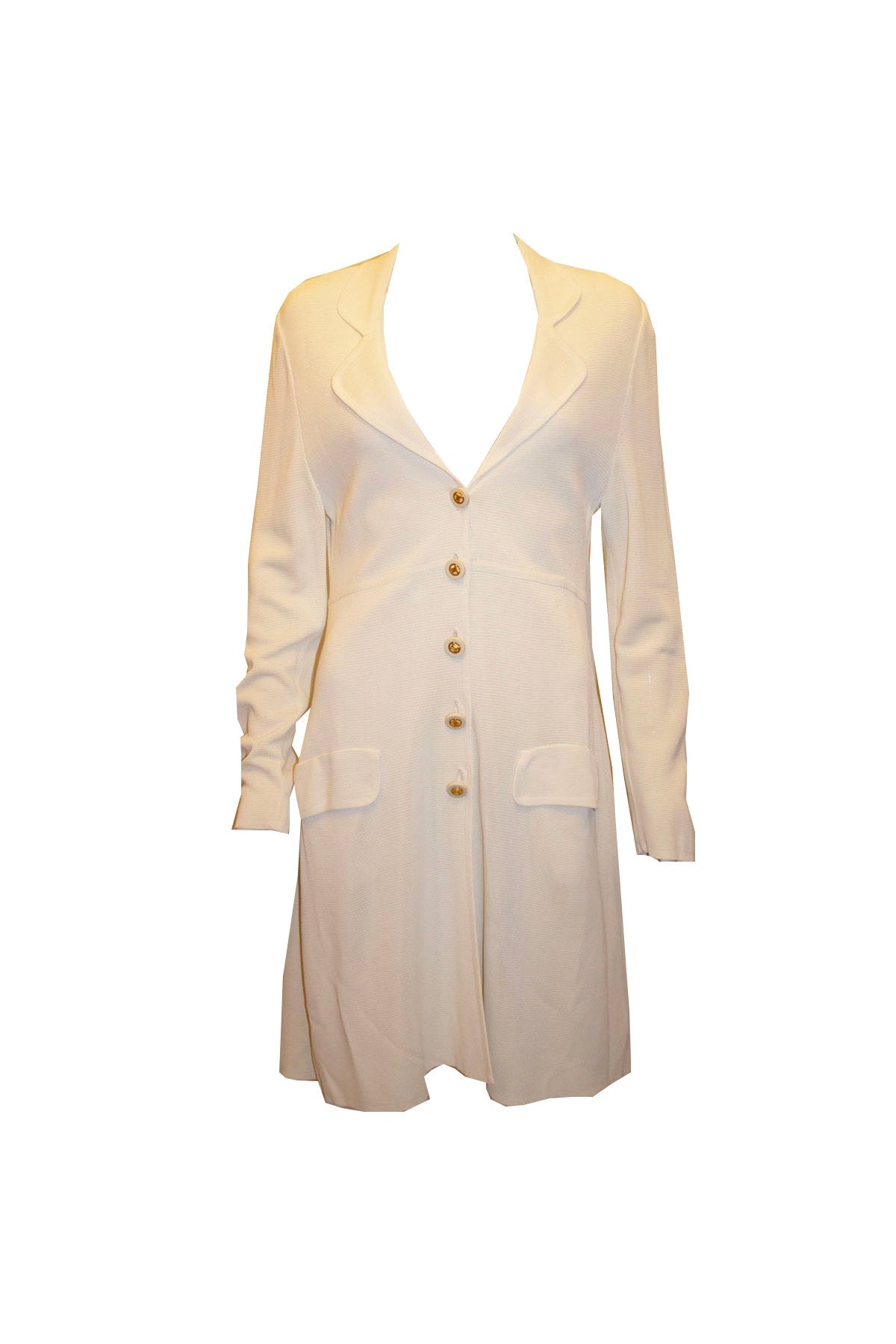 A super white vintage coat dress by Celine. The coat is made of a heavy viscose and hangs beautifully , and has all the original buttons. It has a cut away collar, 2 flap pockets on the front and a 22'' slit at the back. The coat is unlined.