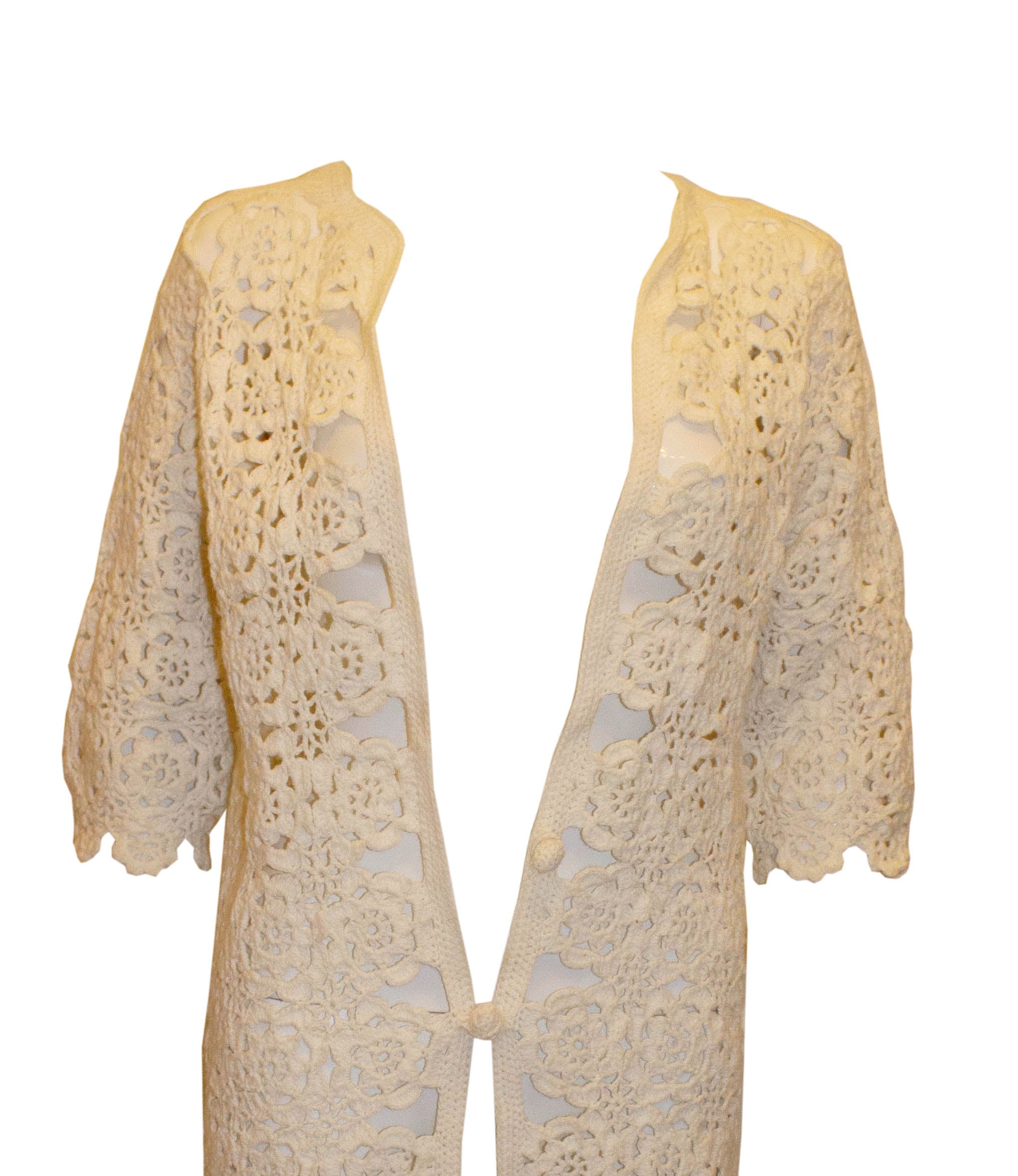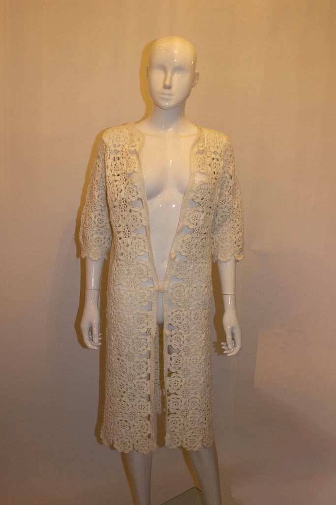A stunning vintage white crochet coat, ideal for the Summer season, It has elbow length sleaves and a three button front fastening.