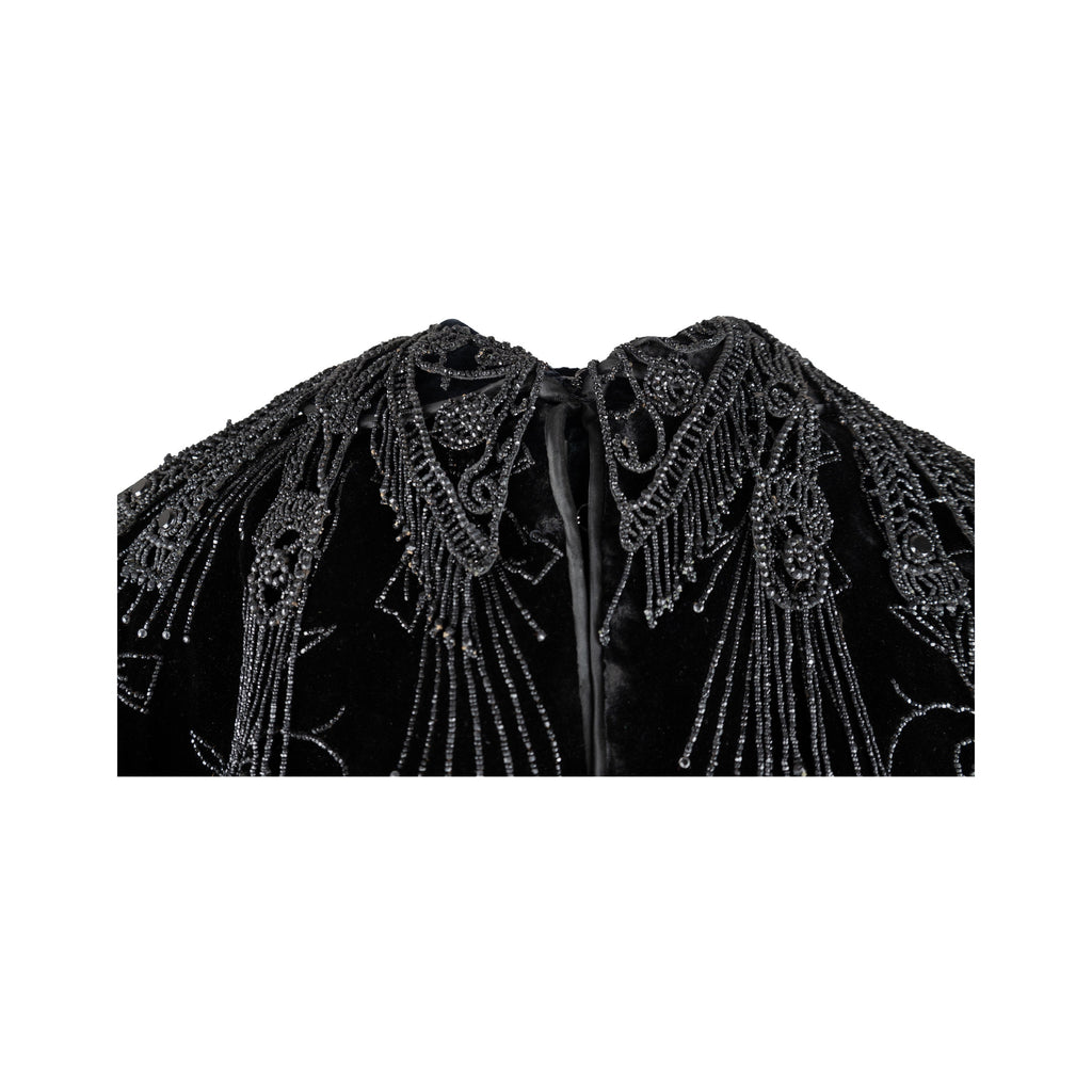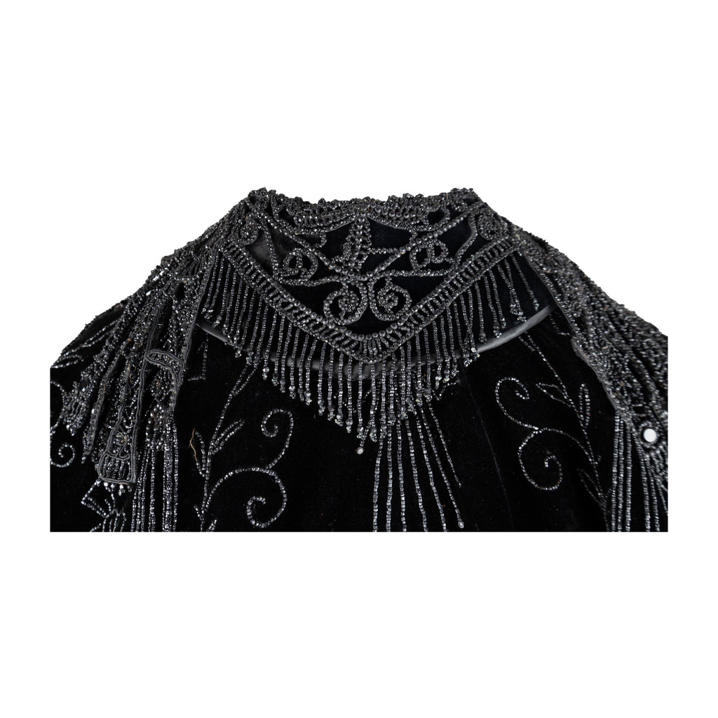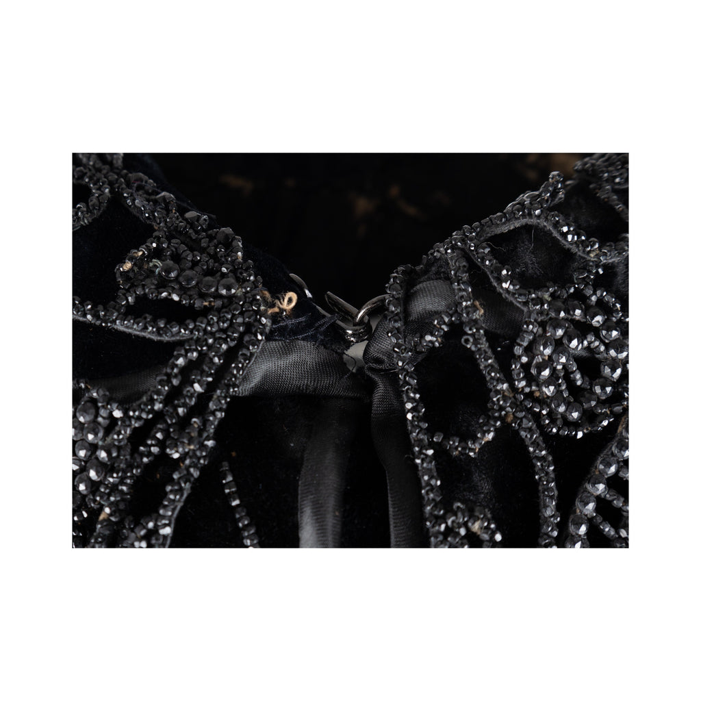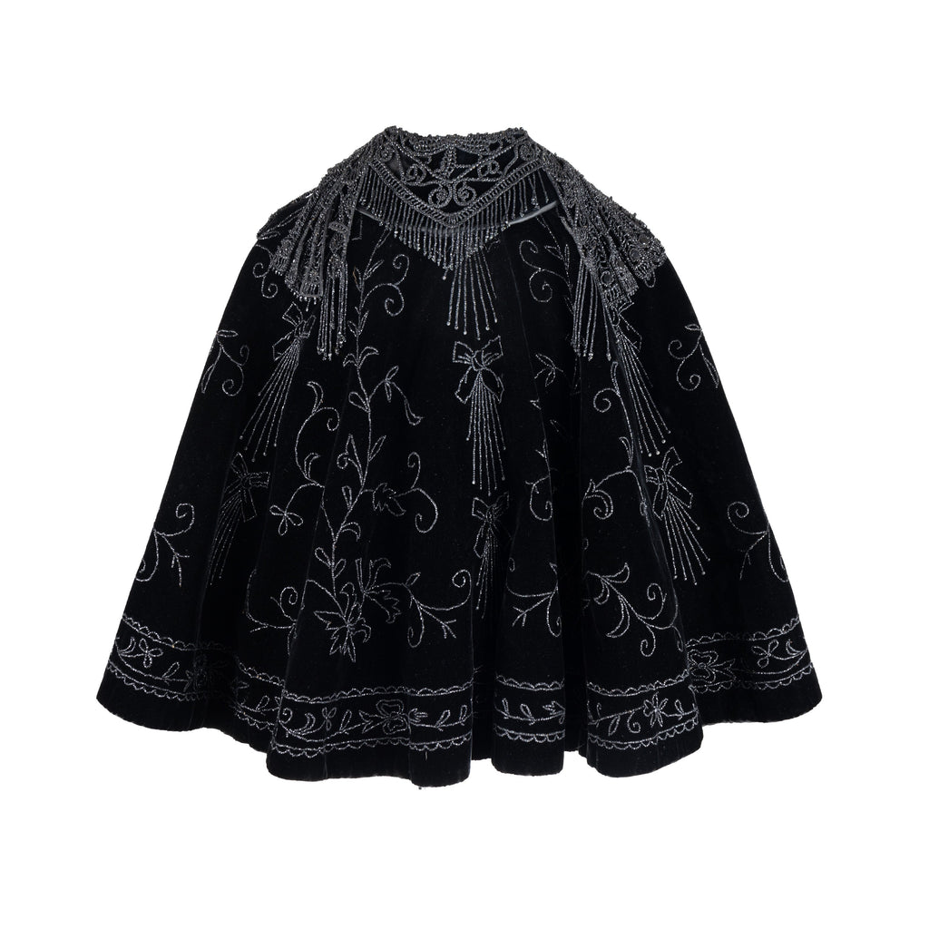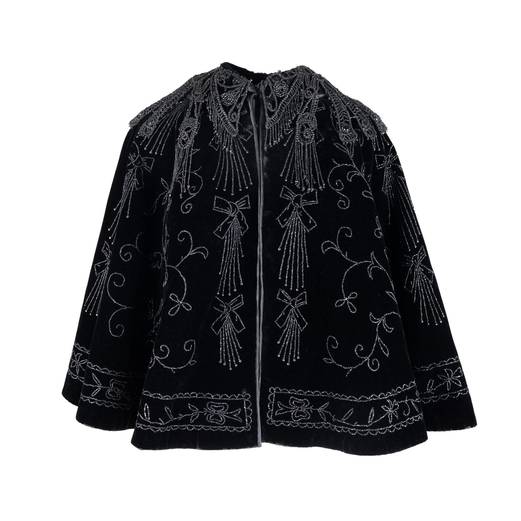 This short cape is a stunning vintage-inspired piece crafted from black velvet. Finely embroidered with shimmer threads and a show-stopping collar with intricate cut-out detailing, this cape is sure to make a statement. A perfect way to add an extra level of drama to your look.