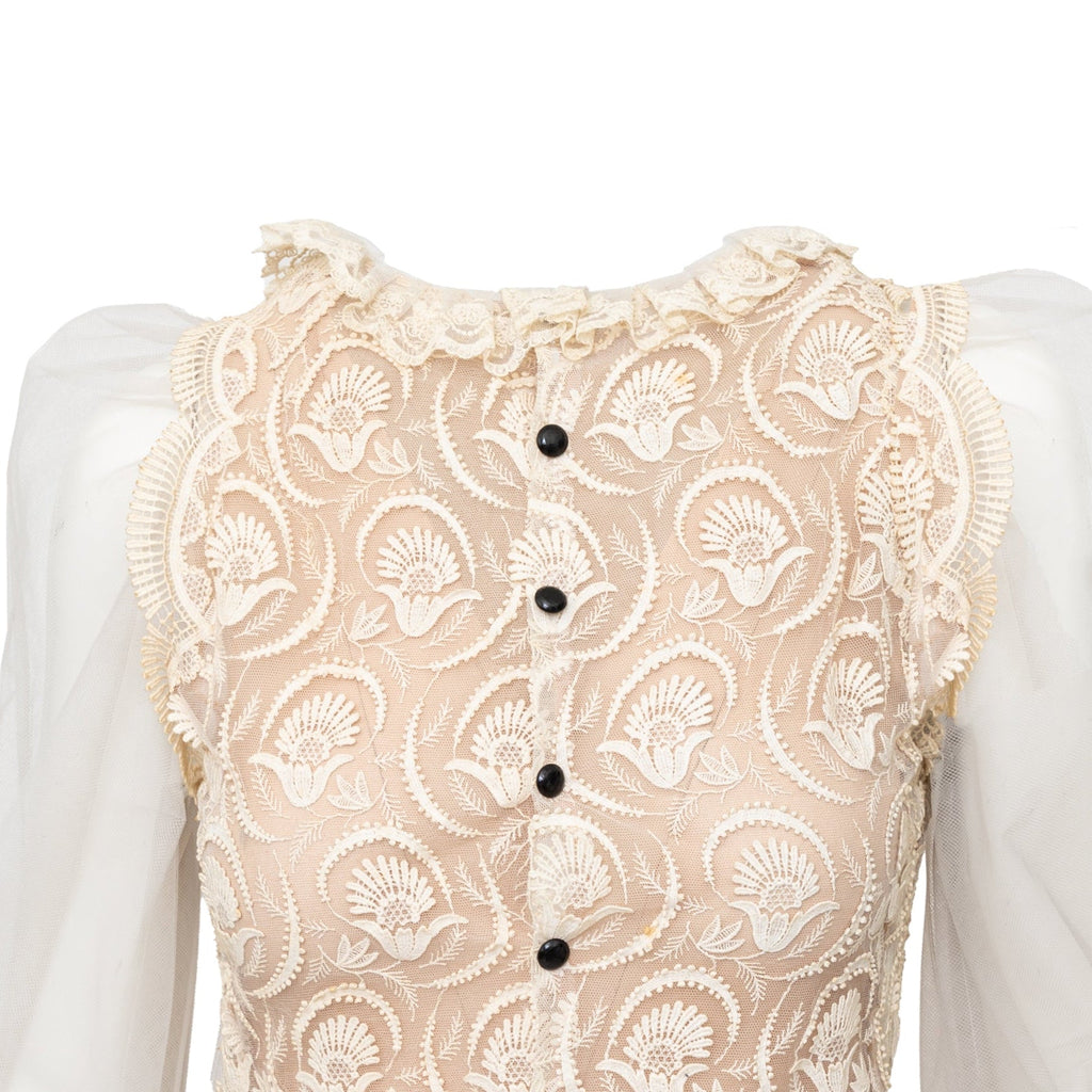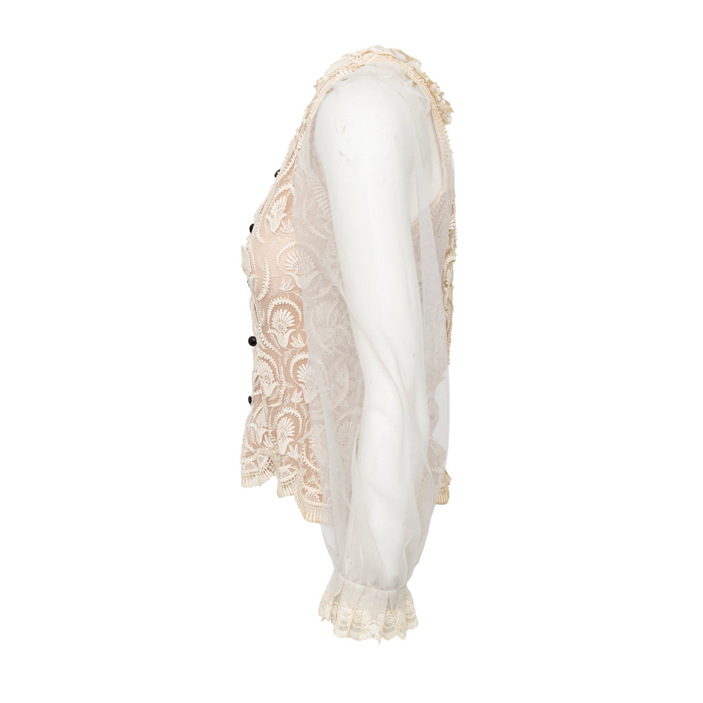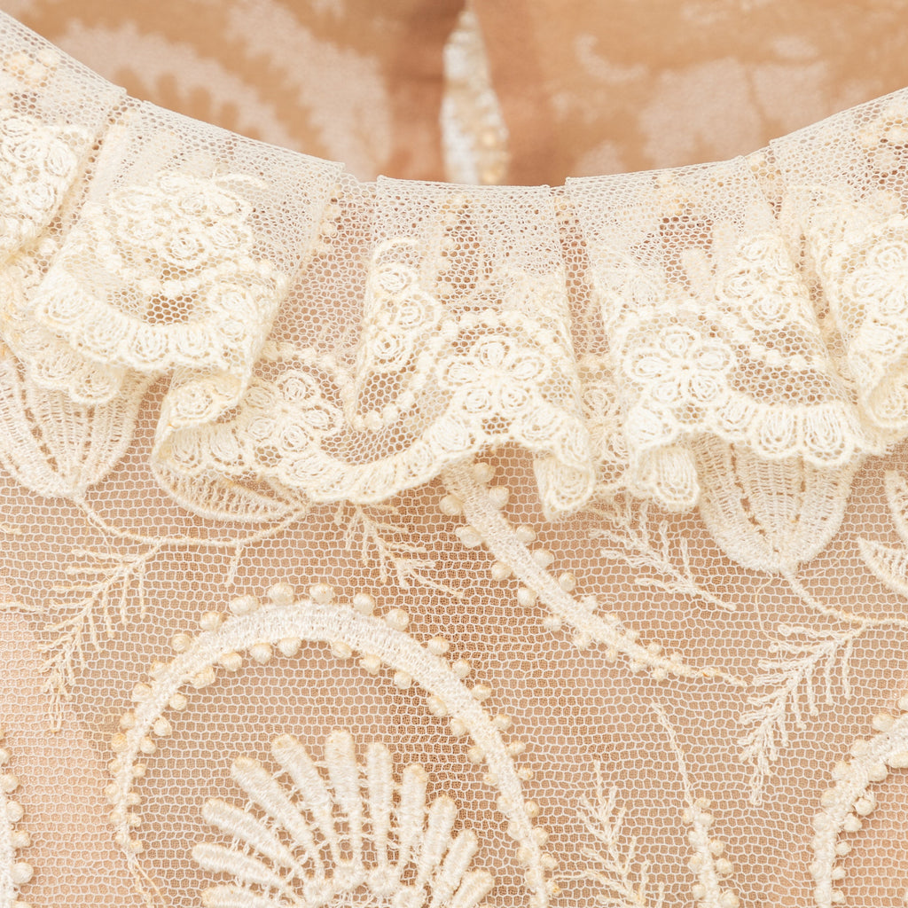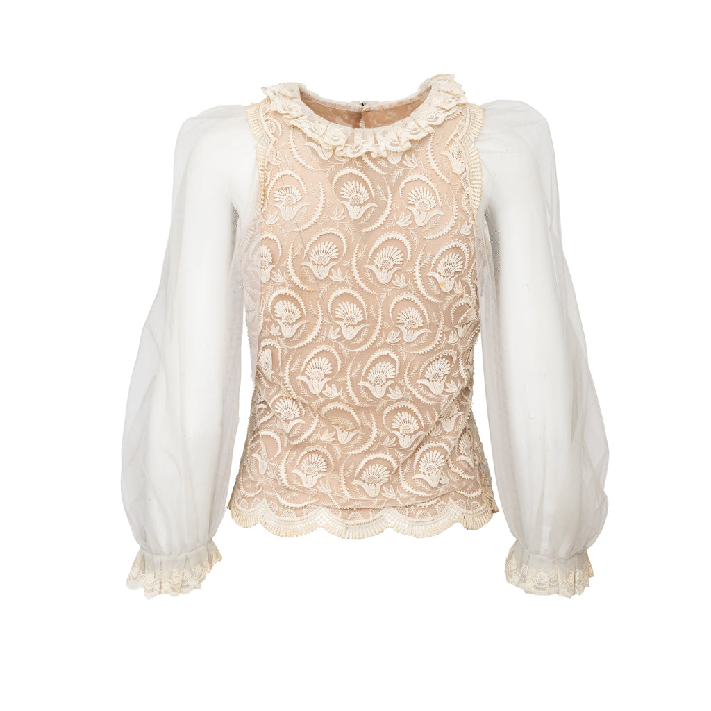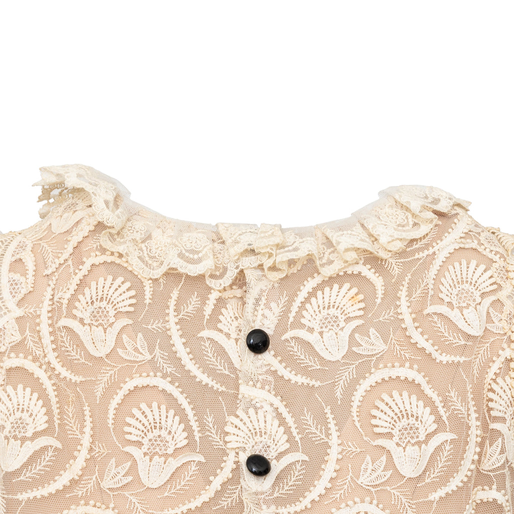 Made out of fine beige mesh and pale lace fabric, this romantic top features a round neck collar and is adorned with charming ruffle details in certain sections.