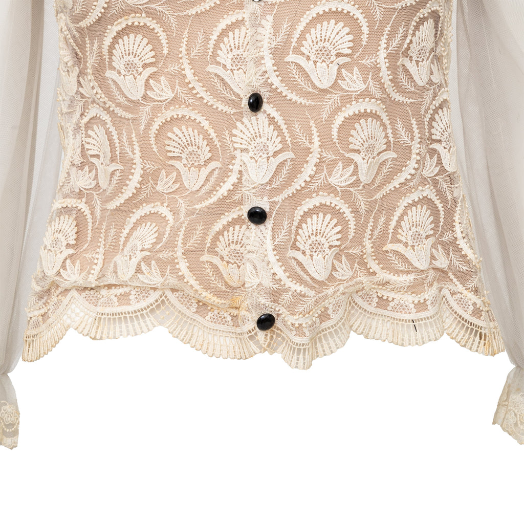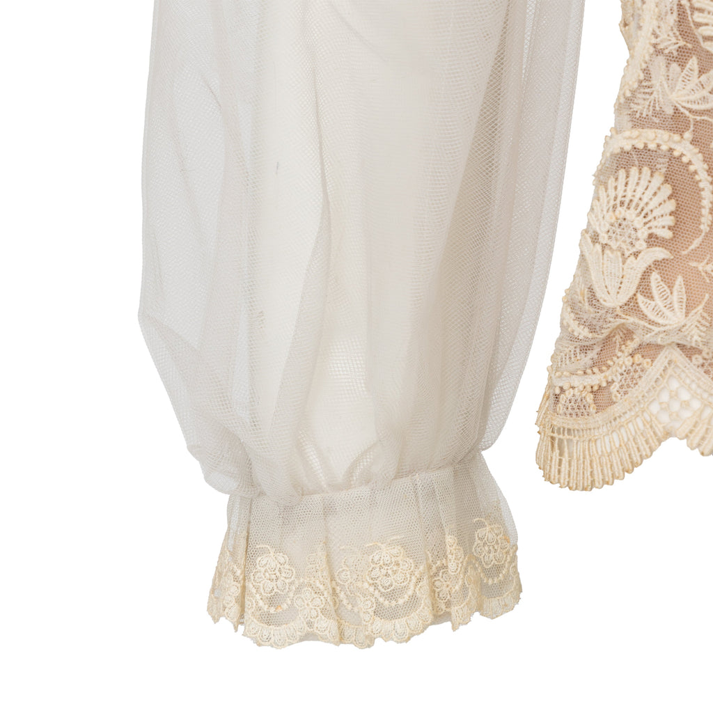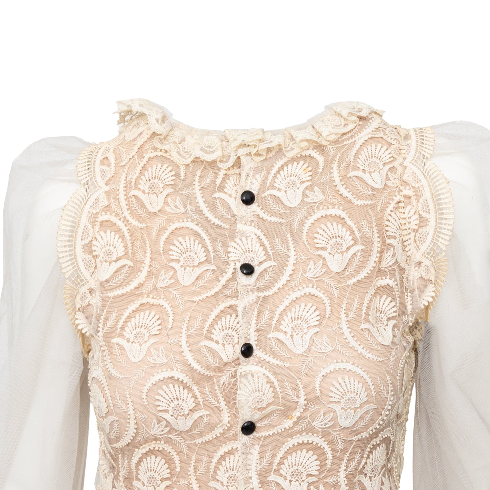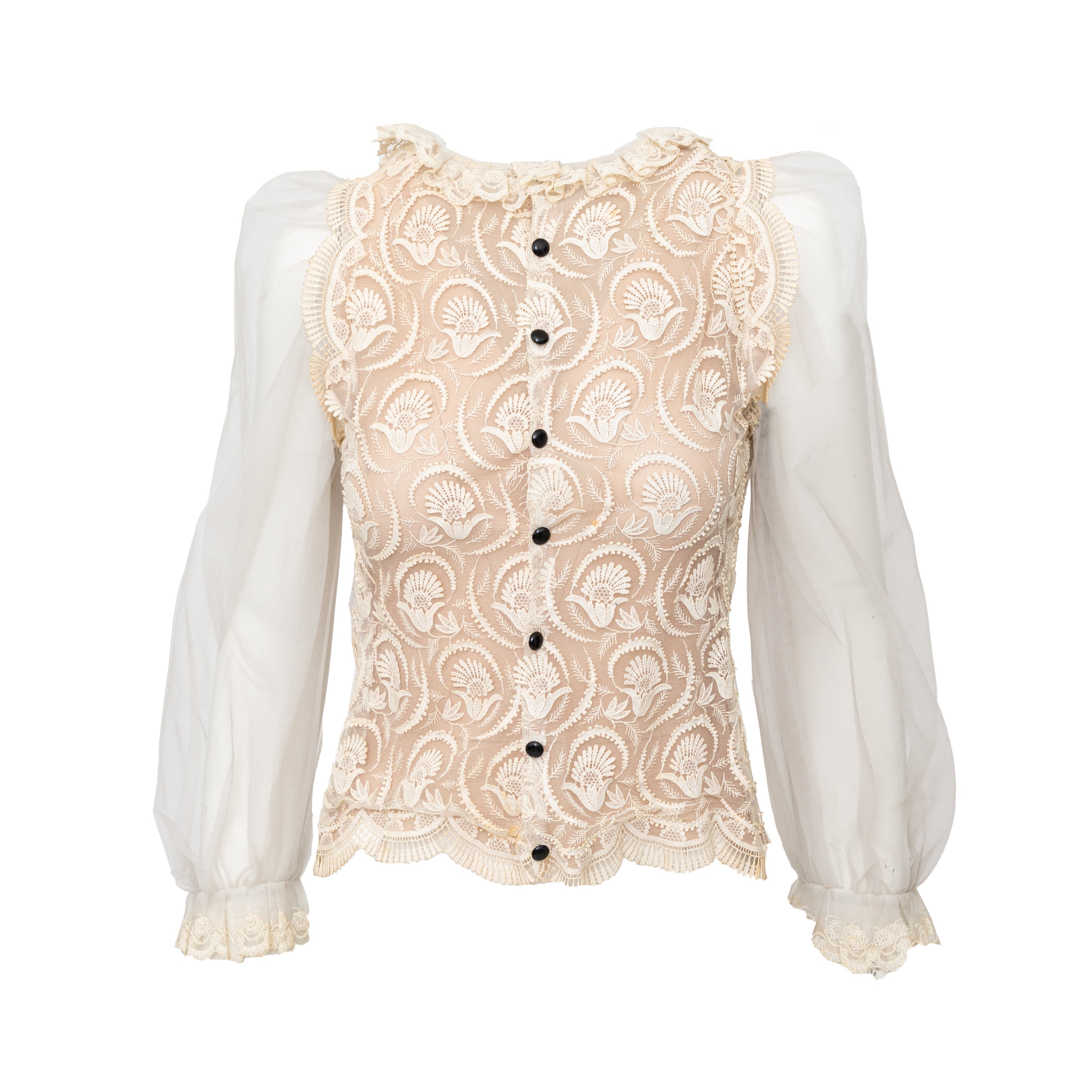 Made out of fine beige mesh and pale lace fabric, this romantic top features a round neck collar and is adorned with charming ruffle details in certain sections.