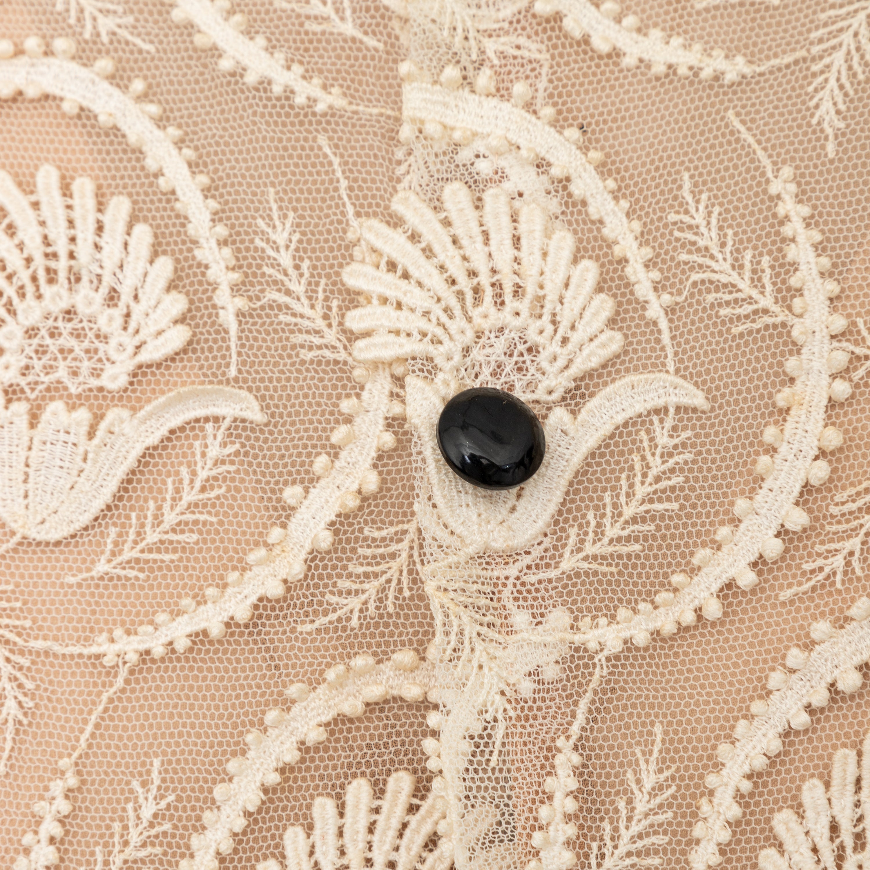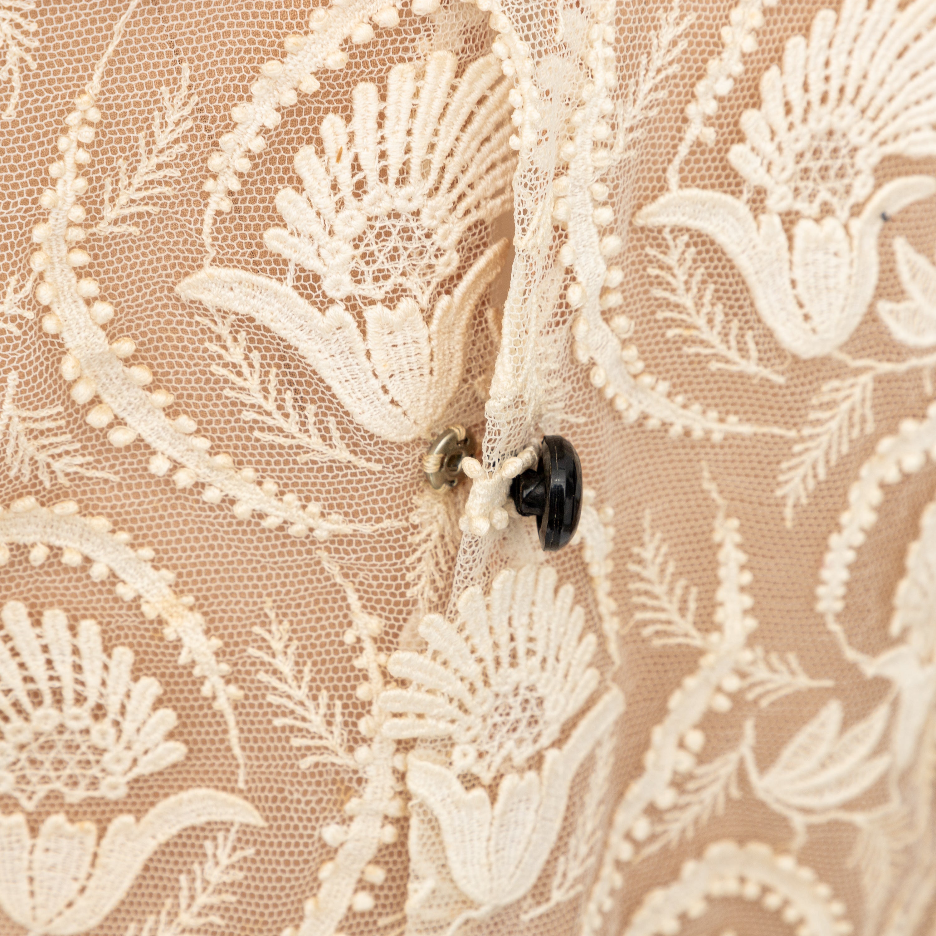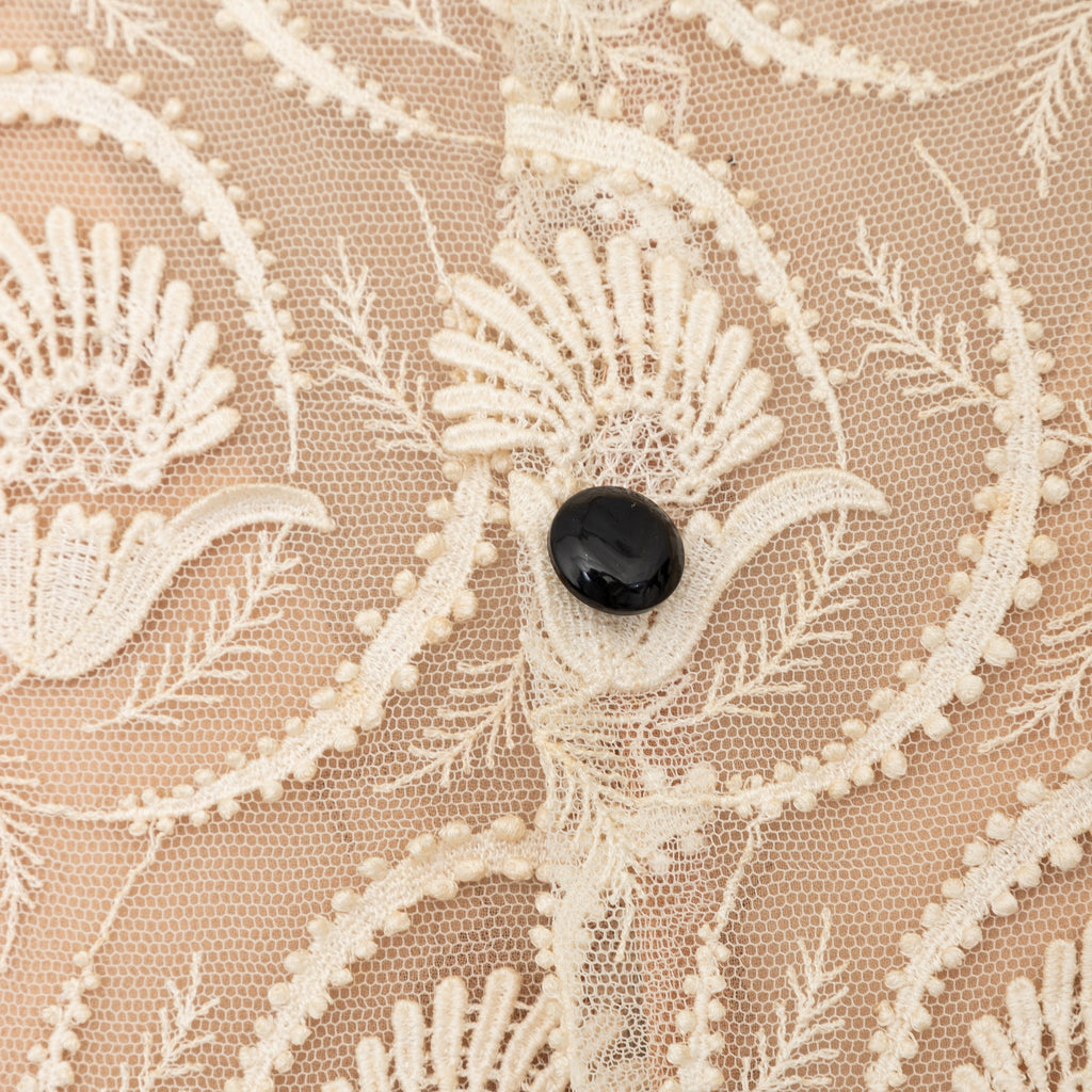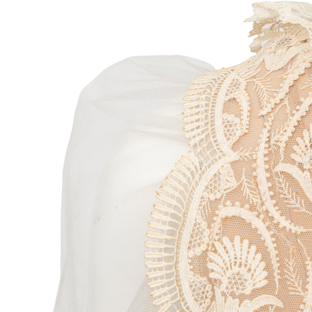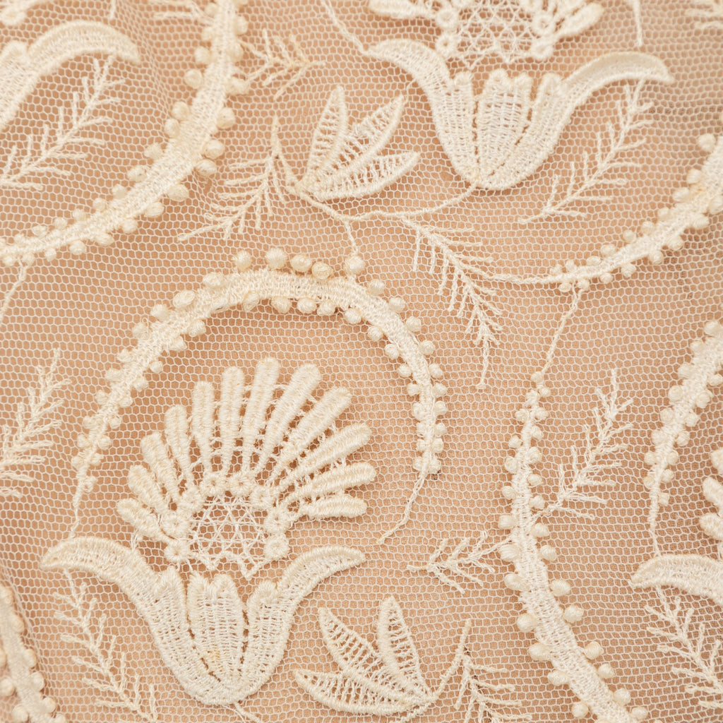 Made out of fine beige mesh and pale lace fabric, this romantic top features a round neck collar and is adorned with charming ruffle details in certain sections.