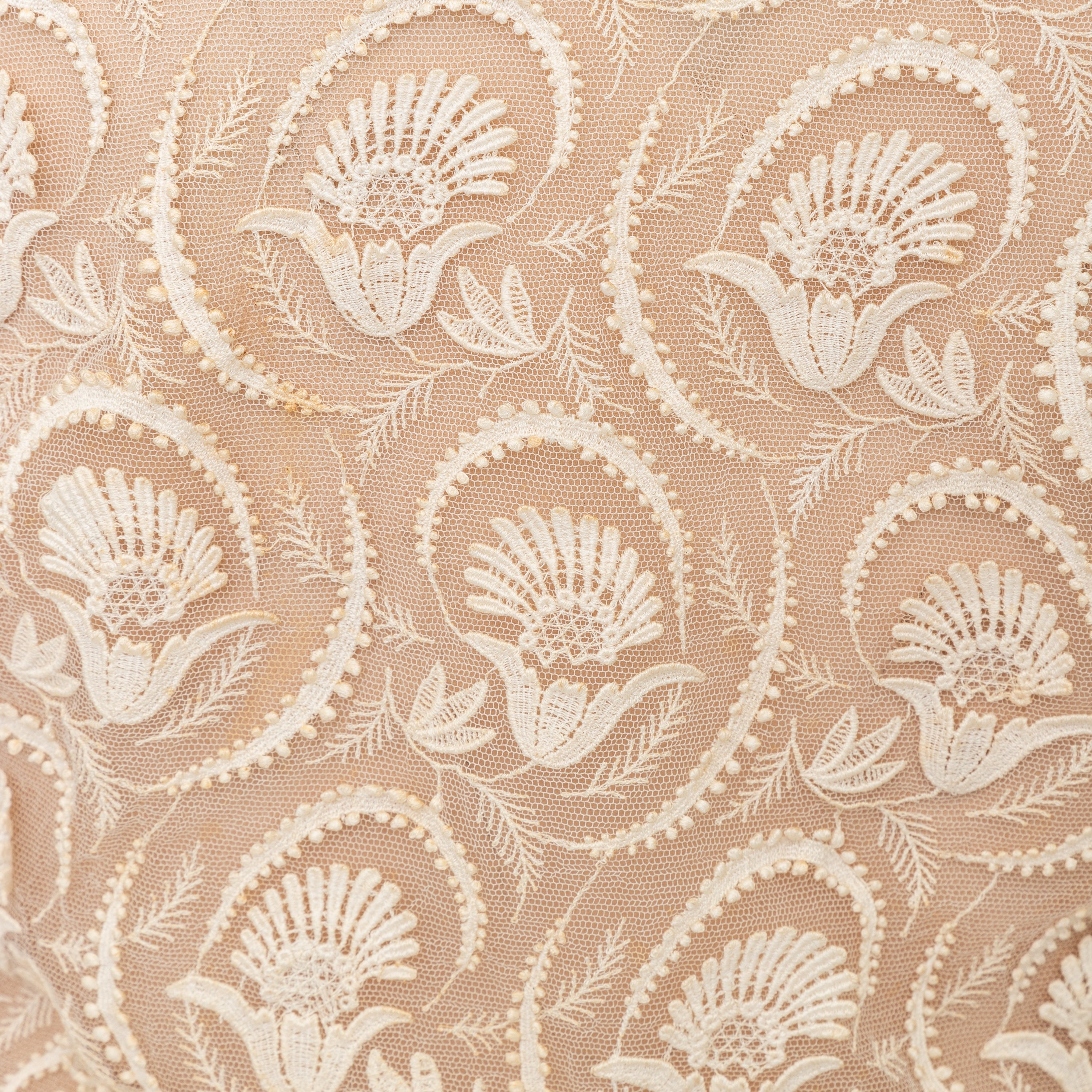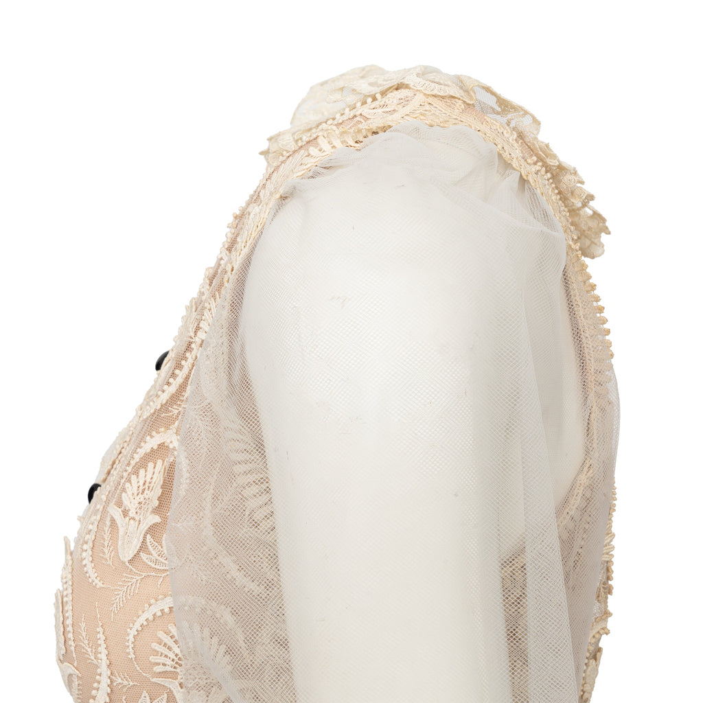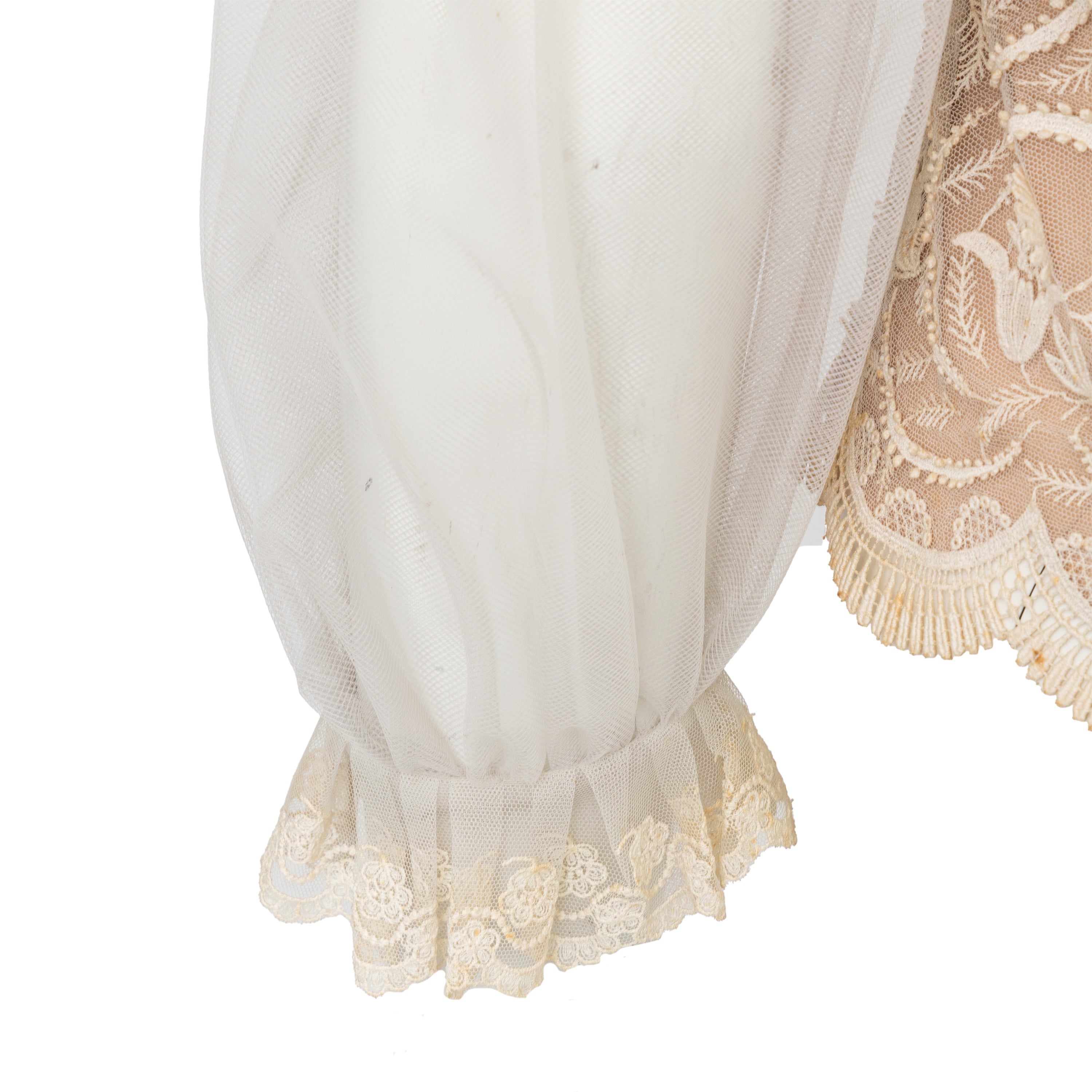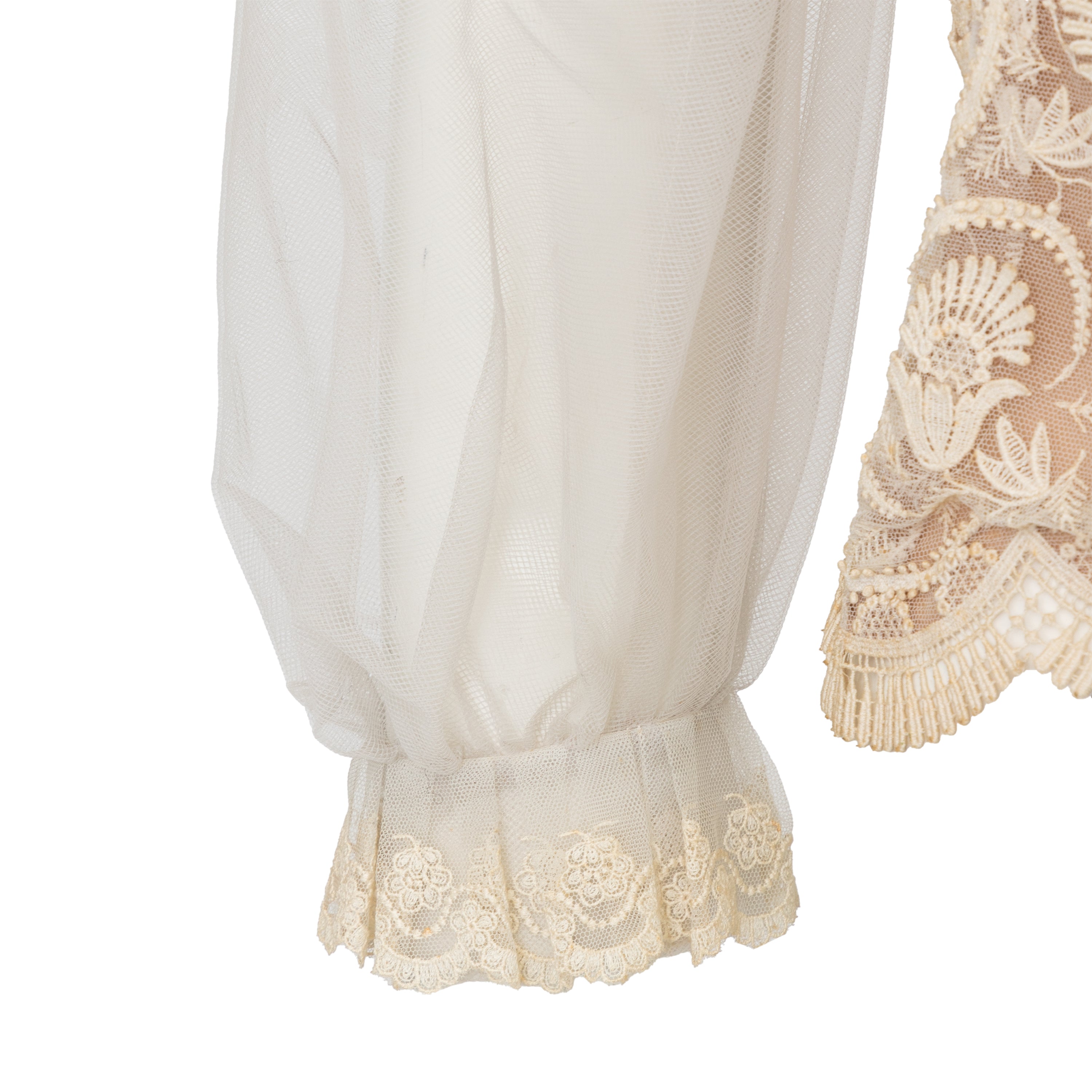 Made out of fine beige mesh and pale lace fabric, this romantic top features a round neck collar and is adorned with charming ruffle details in certain sections.