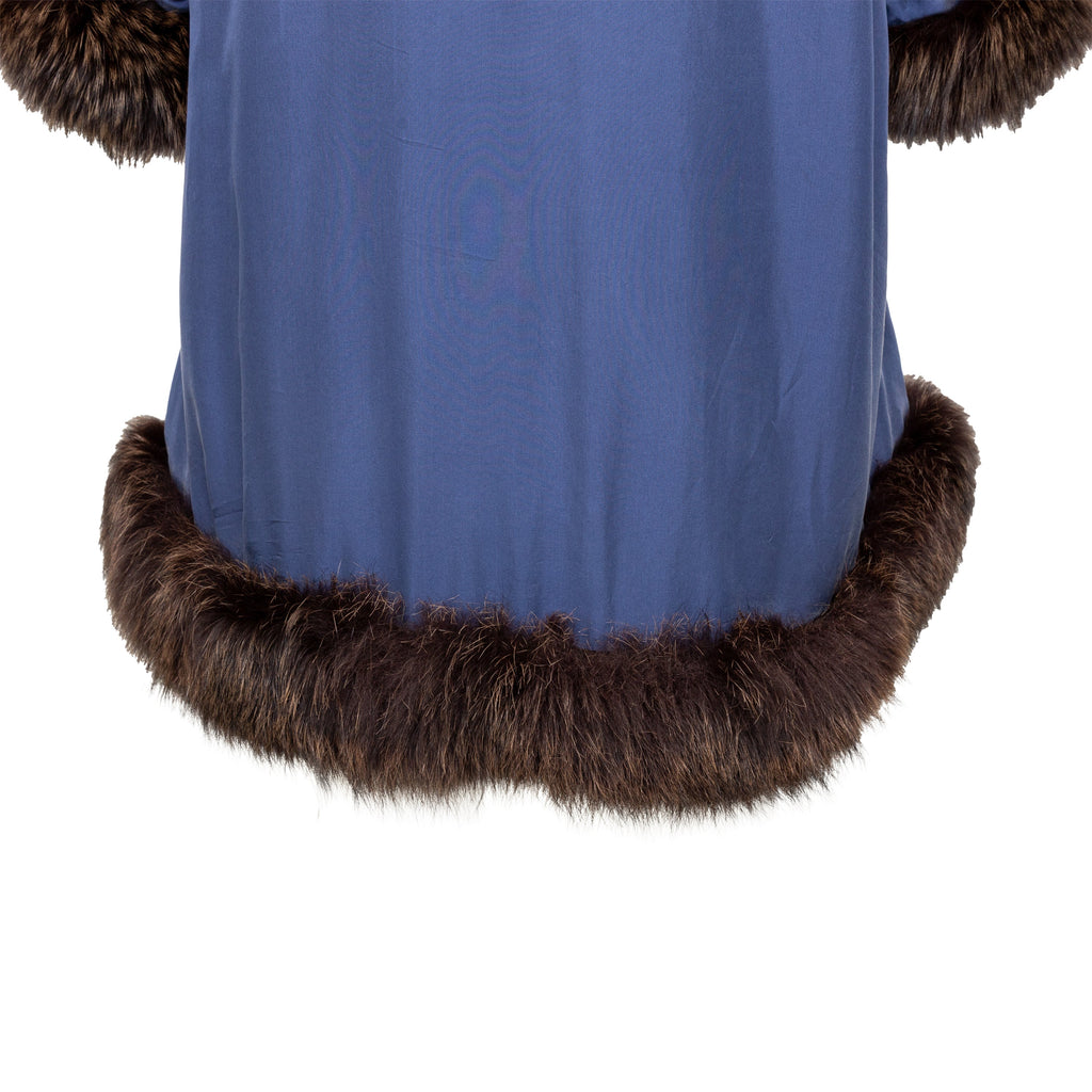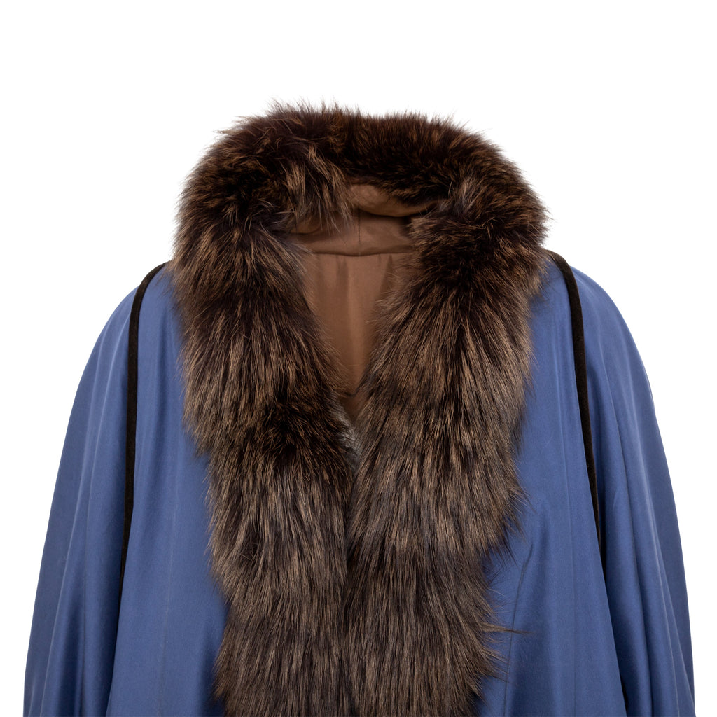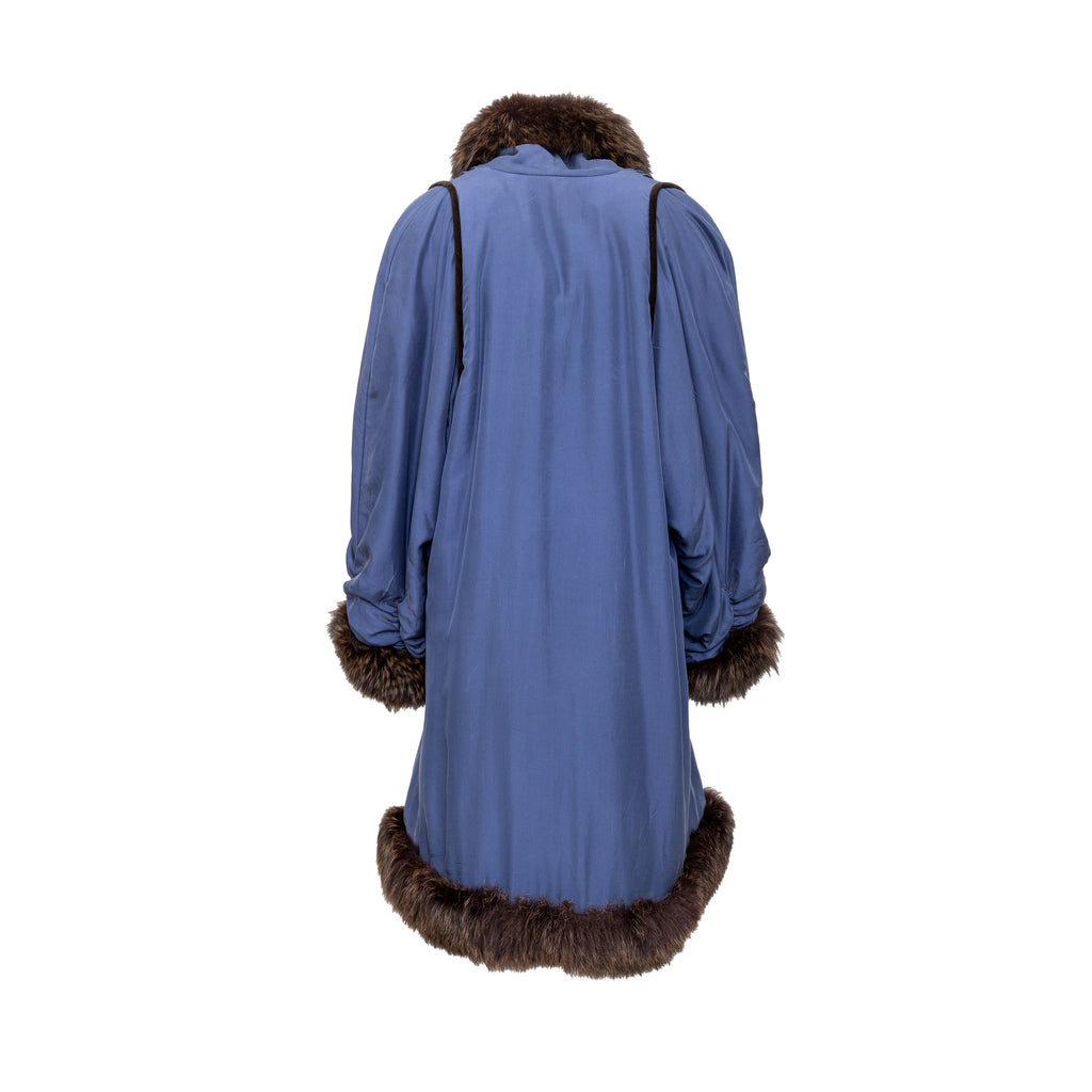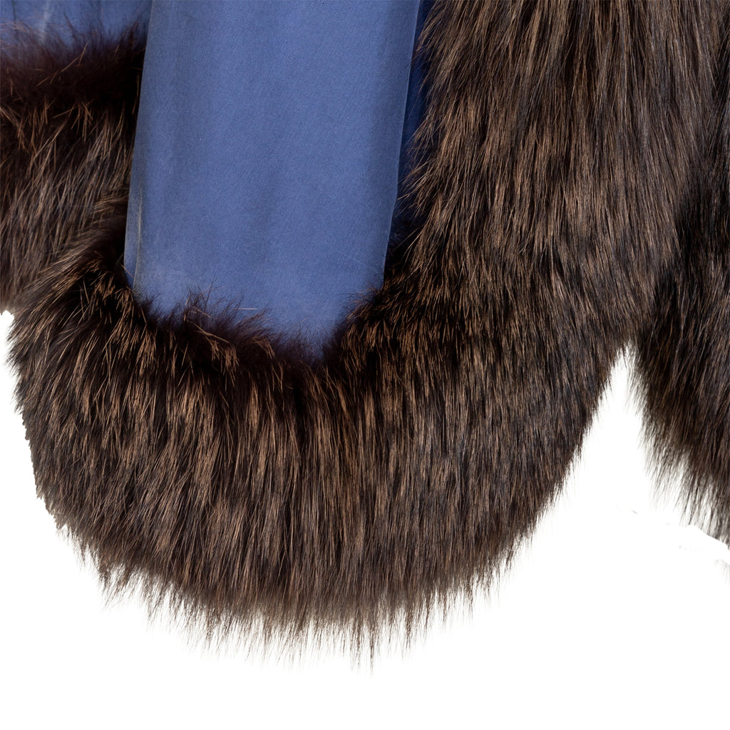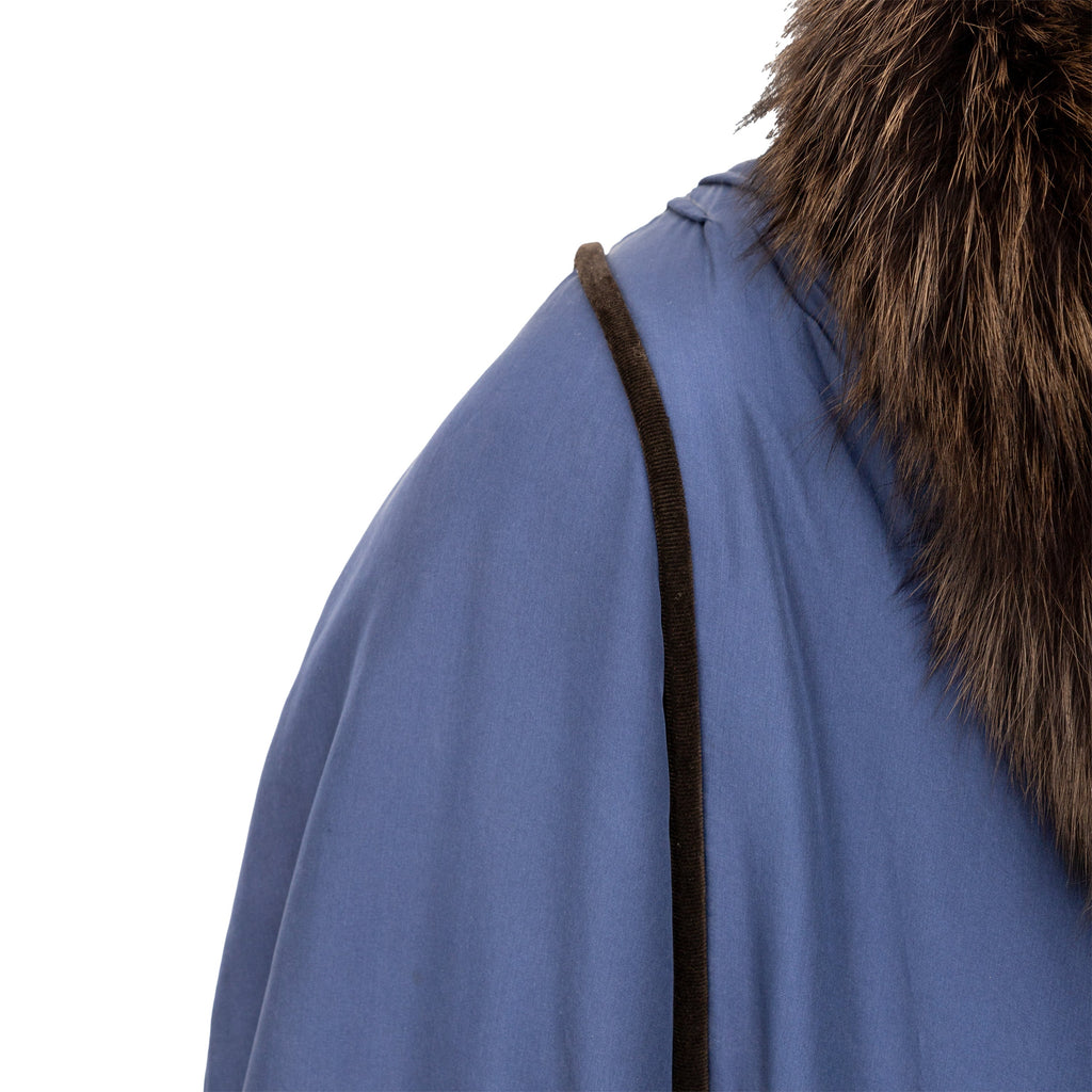 Upgrade your winter wardrobe with our Collection Privée Open Front Coat. This vintage inspired long coat boasts a soft blue fabric and warm down insulation, complemented by luxurious brown fur trim.
