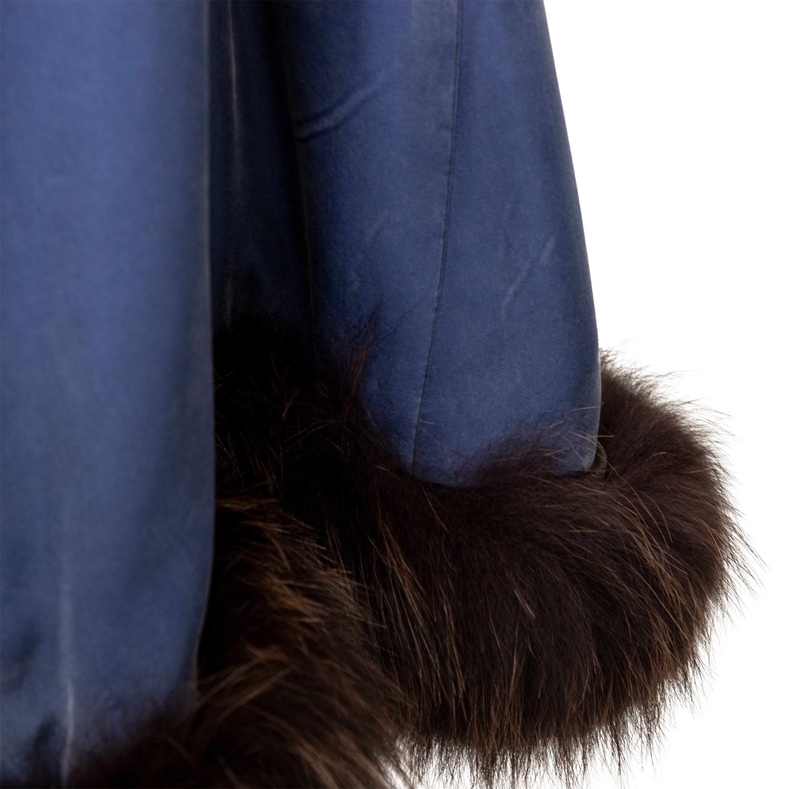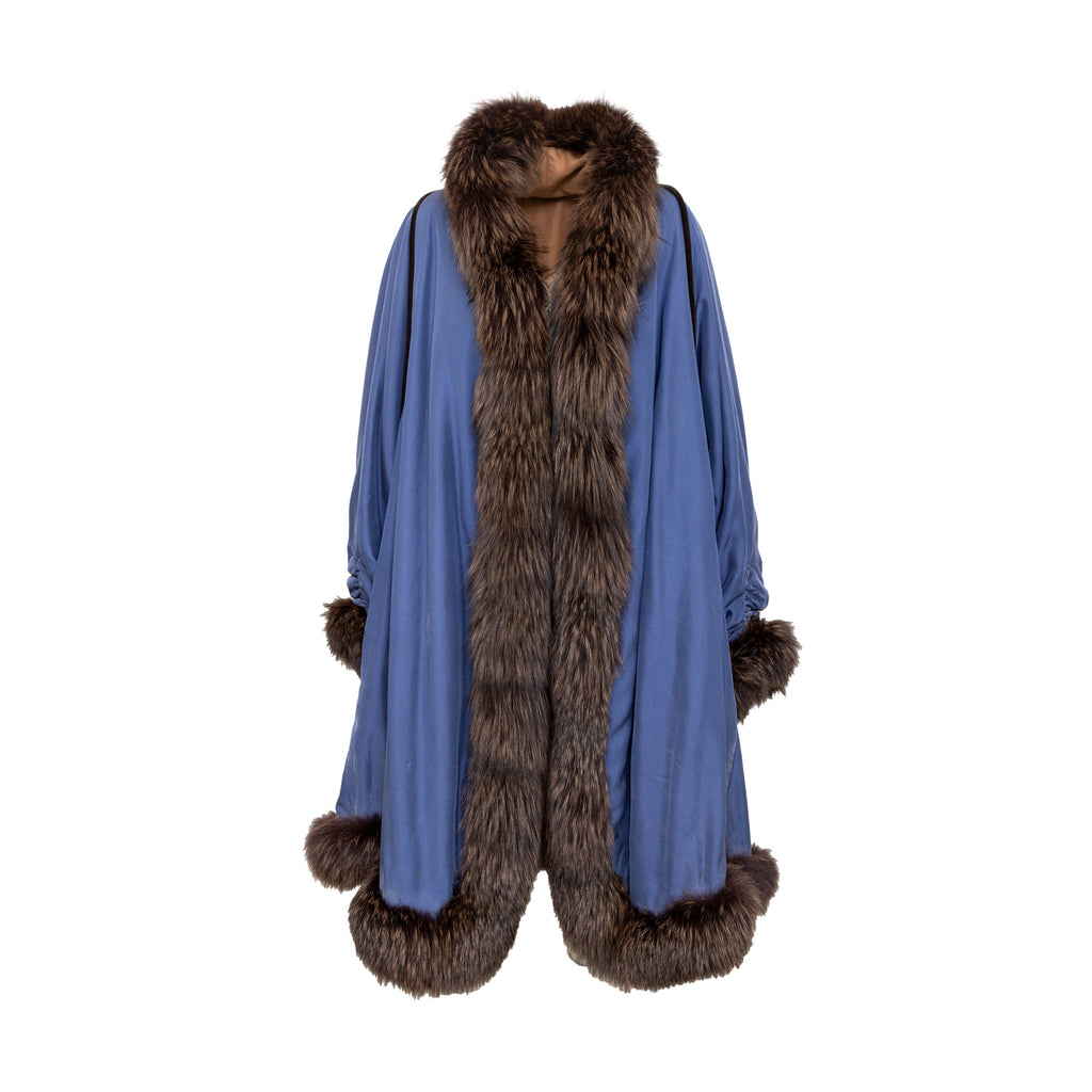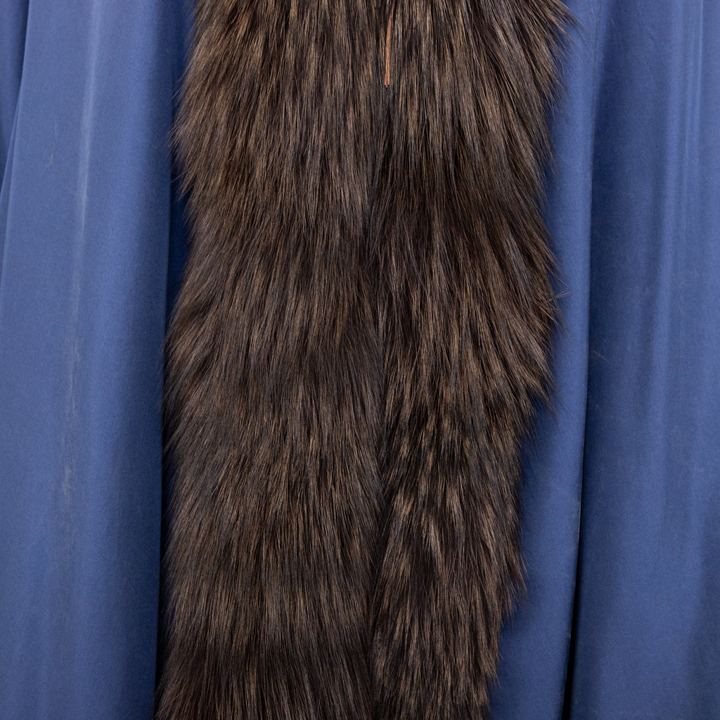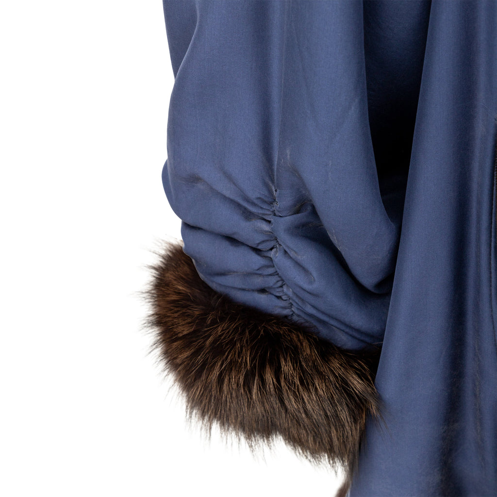 Upgrade your winter wardrobe with our Collection Privée Open Front Coat. This vintage inspired long coat boasts a soft blue fabric and warm down insulation, complemented by luxurious brown fur trim.